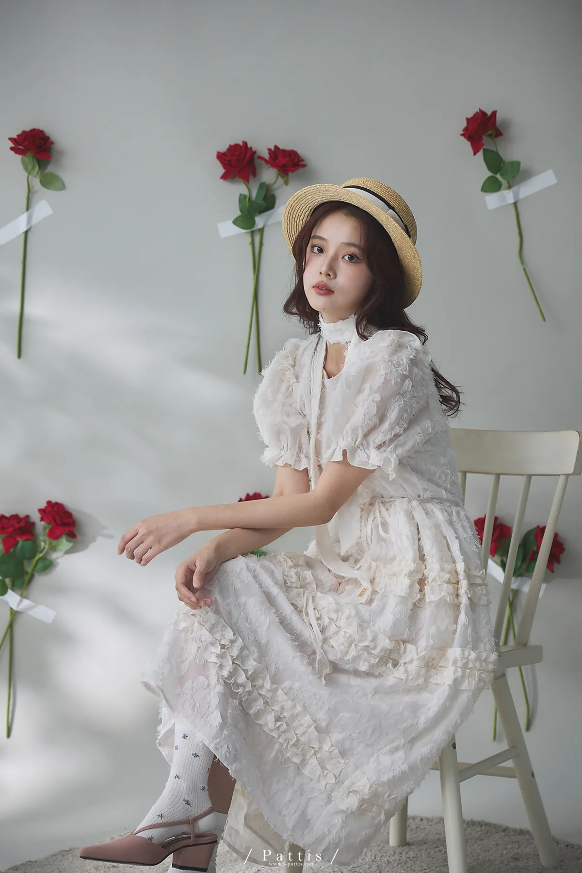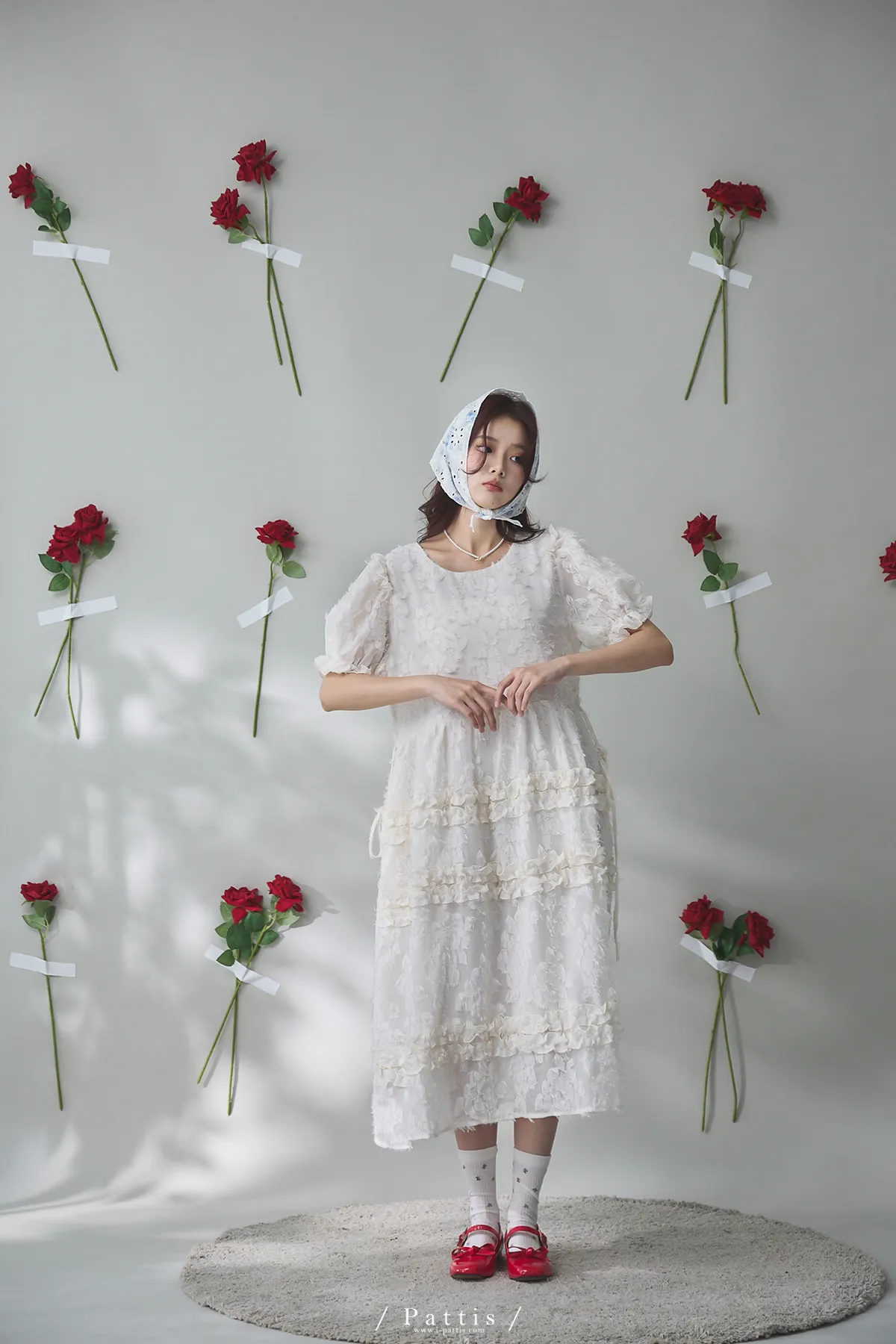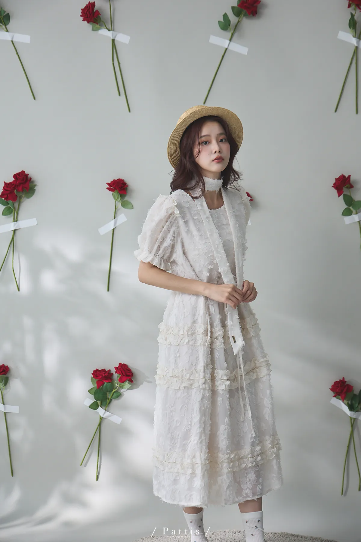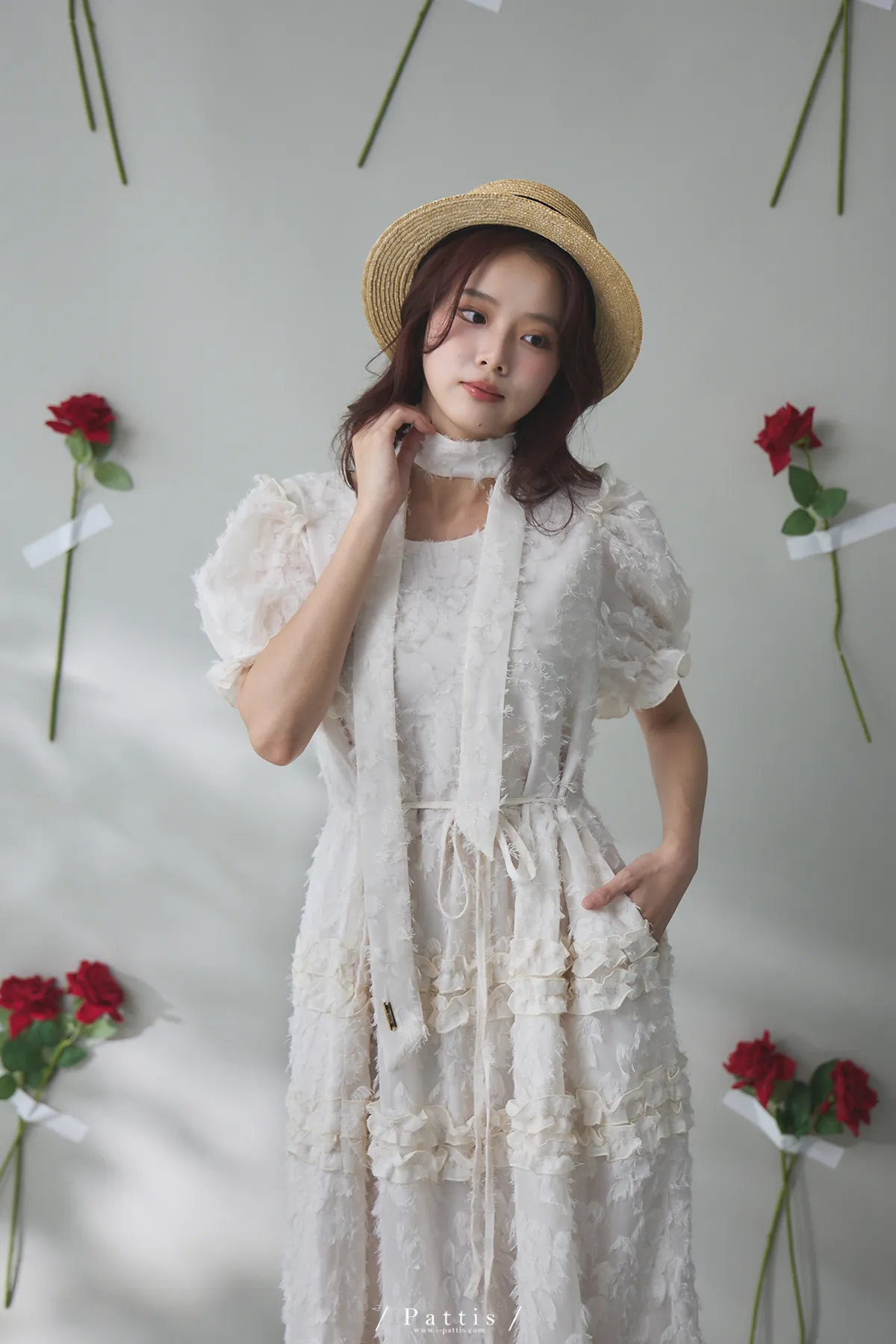 摘一朵花作為簽名檔 | 羽毛浮雕印花蓬袖綁帶荷葉洋裝(白晝月光)
