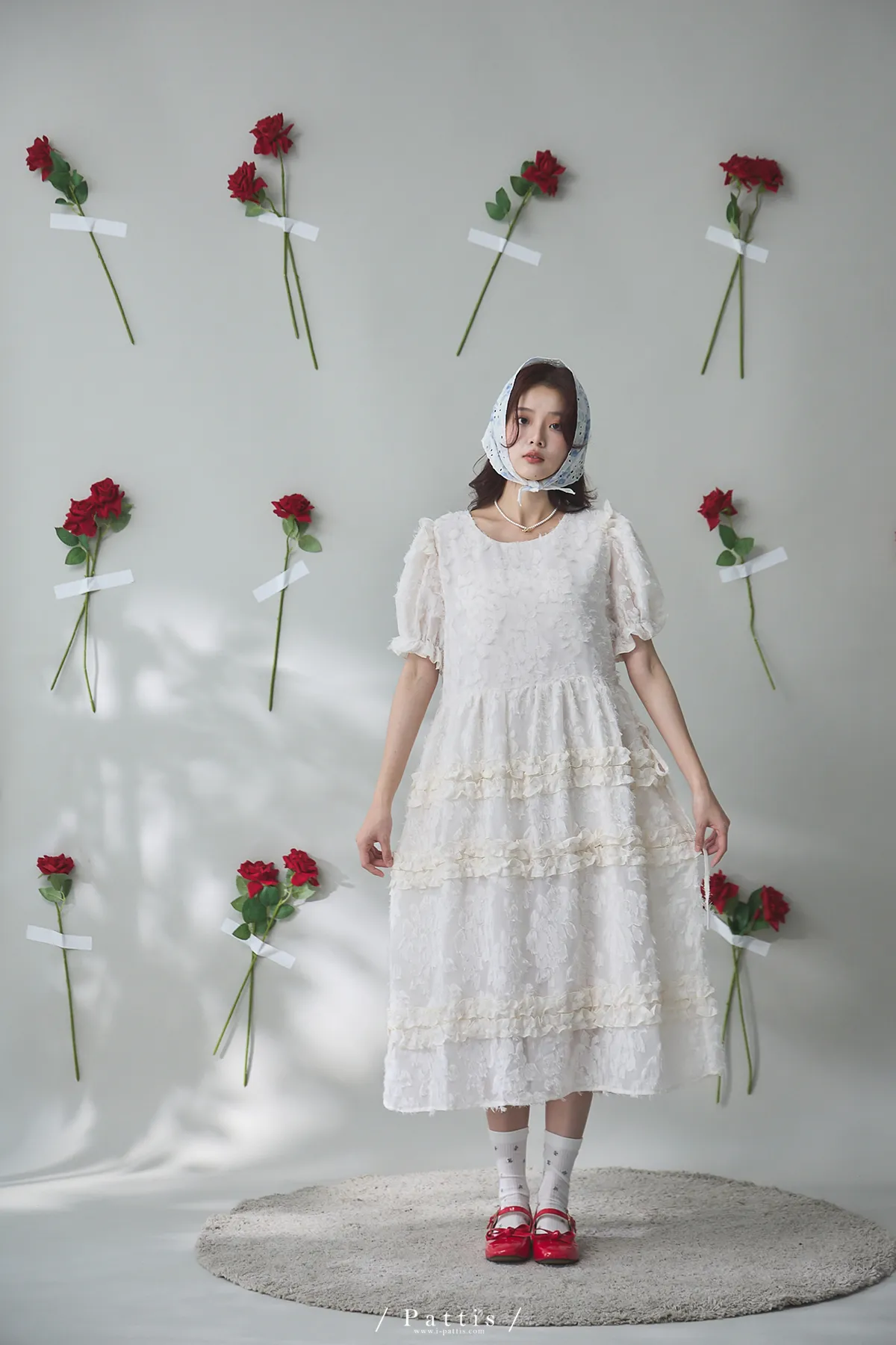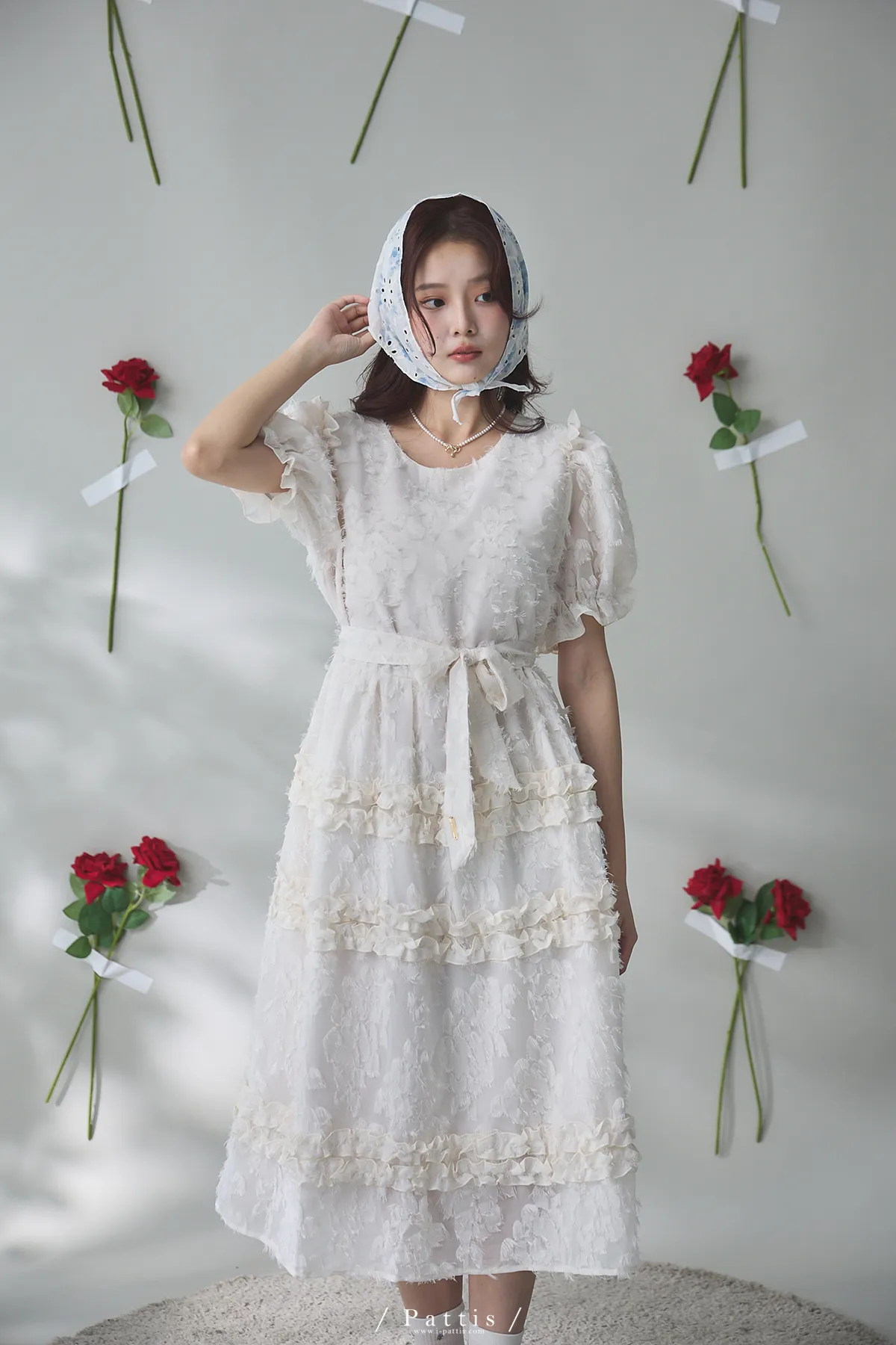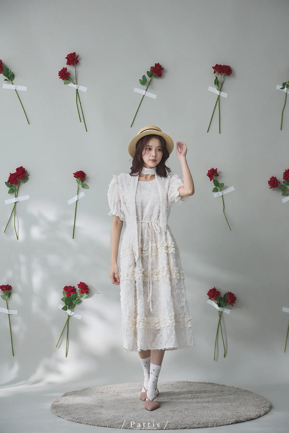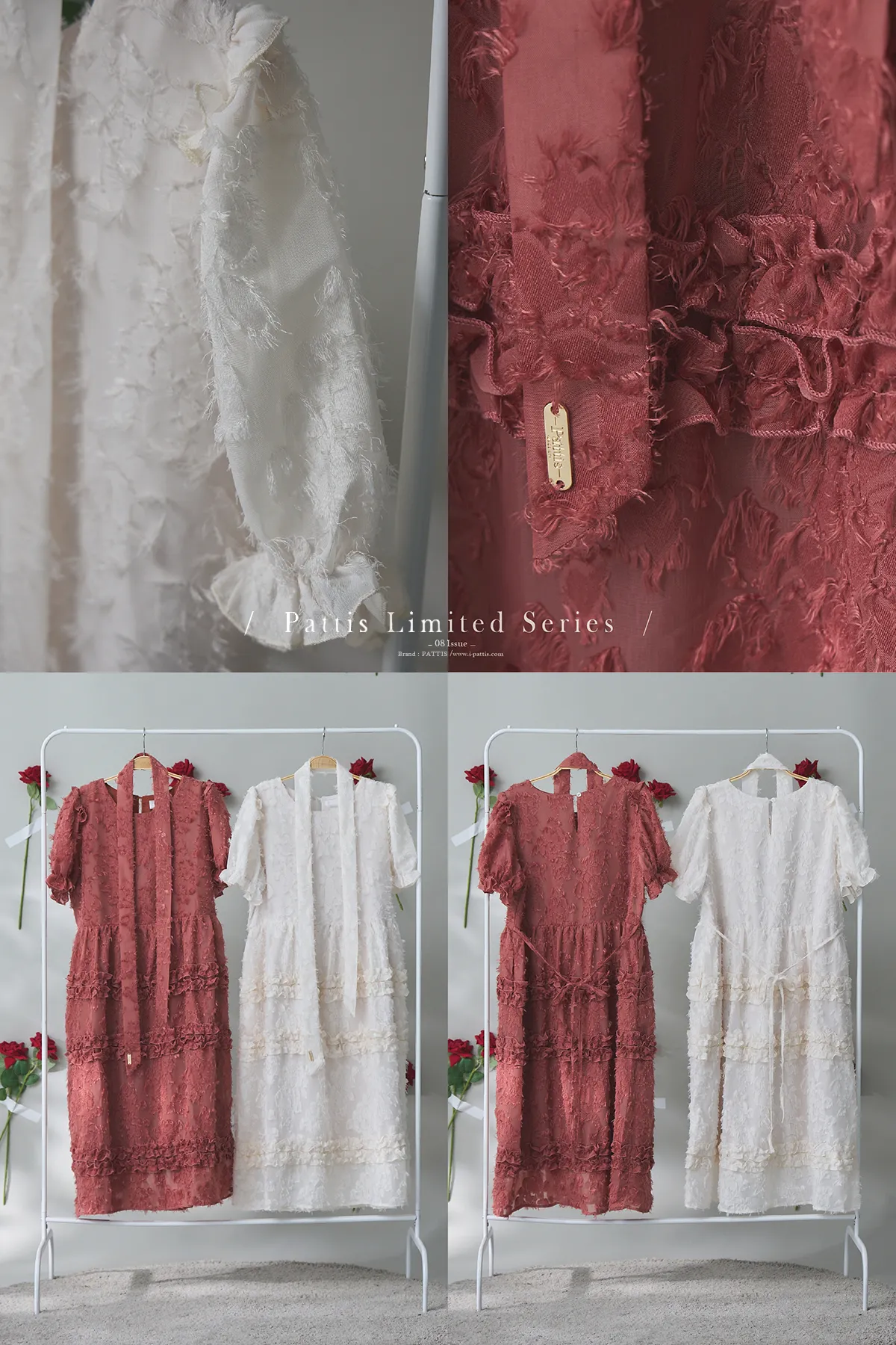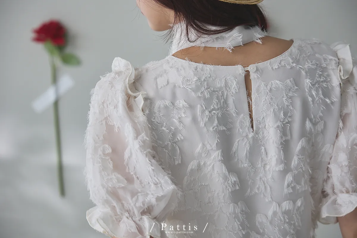 摘一朵花作為簽名檔 | 羽毛浮雕印花蓬袖綁帶荷葉洋裝(白晝月光)