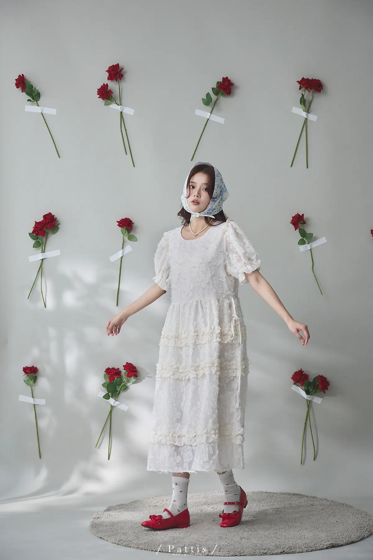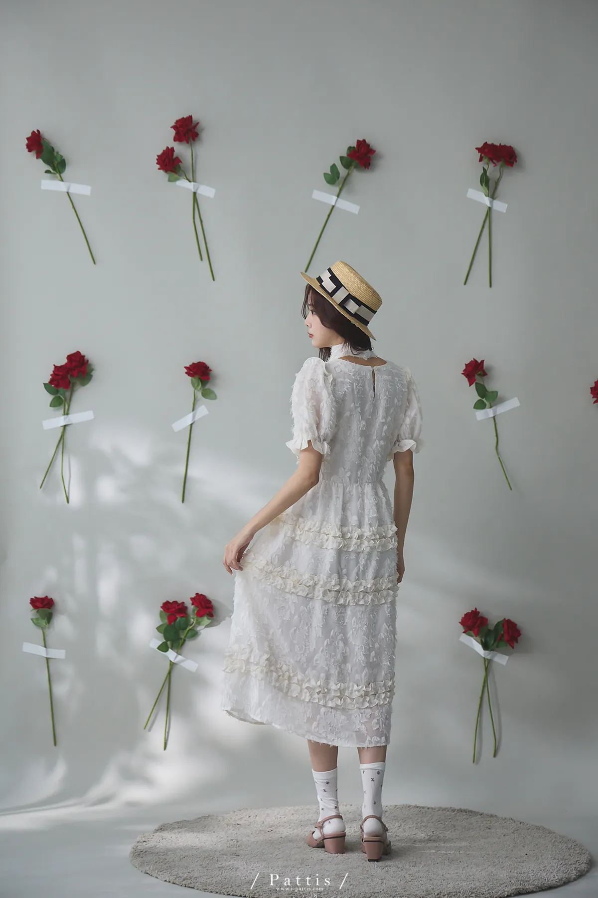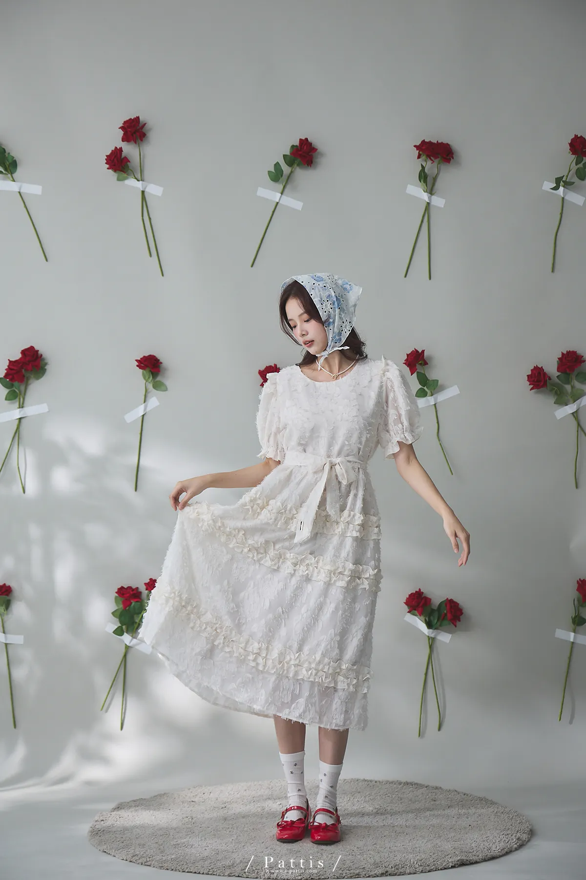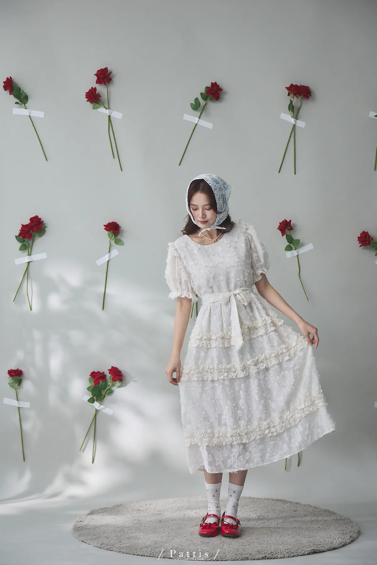 摘一朵花作為簽名檔 | 羽毛浮雕印花蓬袖綁帶荷葉洋裝(白晝月光)