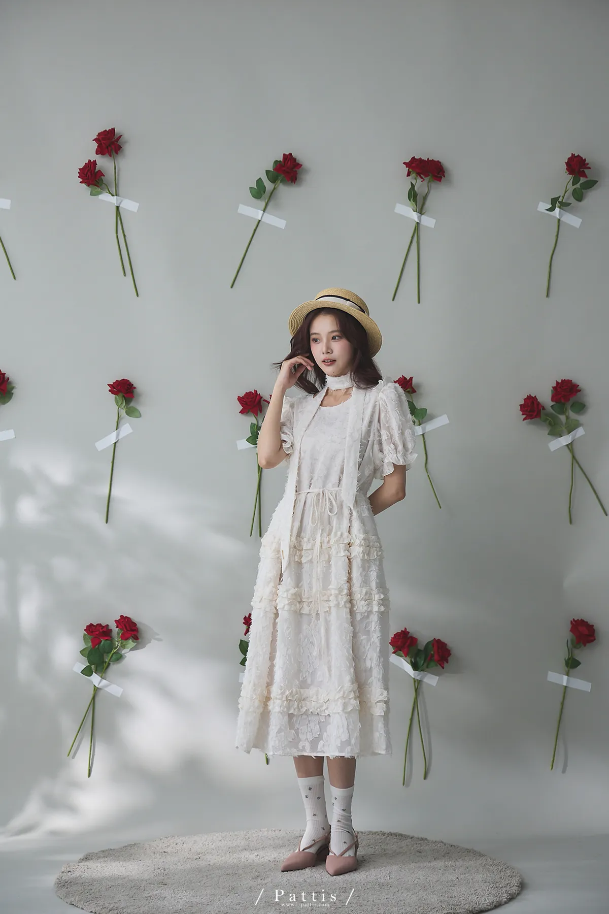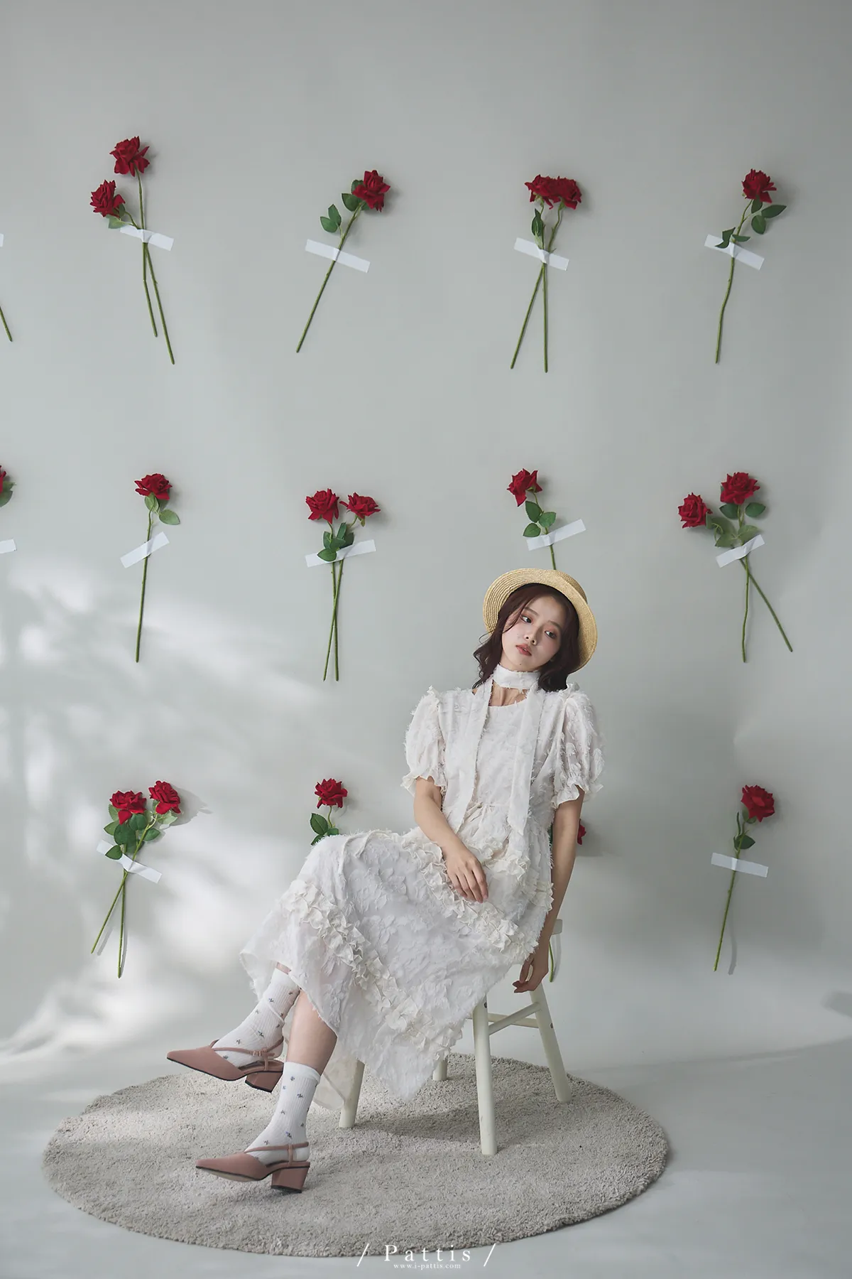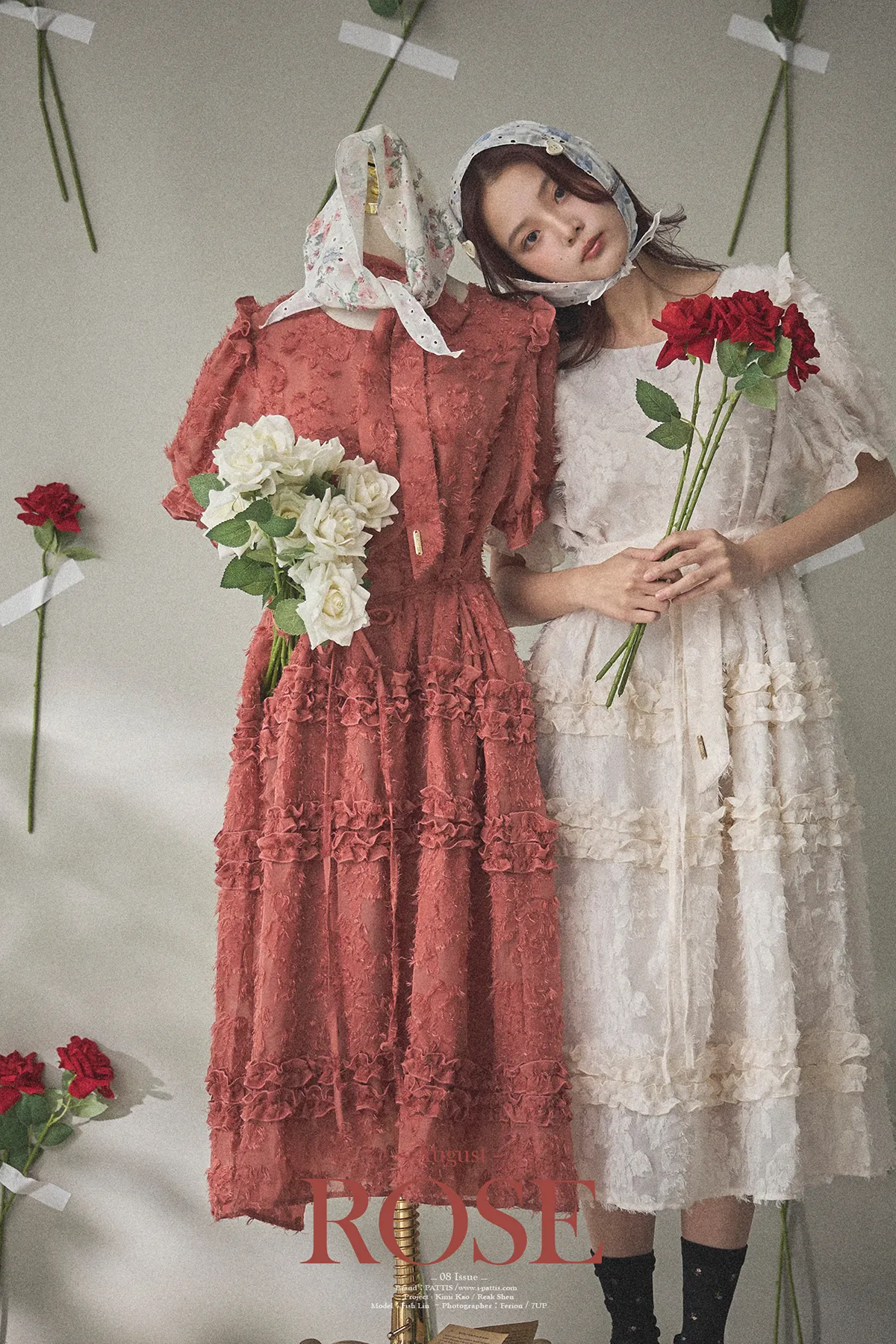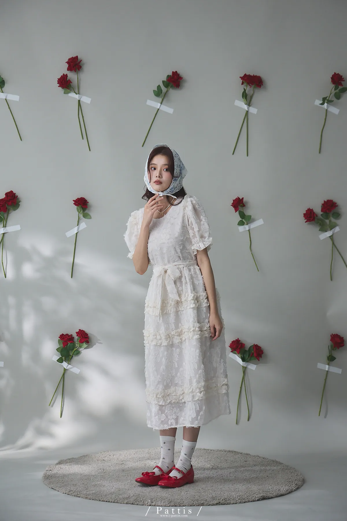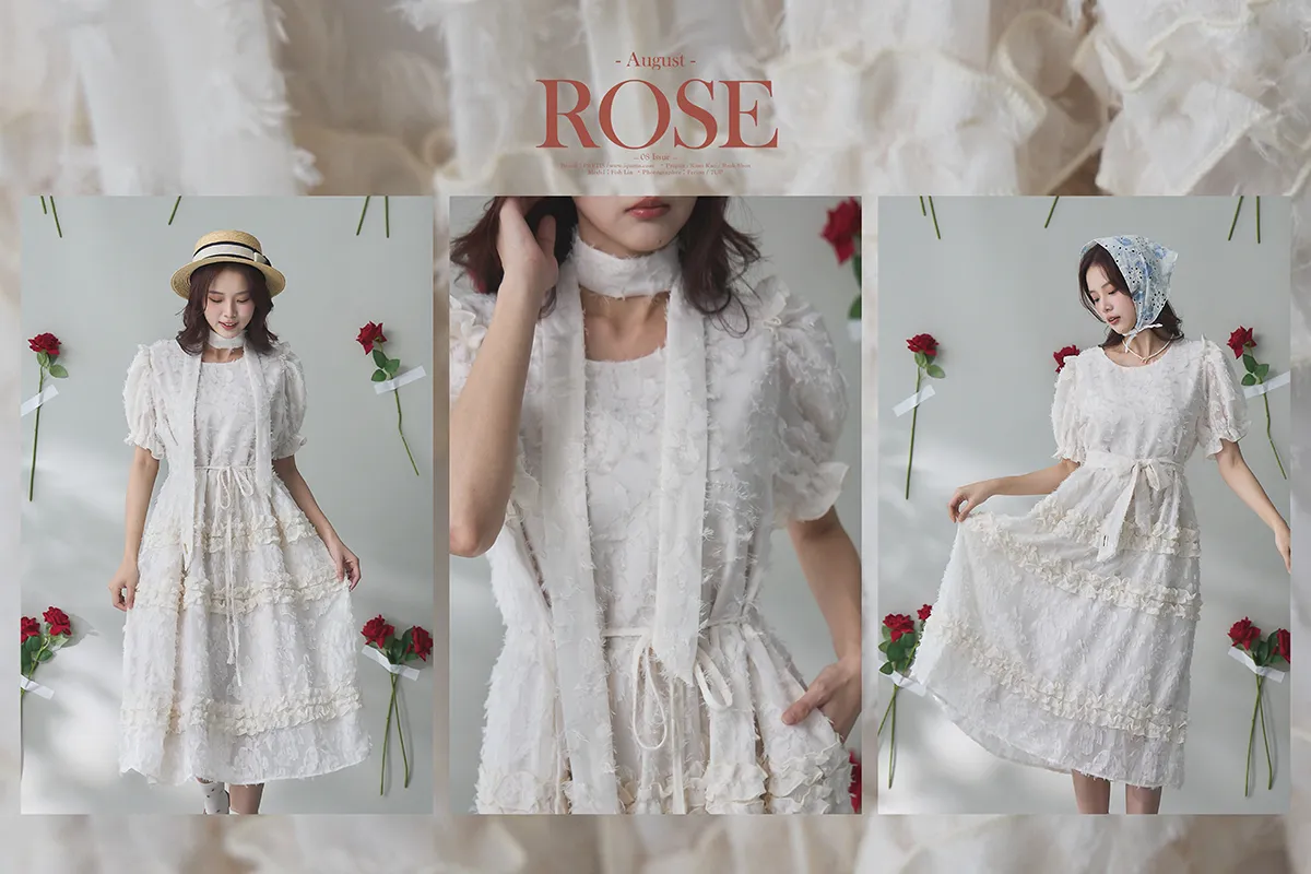 摘一朵花作為簽名檔 | 羽毛浮雕印花蓬袖綁帶荷葉洋裝(白晝月光)