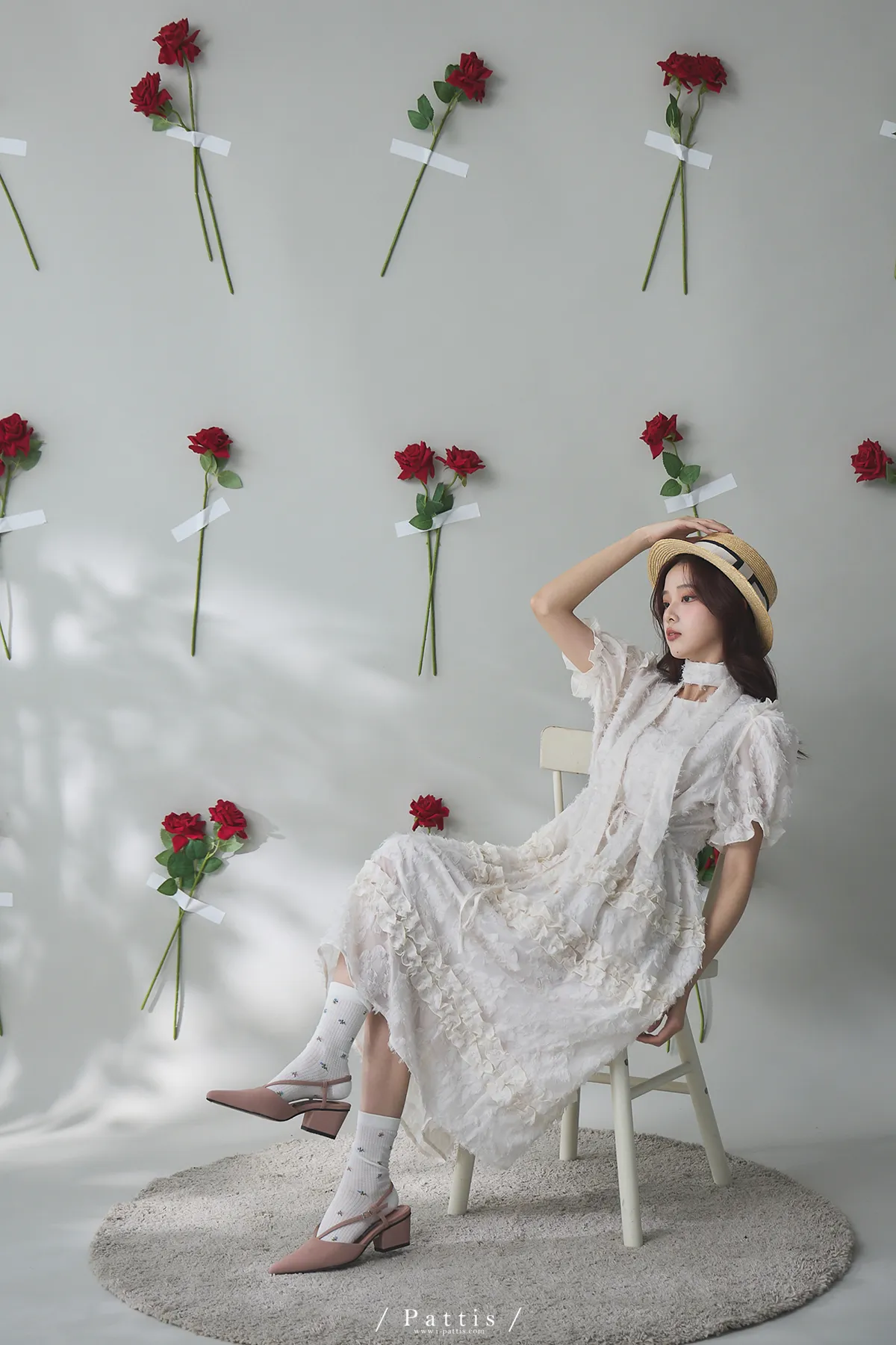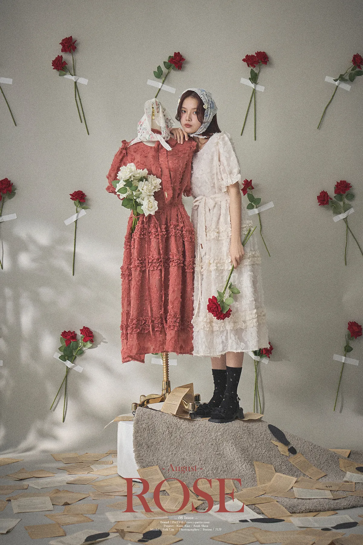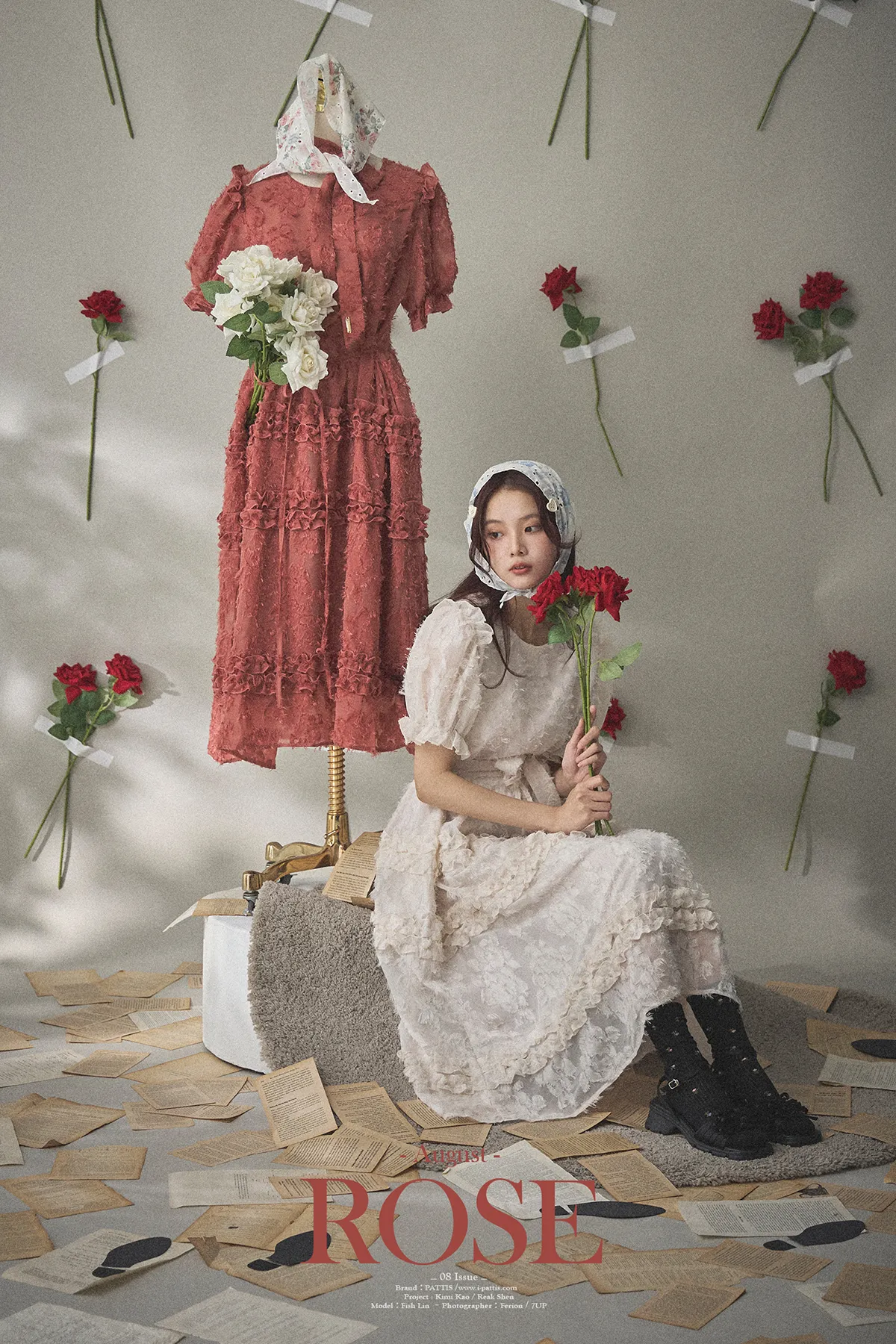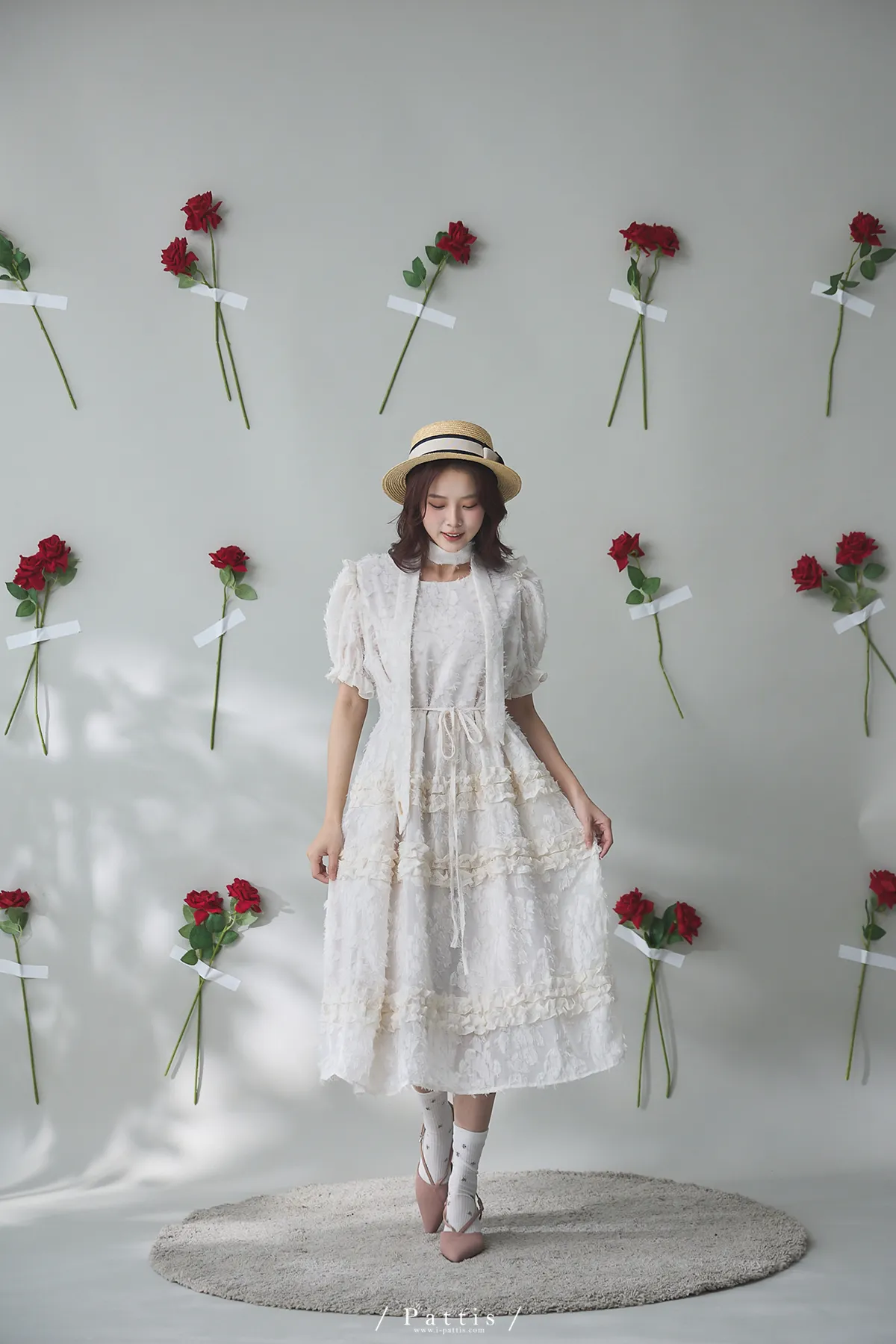 摘一朵花作為簽名檔 | 羽毛浮雕印花蓬袖綁帶荷葉洋裝(白晝月光)