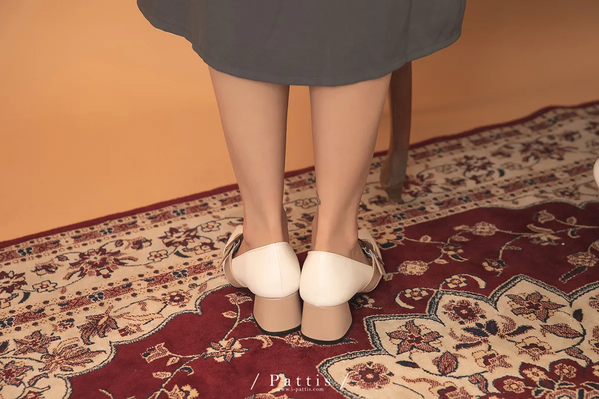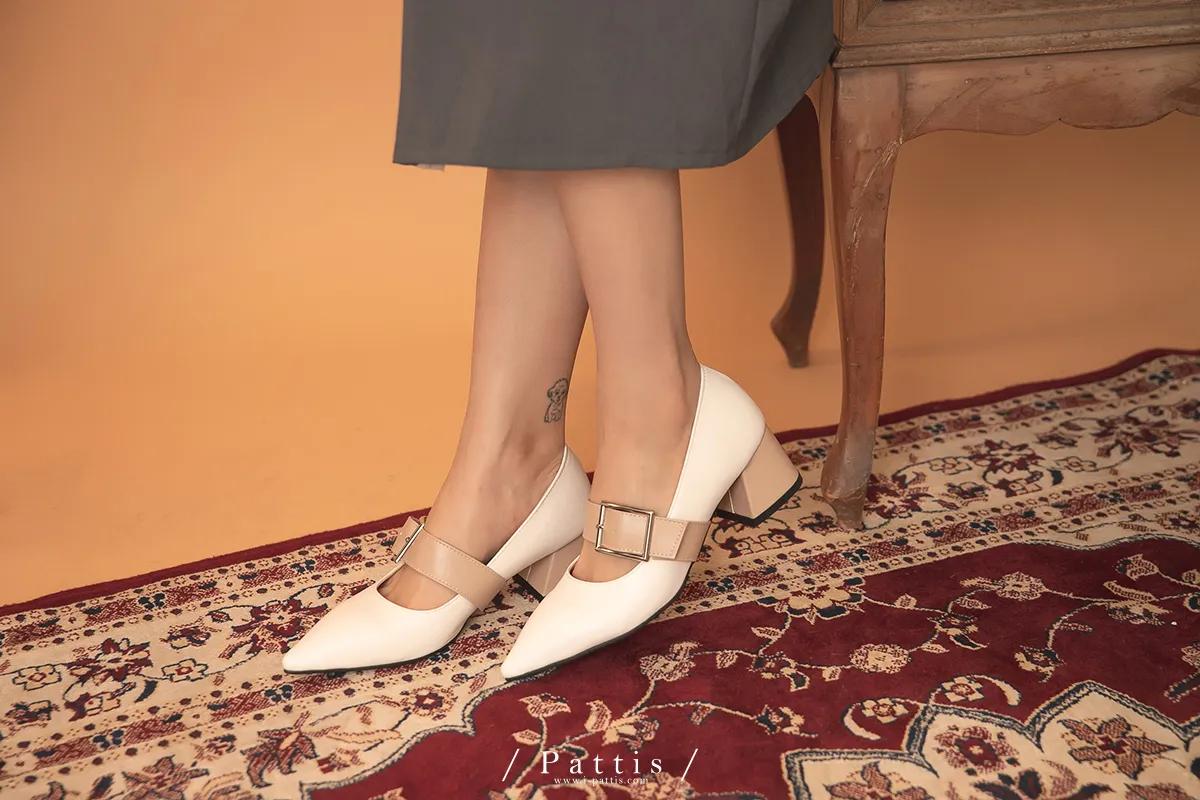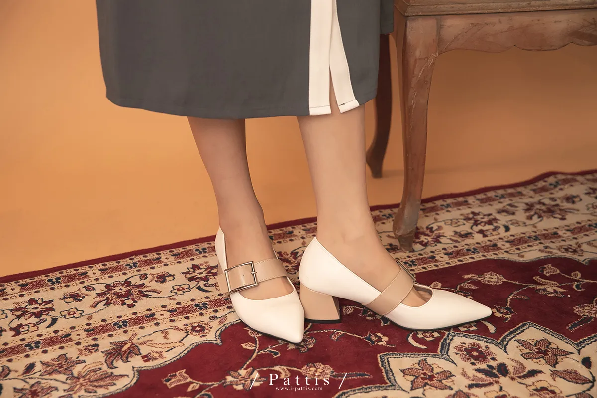 (現貨-白23.5)再次優雅的馴服 | 撞色環扣尖頭粗跟鞋