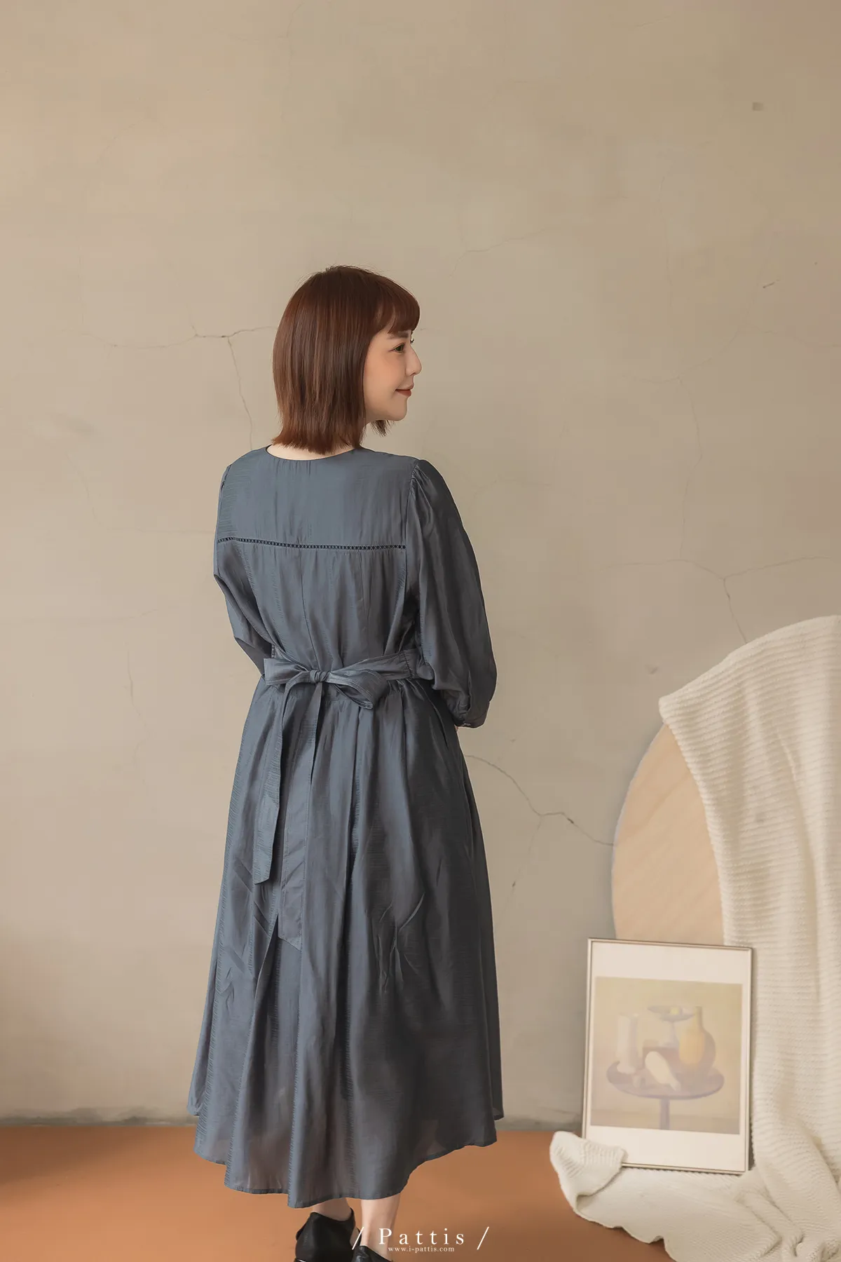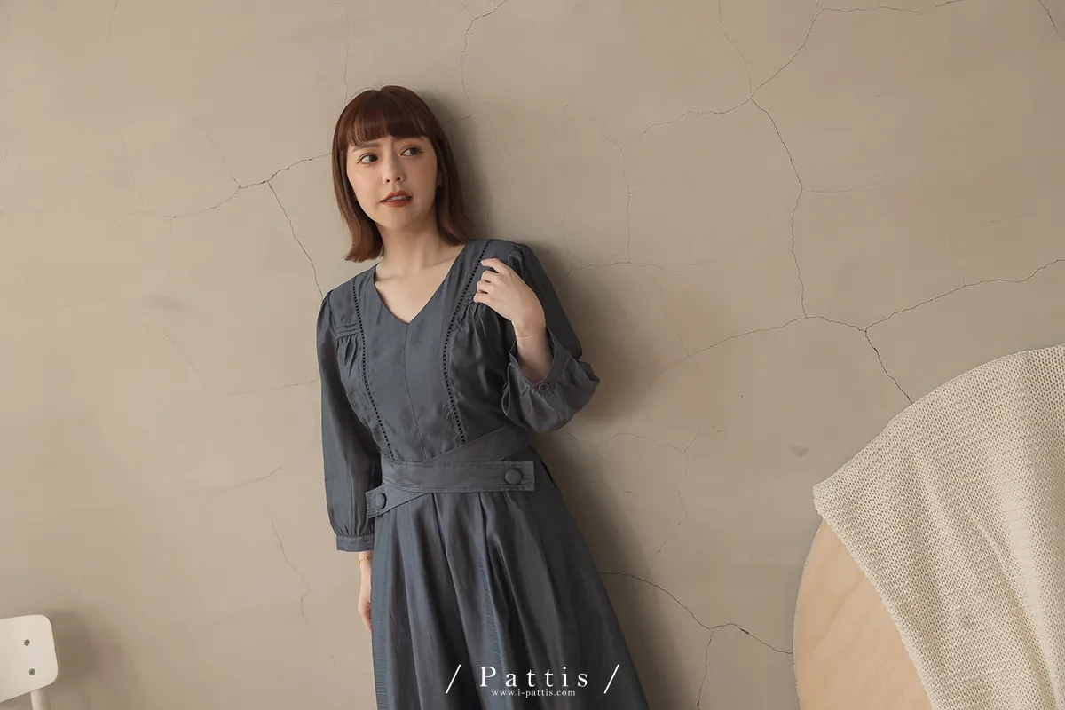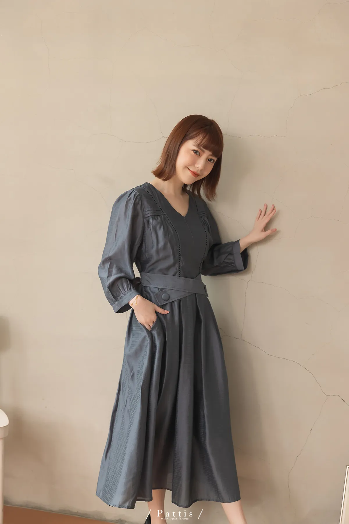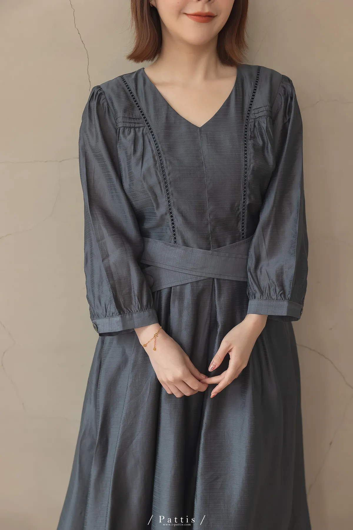 偽裝偷心賊 | 鋼琴絲紋縷空蕾絲交叉綁帶洋裝(藍綠)