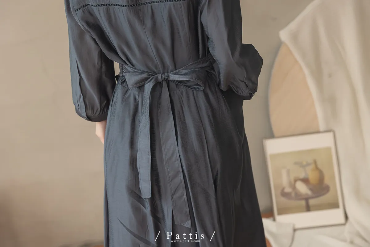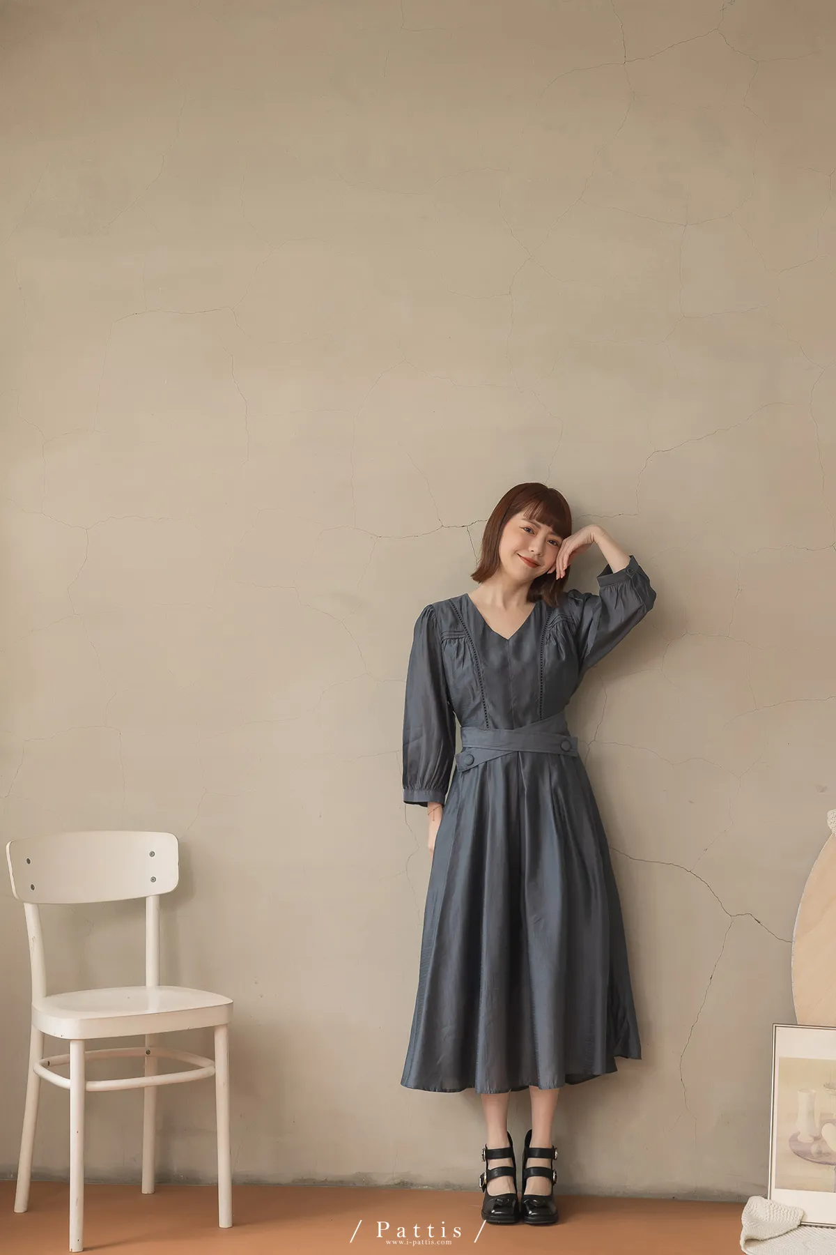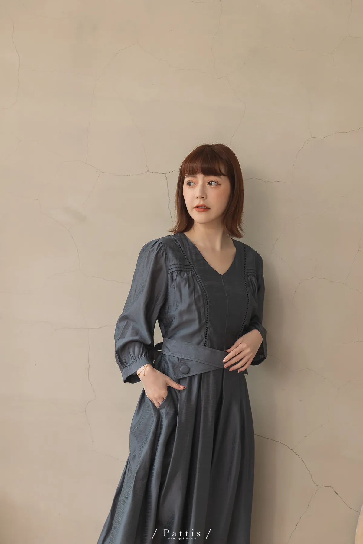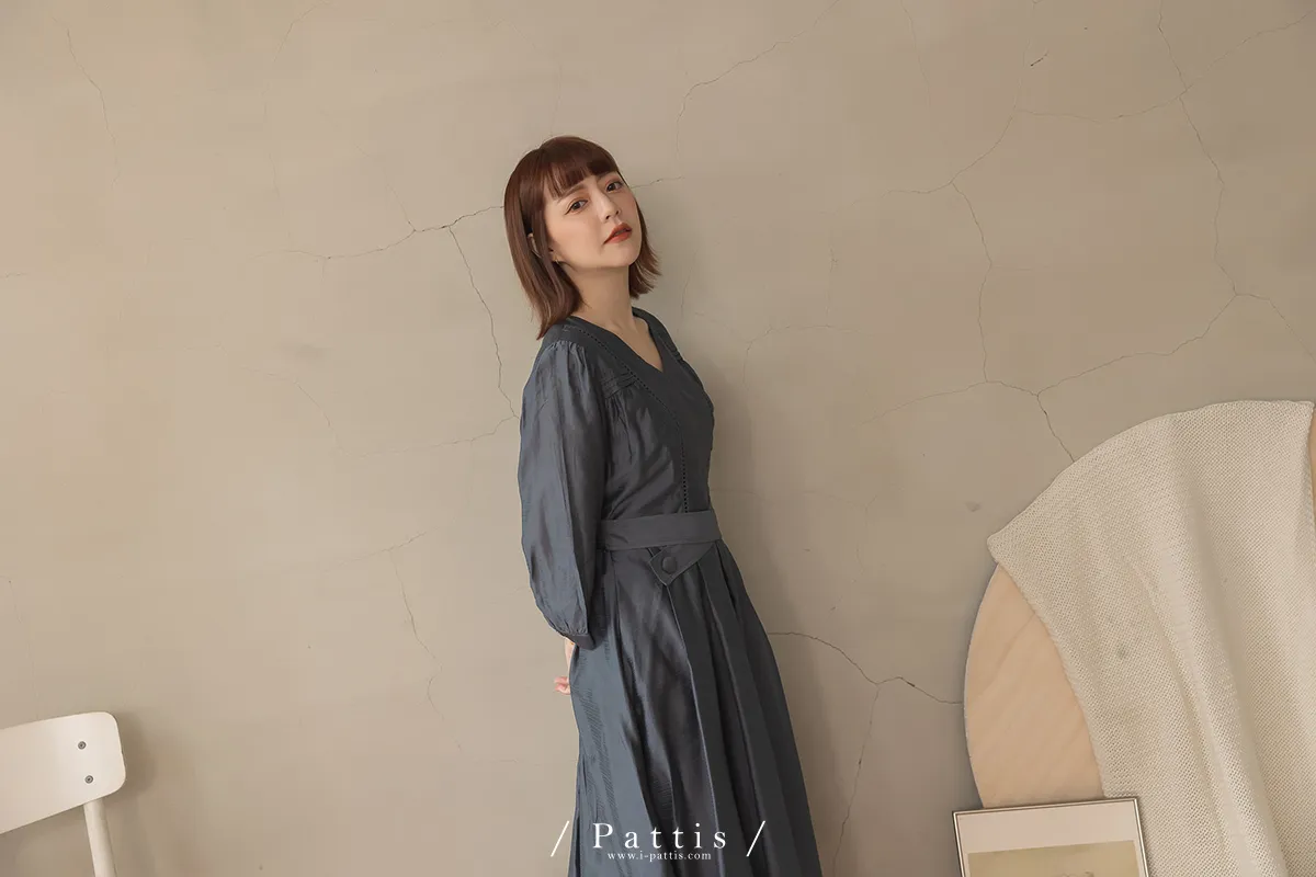 偽裝偷心賊 | 鋼琴絲紋縷空蕾絲交叉綁帶洋裝(藍綠)
