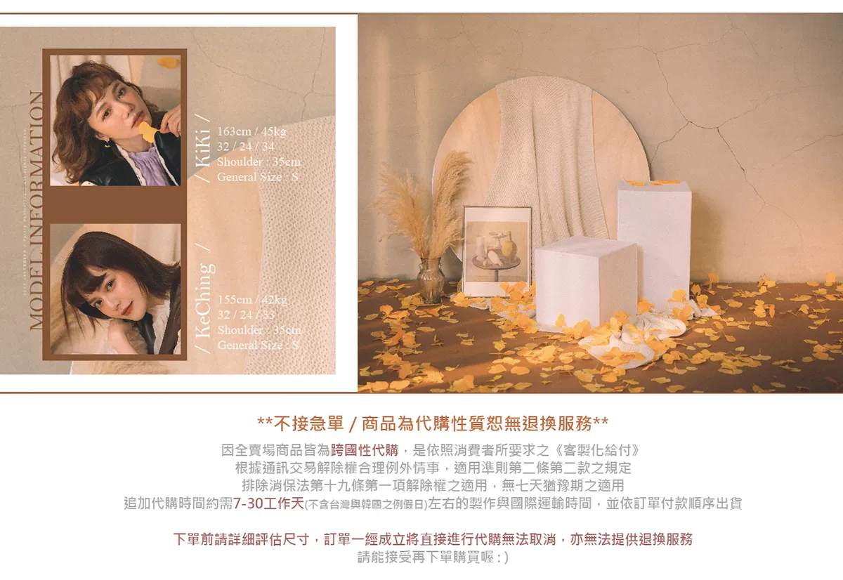 | 平量尺寸(cm) | 全長 | 肩寬 | 胸寬 | 腰寬 | 臀寬 | 下擺寬 | 袖長 | 袖口寬 | 上臂寬 | 腋寬 | 材質 | 內襯 | 穿脫方式 | Memo |