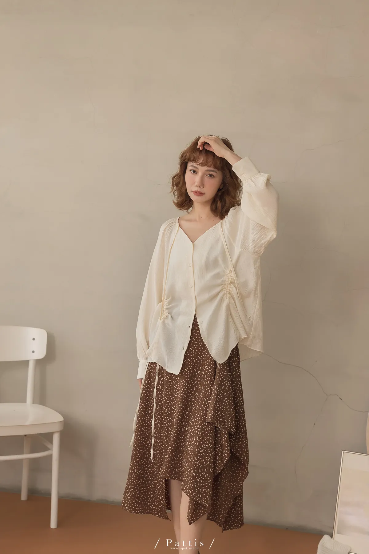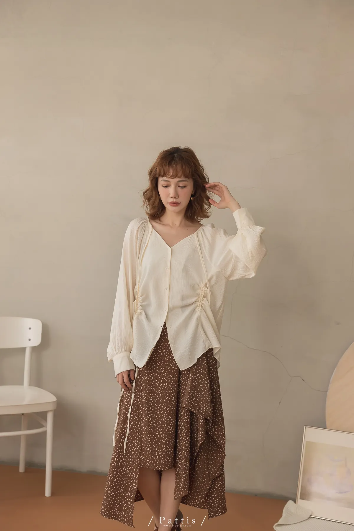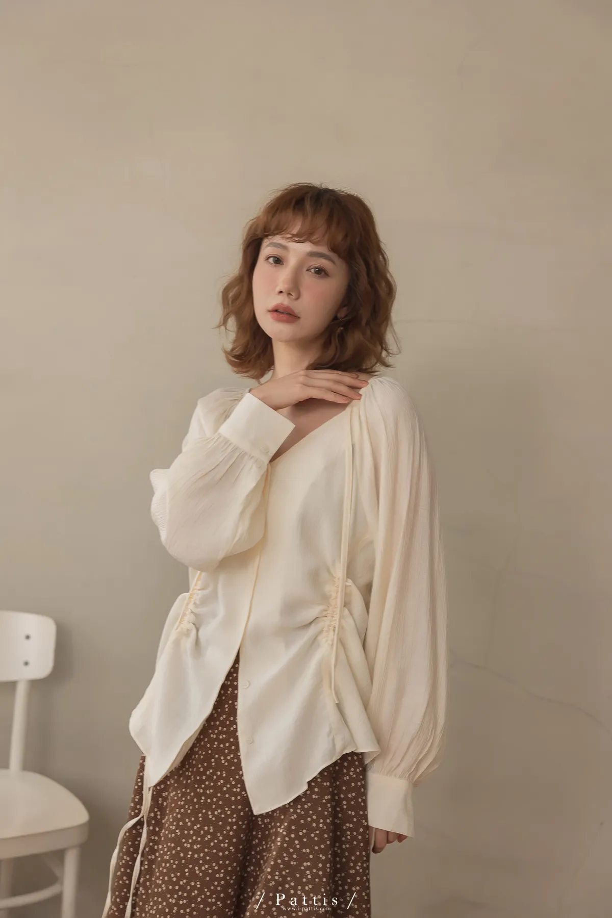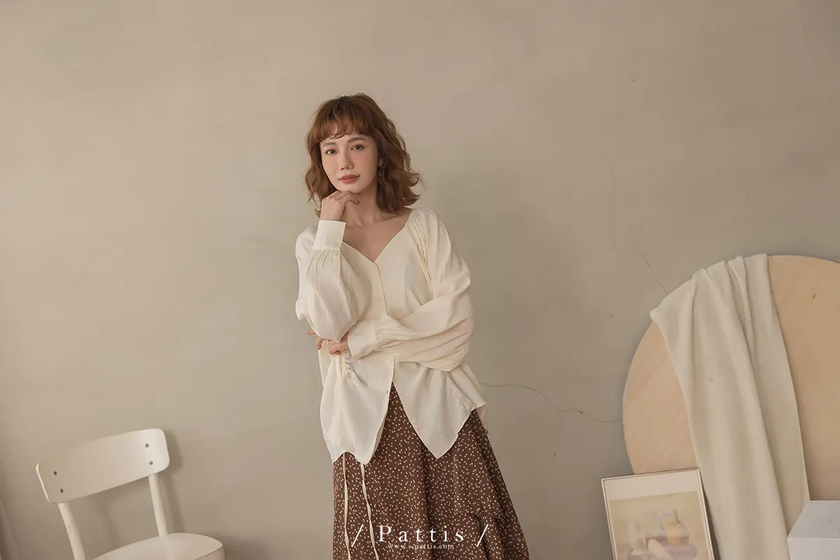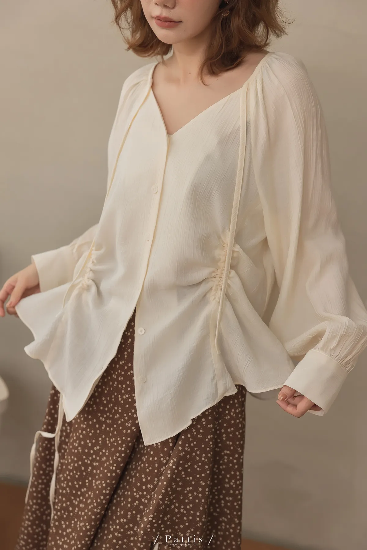 下午三時的光 | V領抽繩造型長上衣(米白)