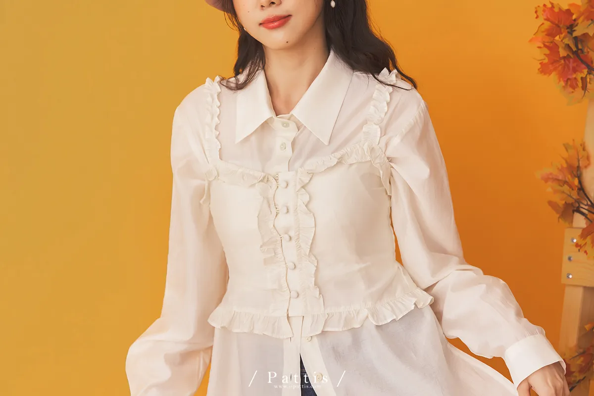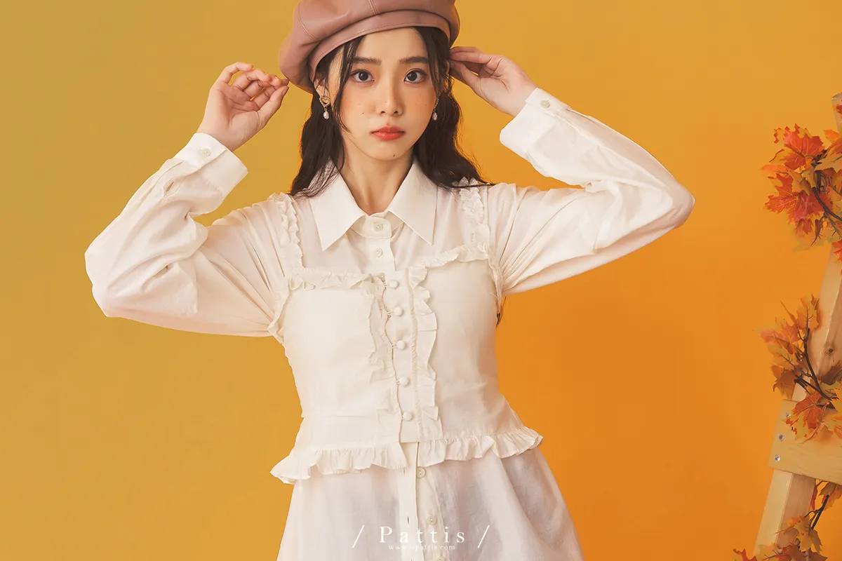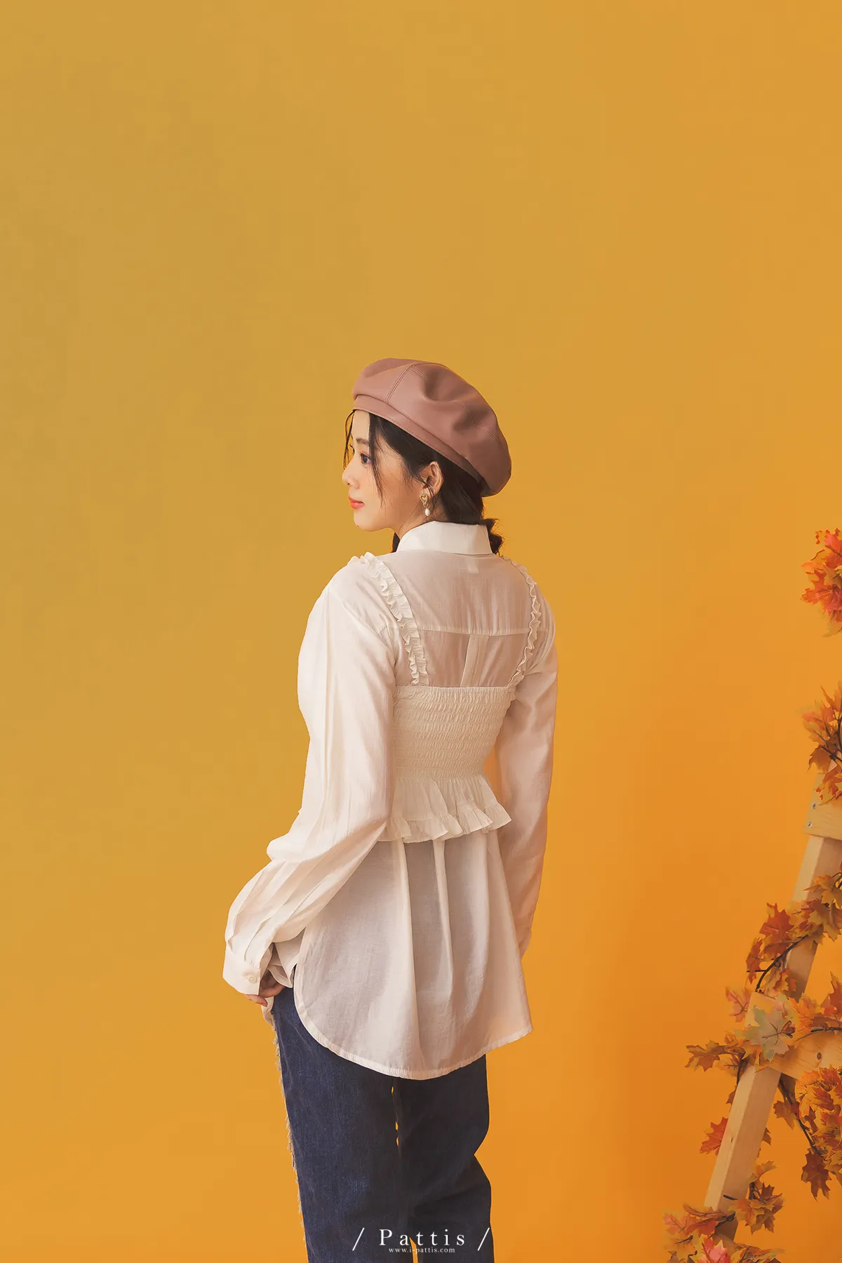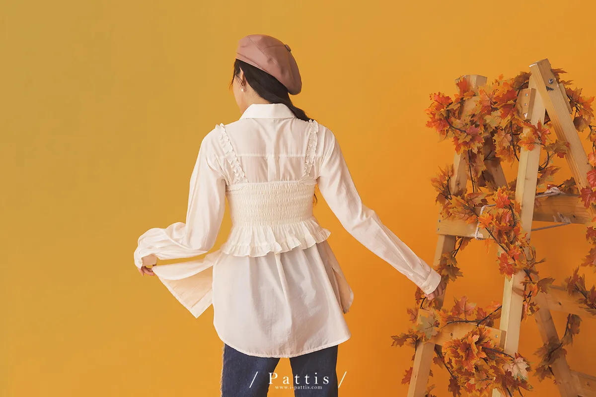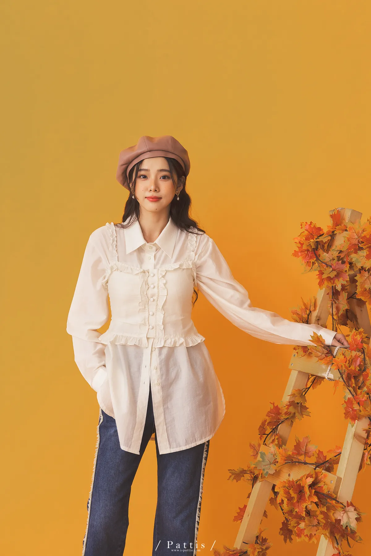 棉花糖可可|荷葉馬甲背心+口袋襯衫set組(米白)