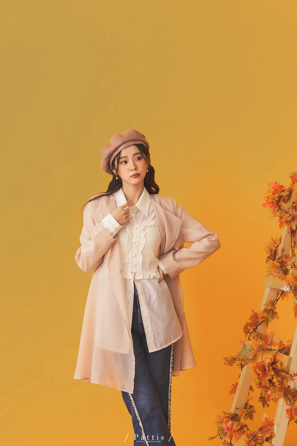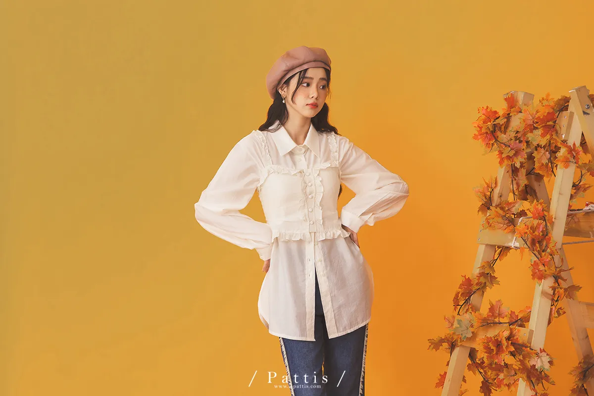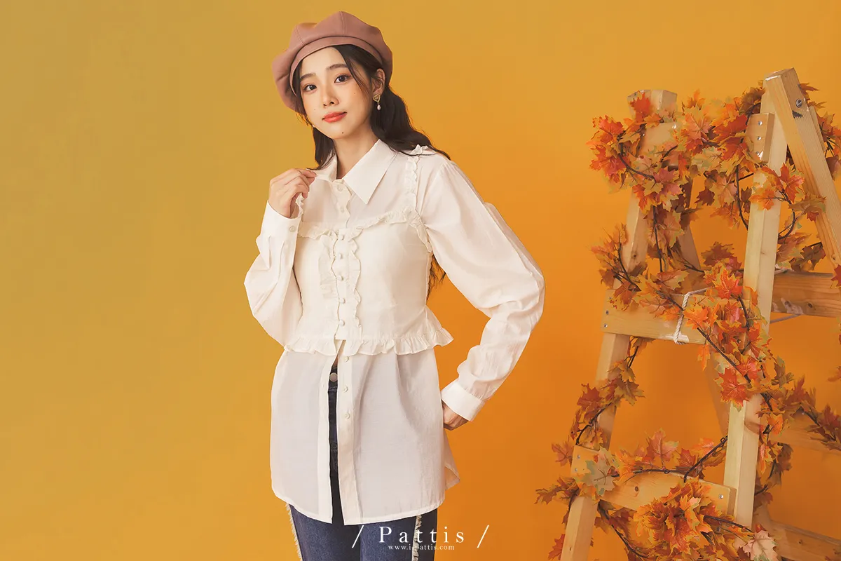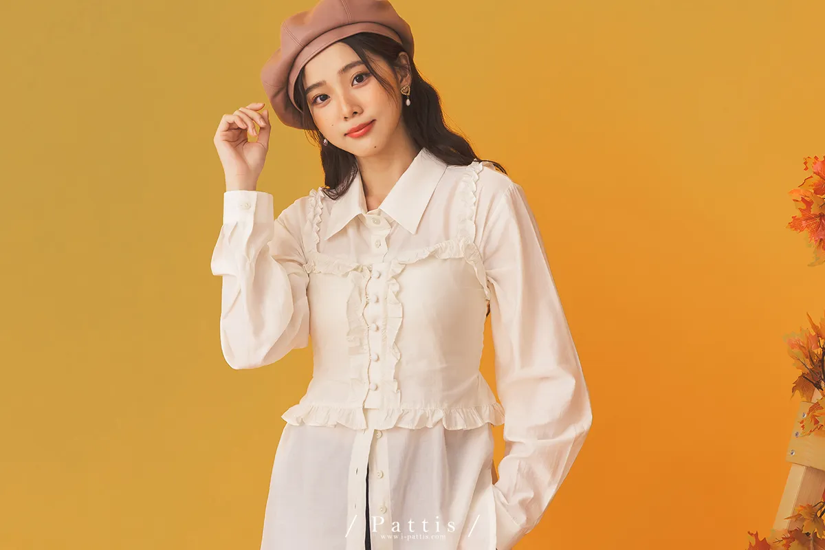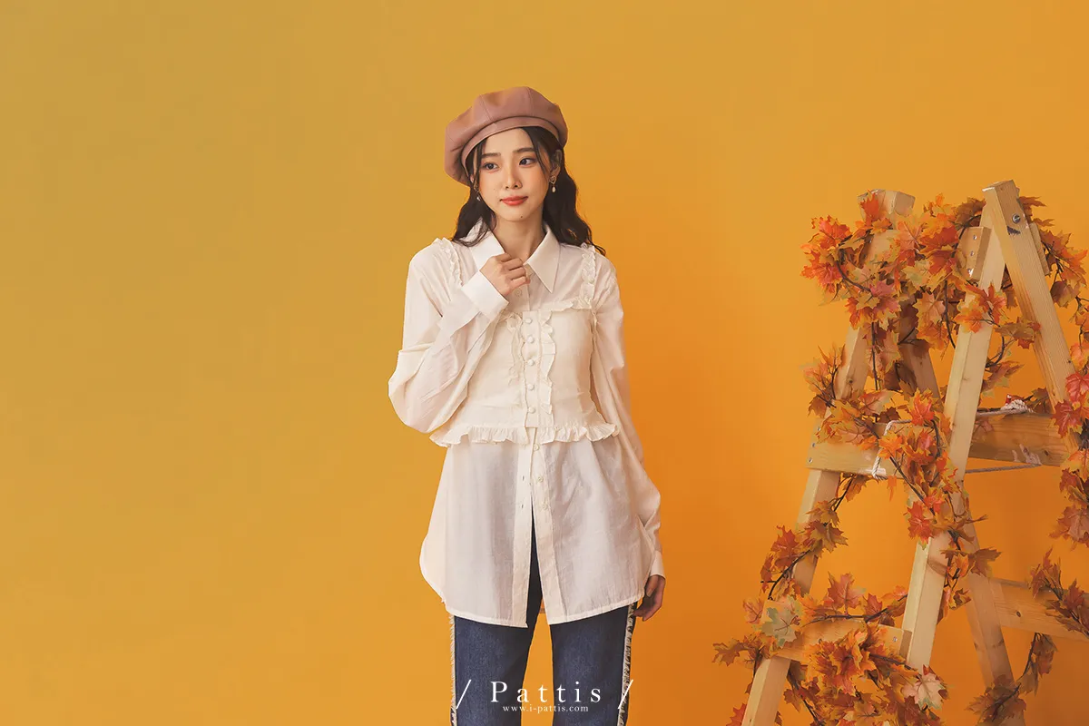 棉花糖可可|荷葉馬甲背心+口袋襯衫set組(米白)