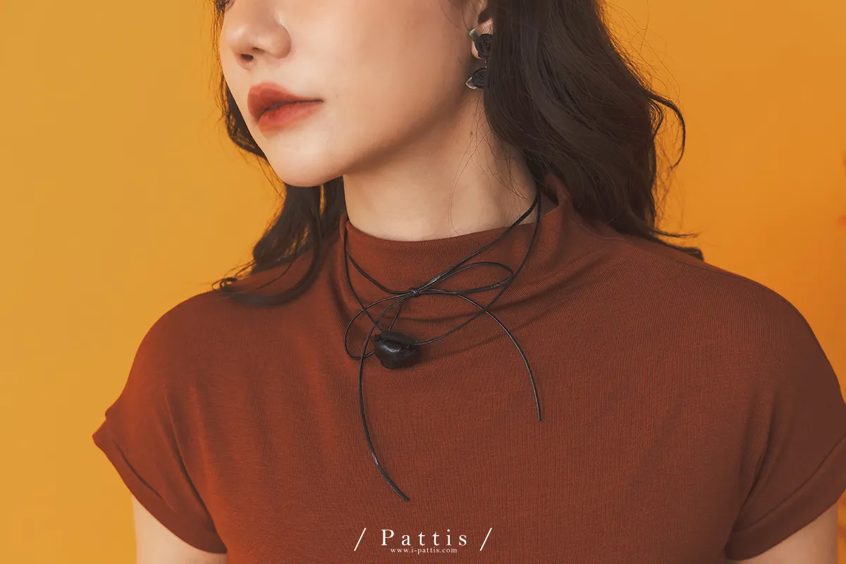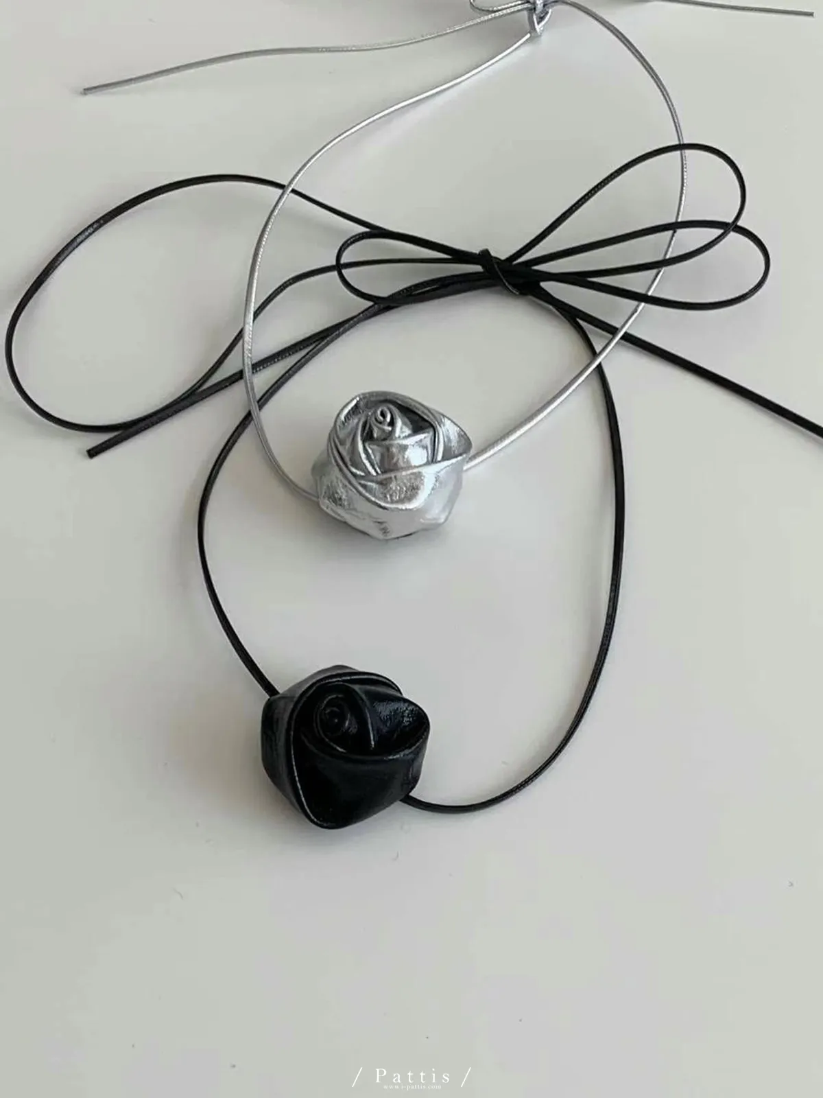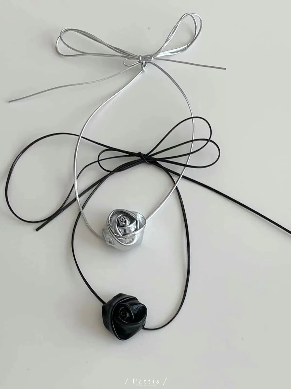 玫瑰皮革綁帶多way項鍊綴飾(銀色/黑色)
