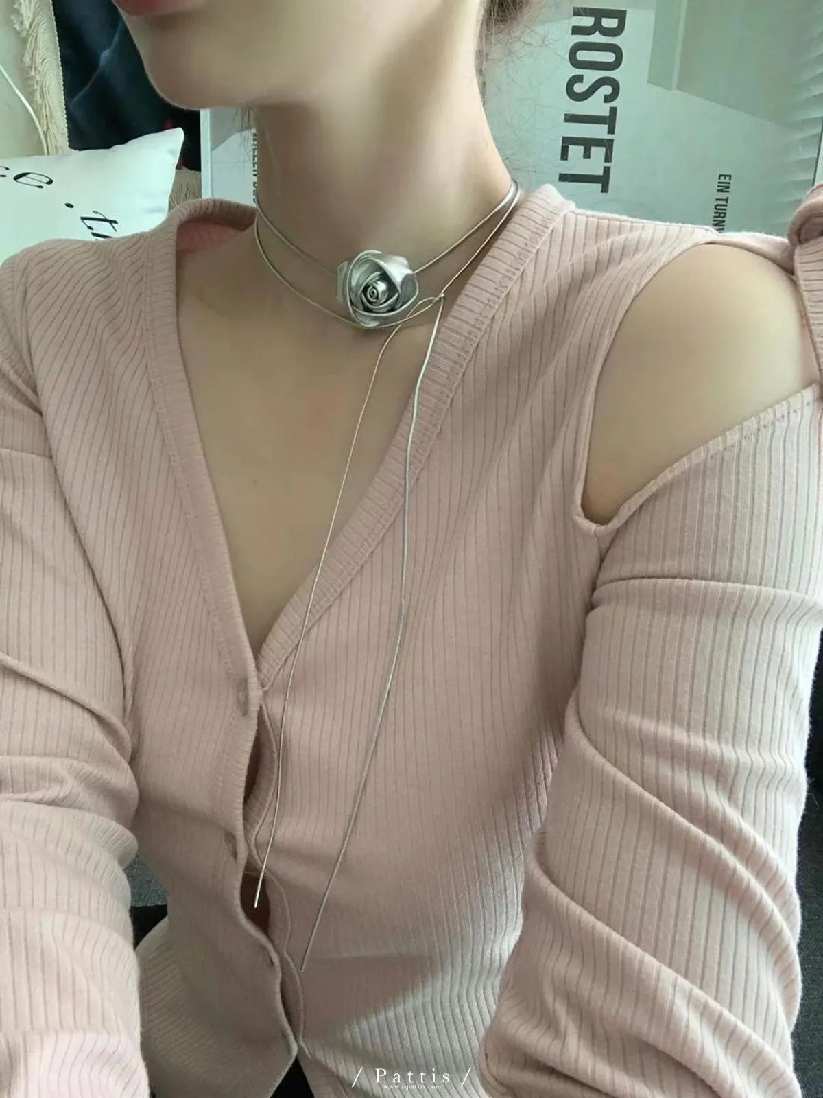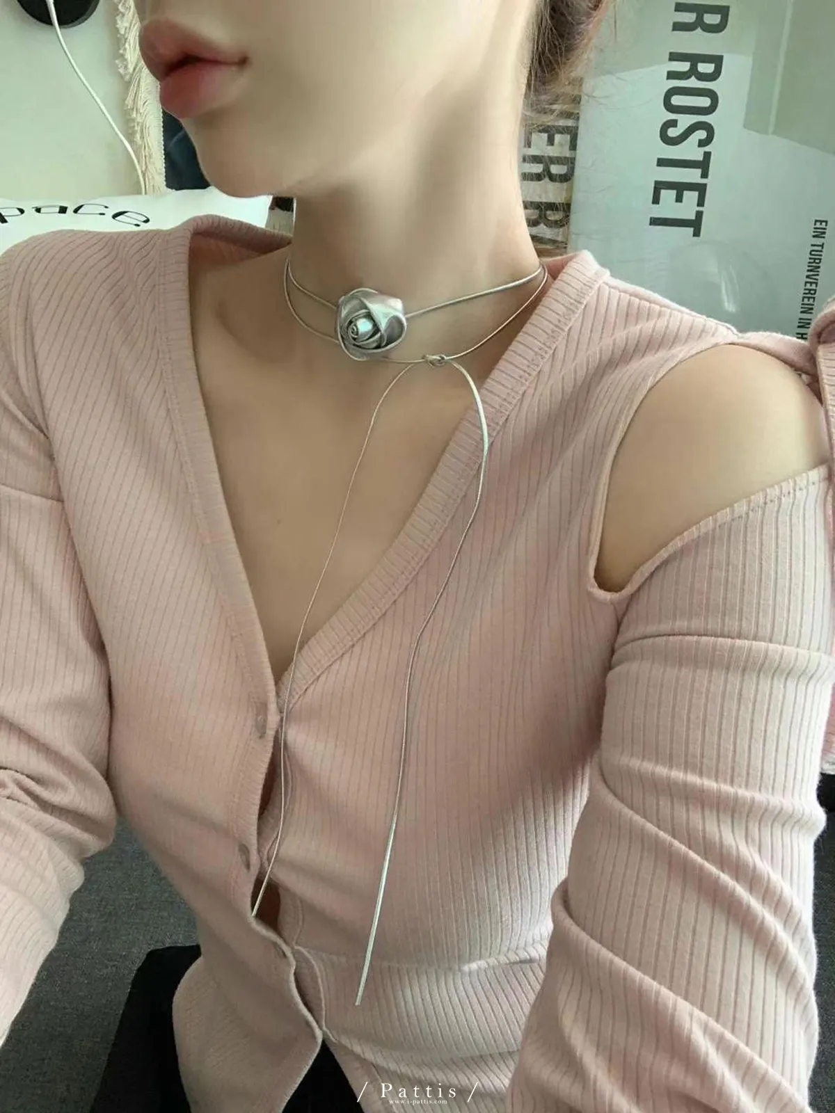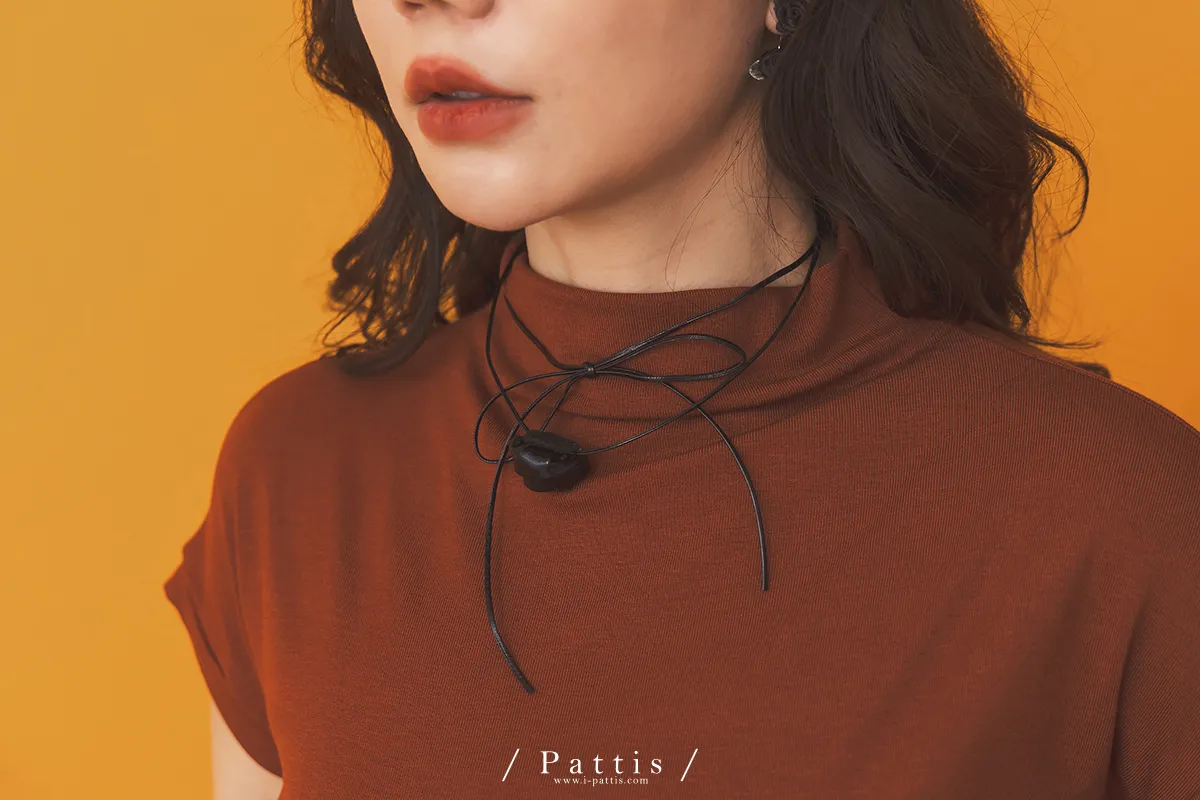 玫瑰皮革綁帶多way項鍊綴飾(銀色/黑色)