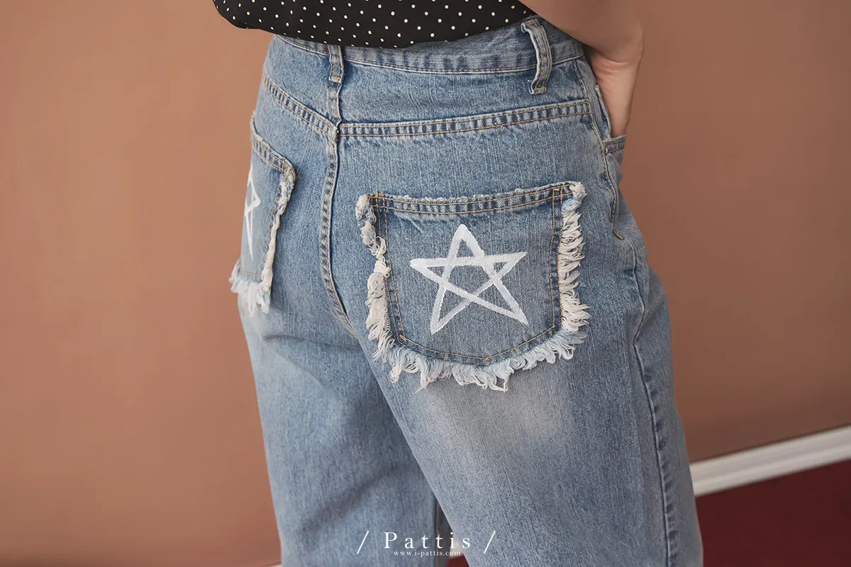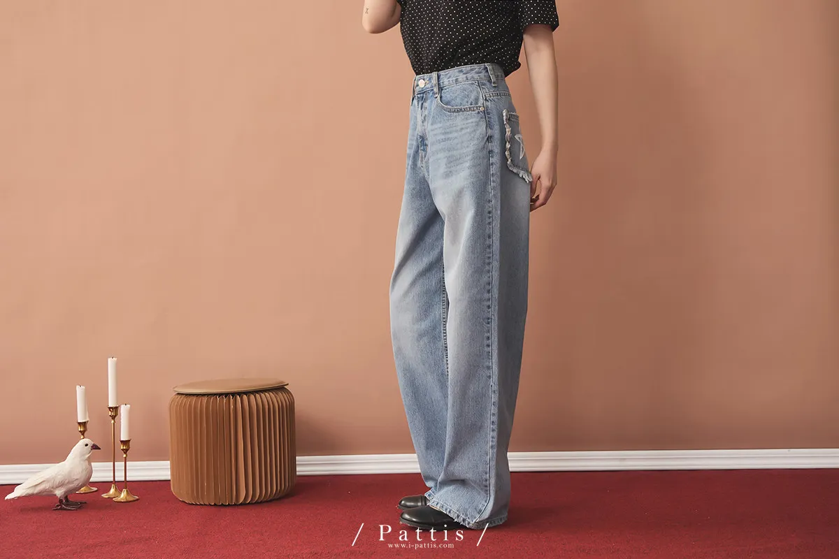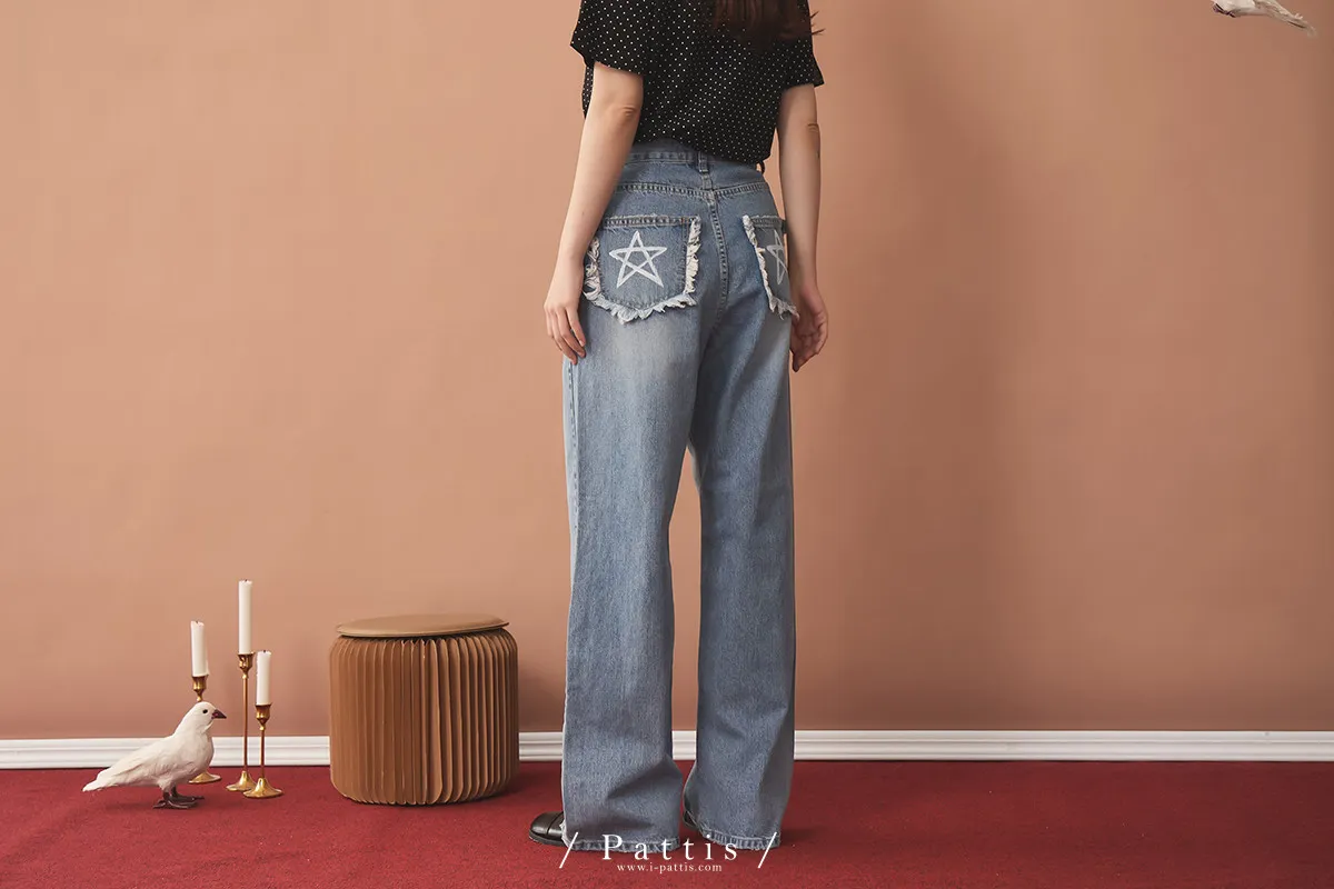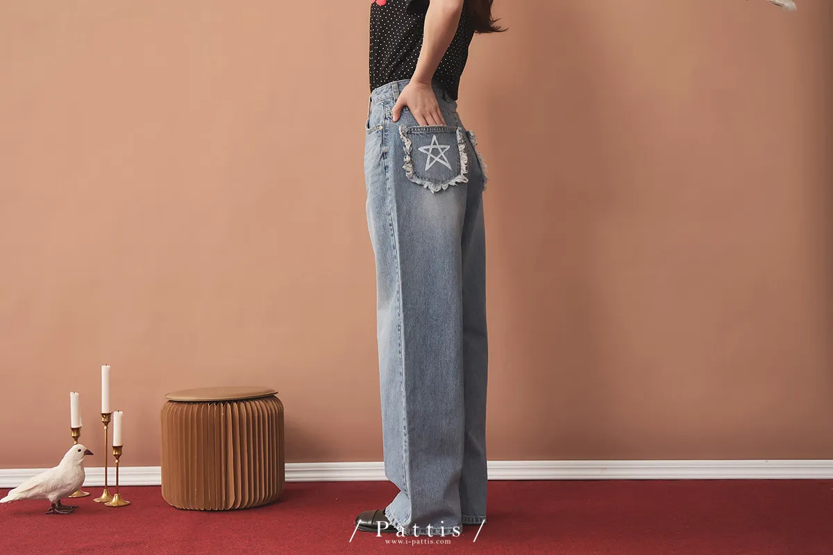 (現貨)不錯過任一抹流星 | 流蘇口袋星星刷色丹寧寬褲(單一色)