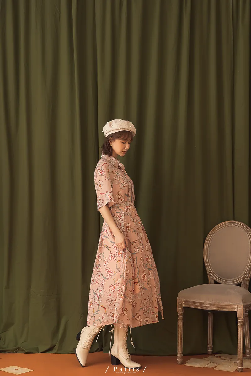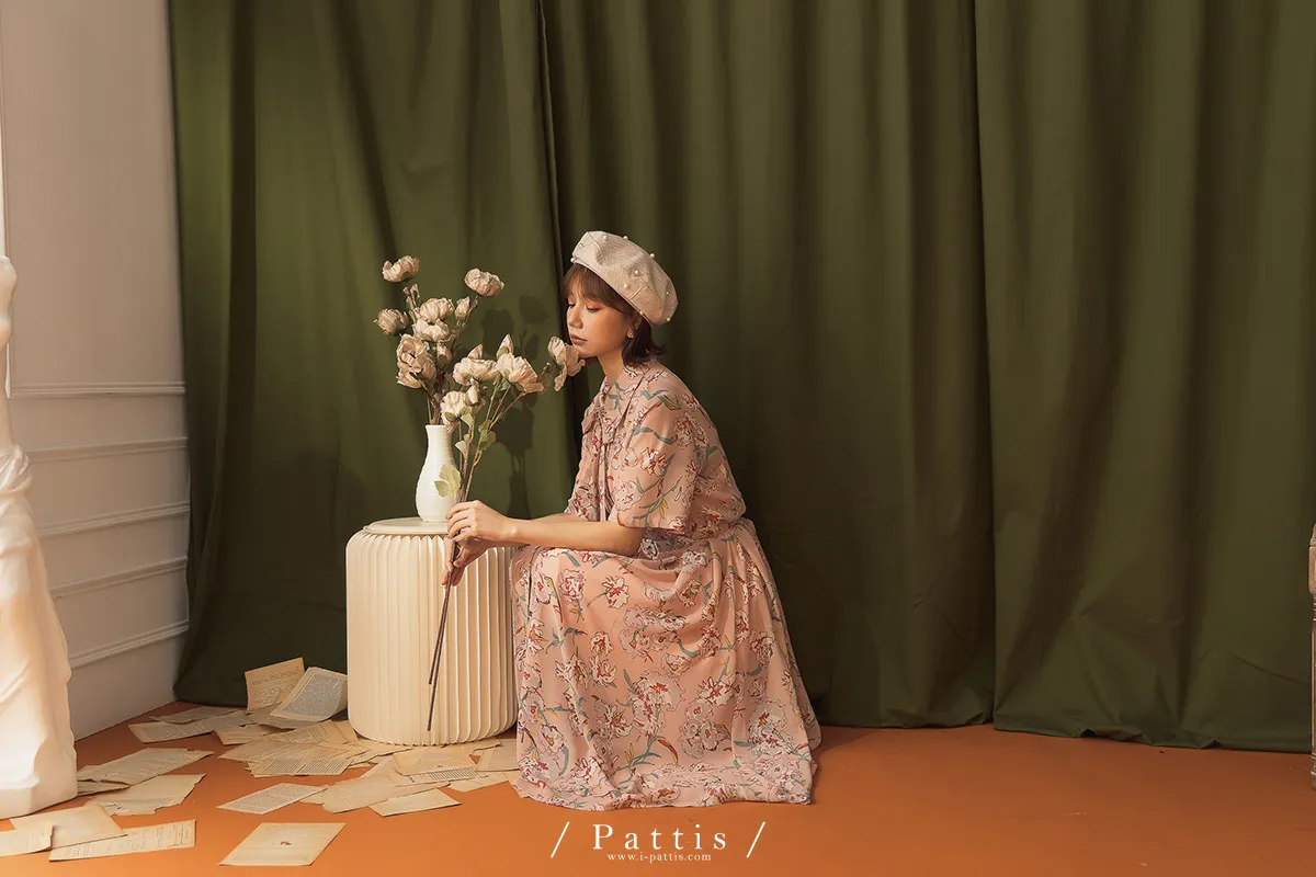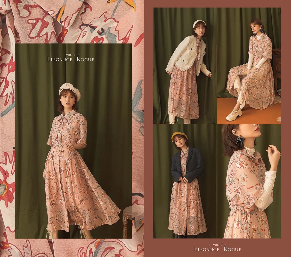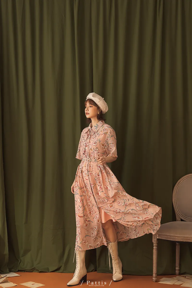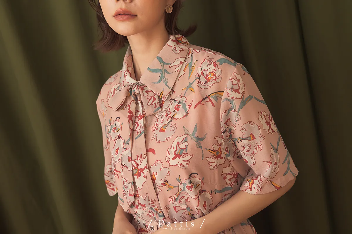 抽象派花農圖鑑 | 印花領巾2way洋裝四件組(薔薇粉)