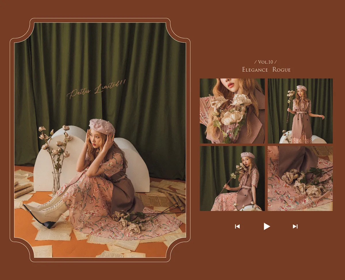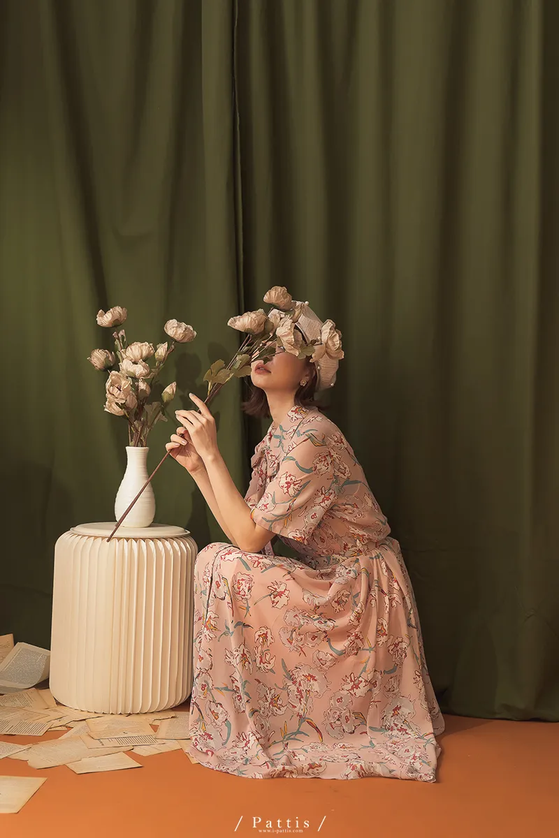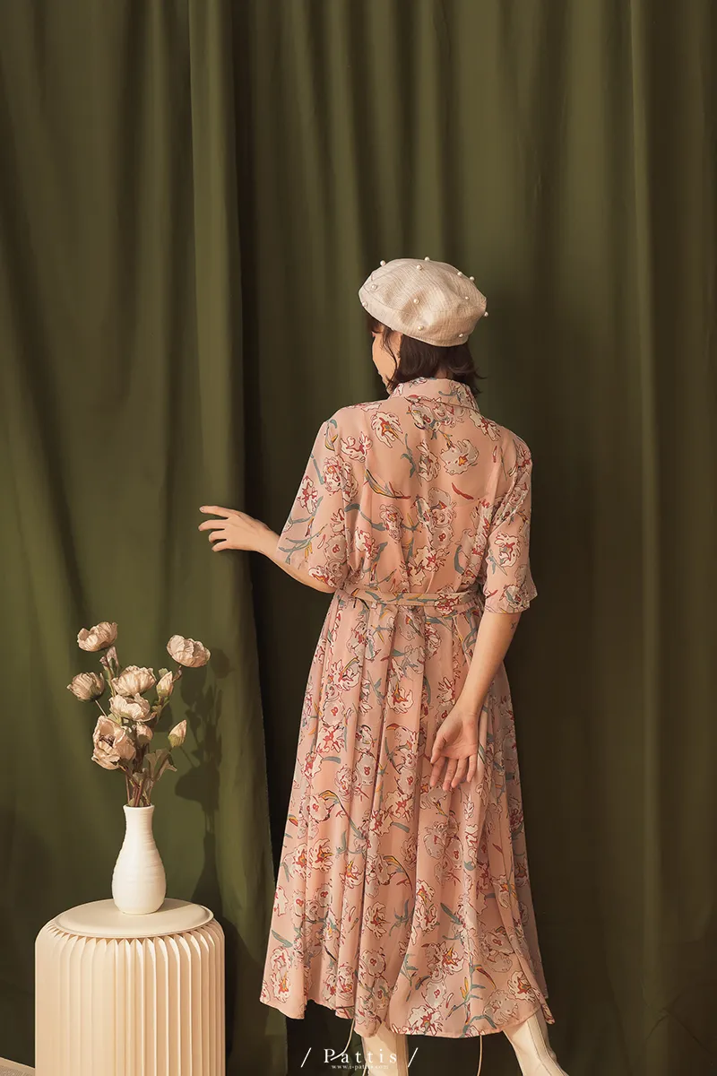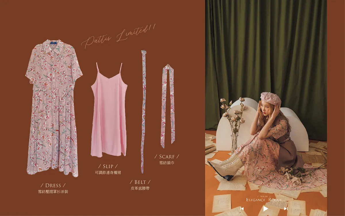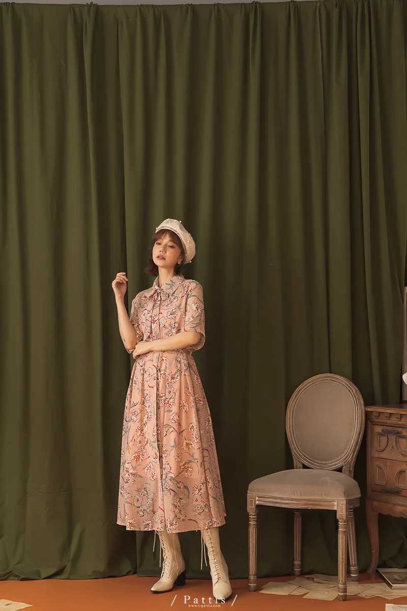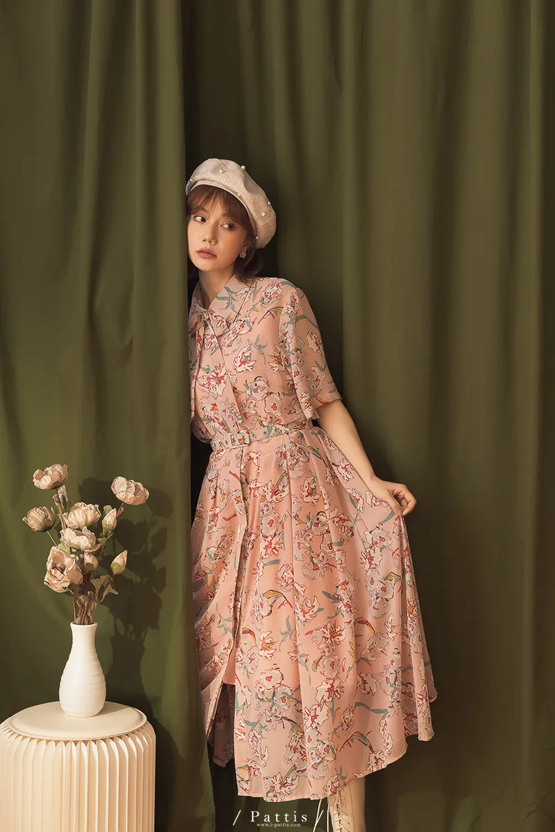 抽象派花農圖鑑 | 印花領巾2way洋裝四件組(薔薇粉)
