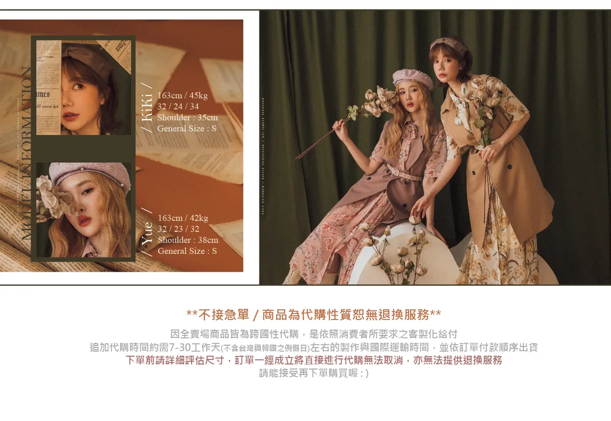 | 平量尺寸(cm) | 全長 | 肩寬 | 胸寬 | 腰寬 | 臀寬 | 下擺寬 | 袖長 | 袖口寬 | 上臂寬 | 腋寬 | 腰帶長 | 綁帶長 | 材質 | 穿脫方式 | Memo |