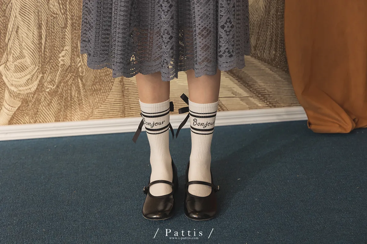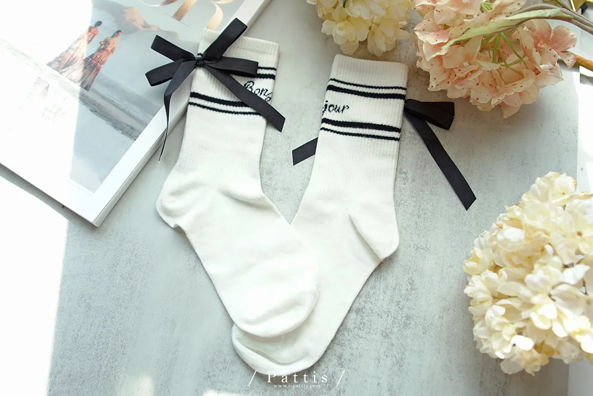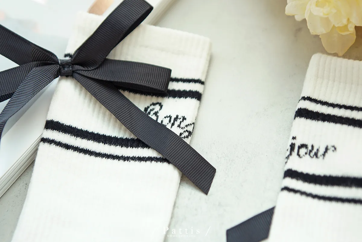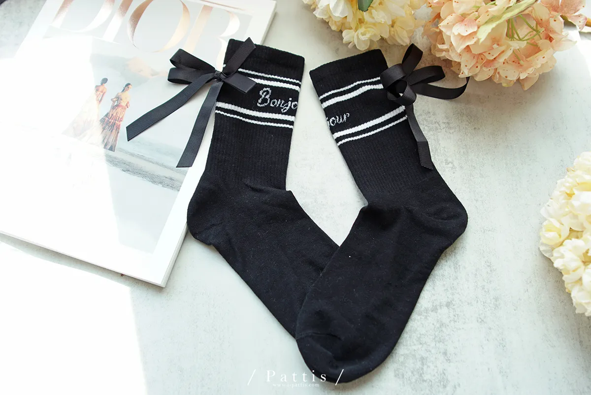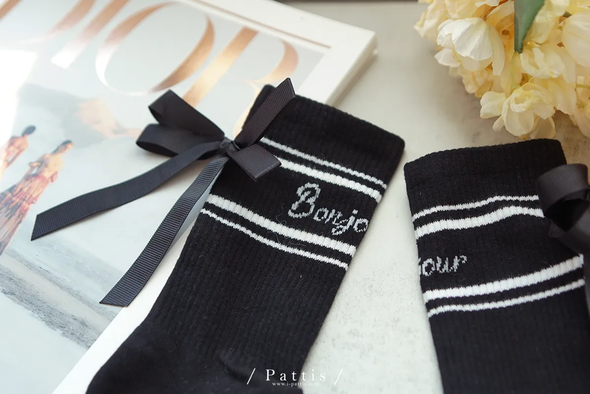 法式蝴蝶結綁帶字母短襪(白/咖啡/黑)
