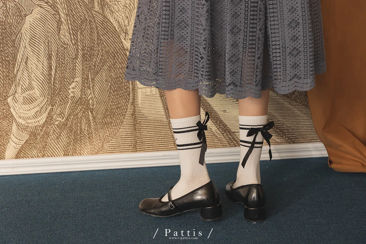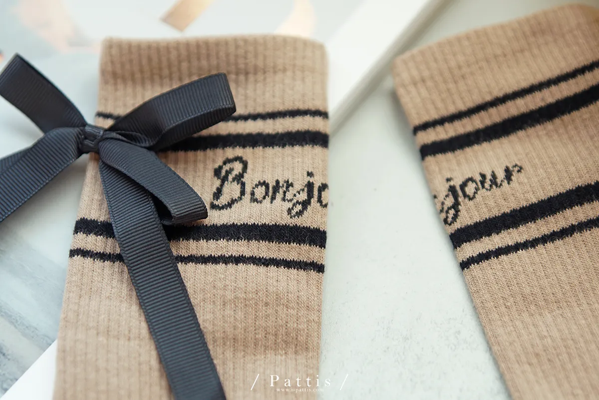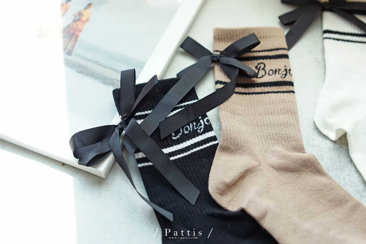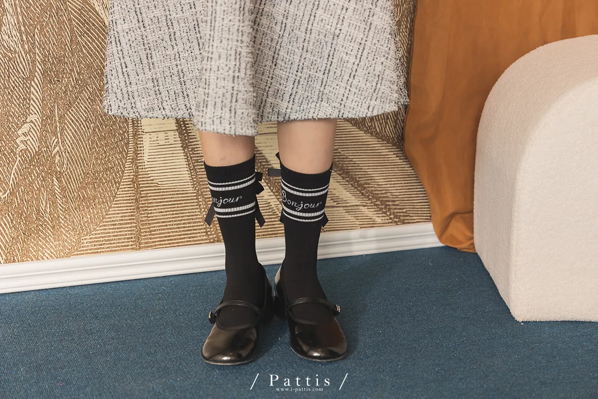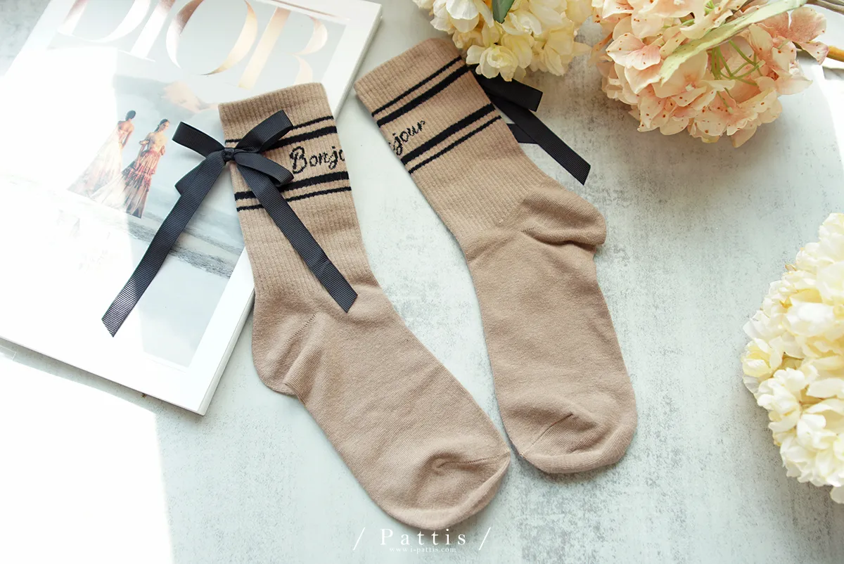 法式蝴蝶結綁帶字母短襪(白/咖啡/黑)