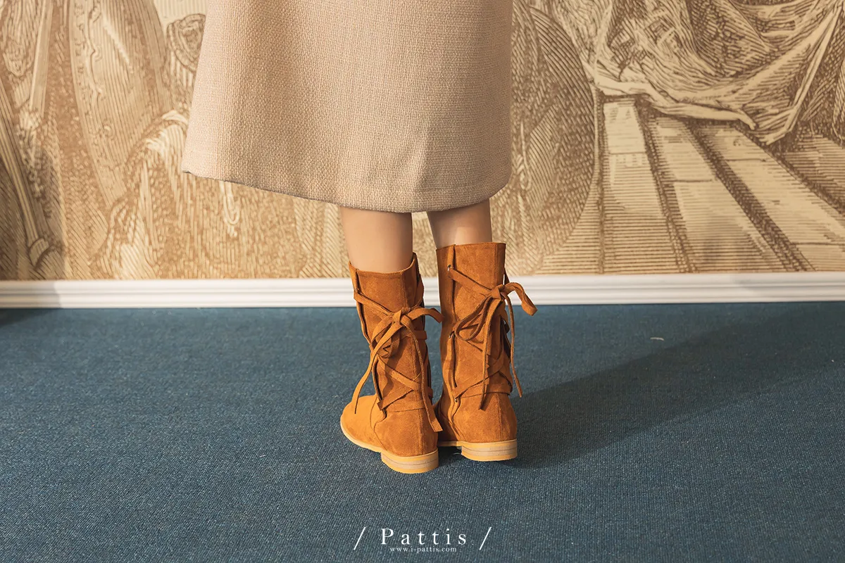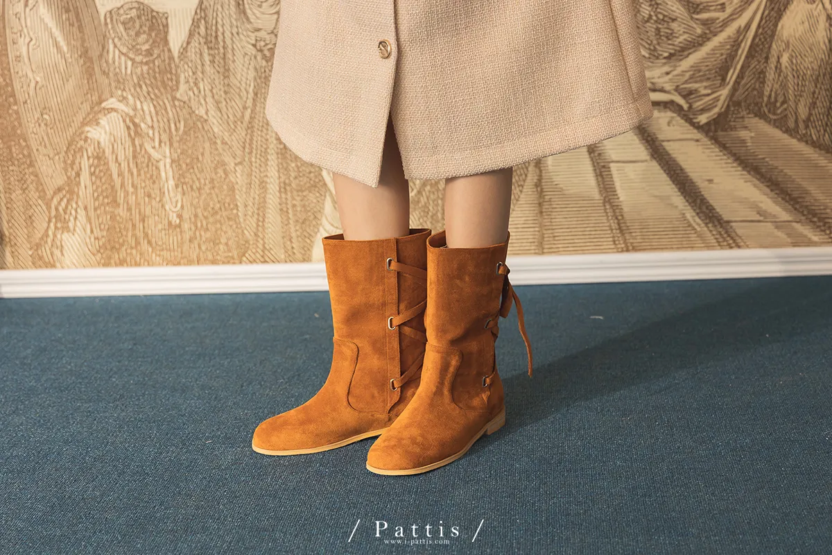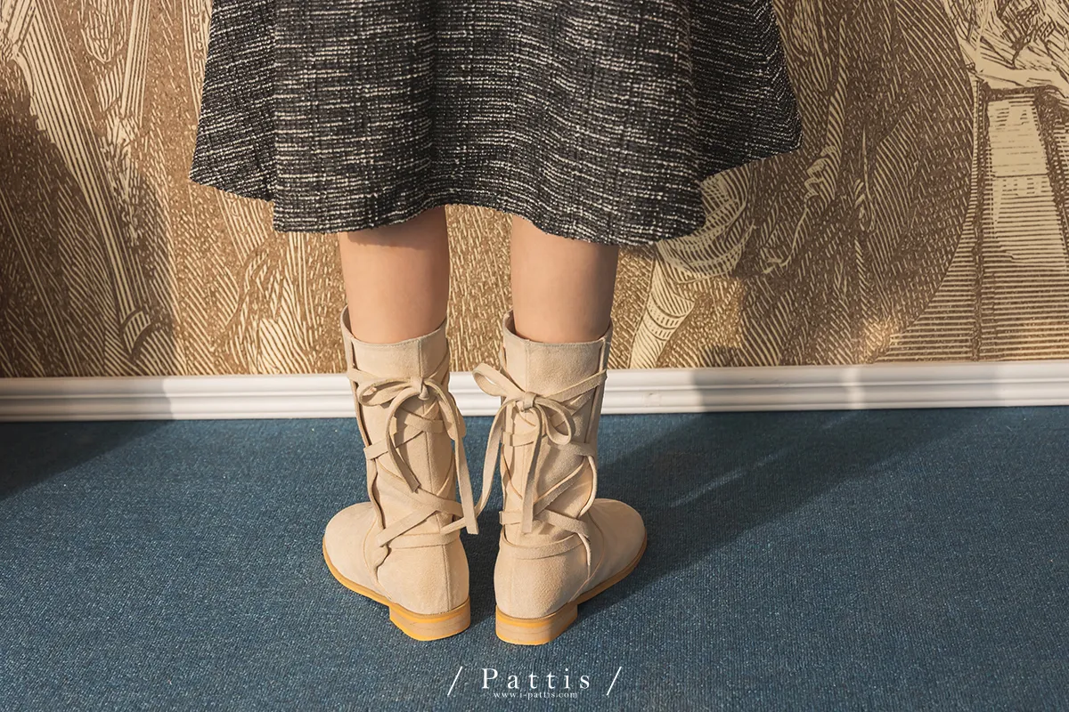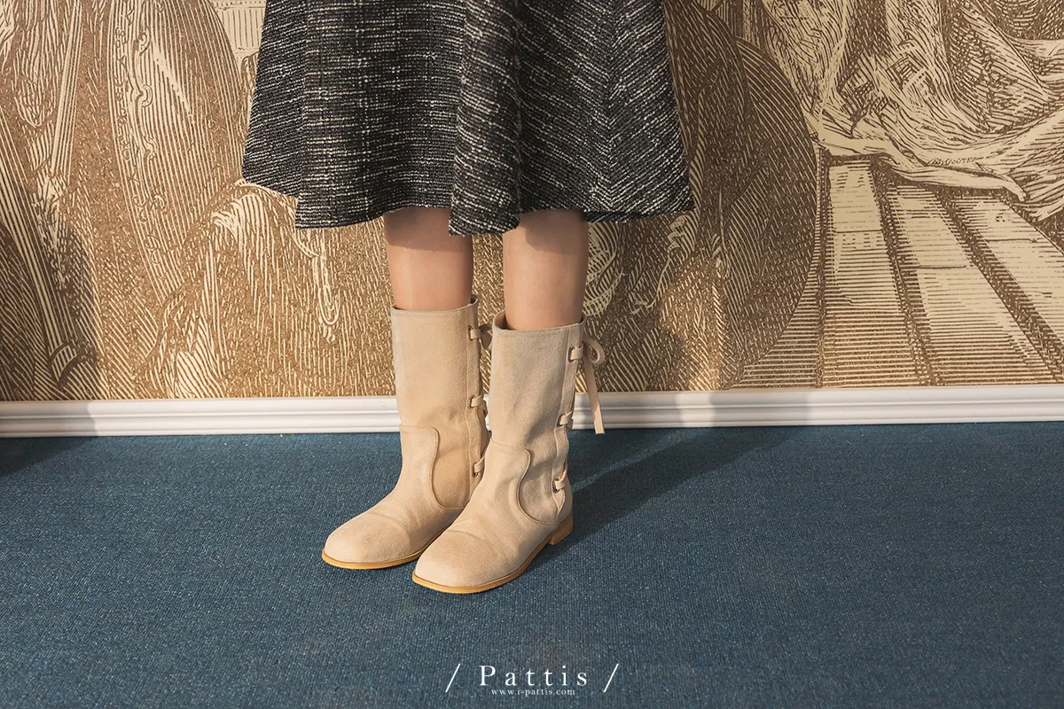 (現貨 - 駝棕24.0 ) 後交叉蝴蝶結麂皮中筒靴(米白/駝棕)
