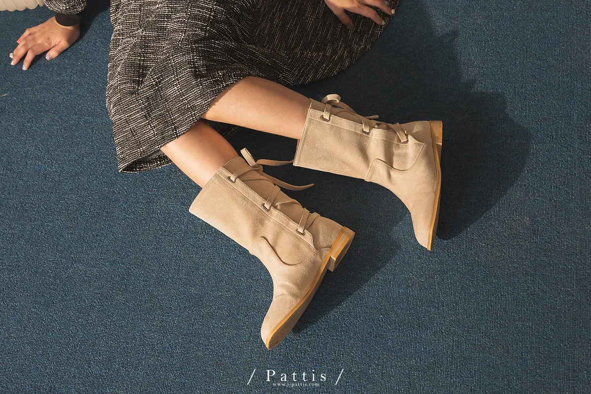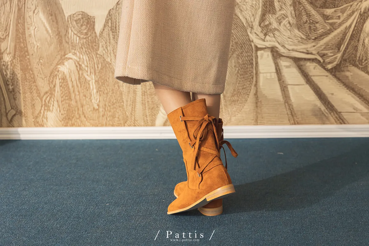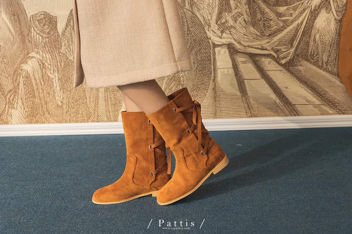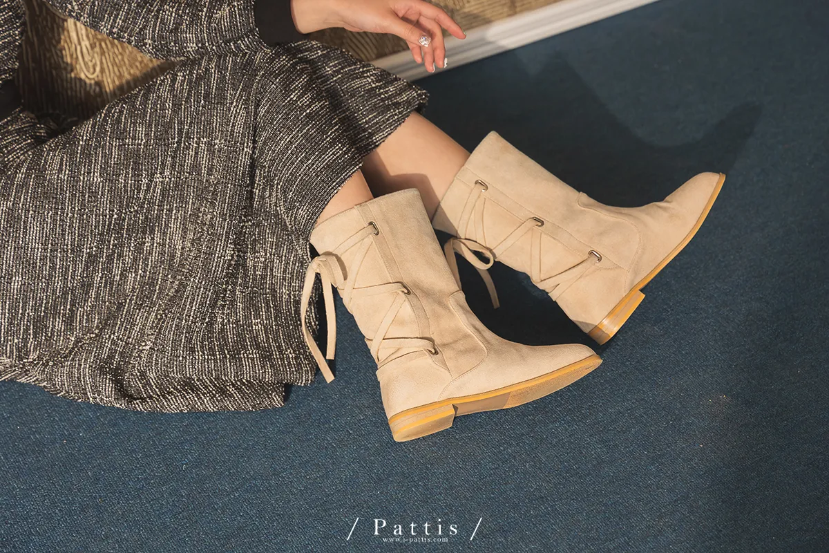 (現貨 - 駝棕24.0 ) 後交叉蝴蝶結麂皮中筒靴(米白/駝棕)