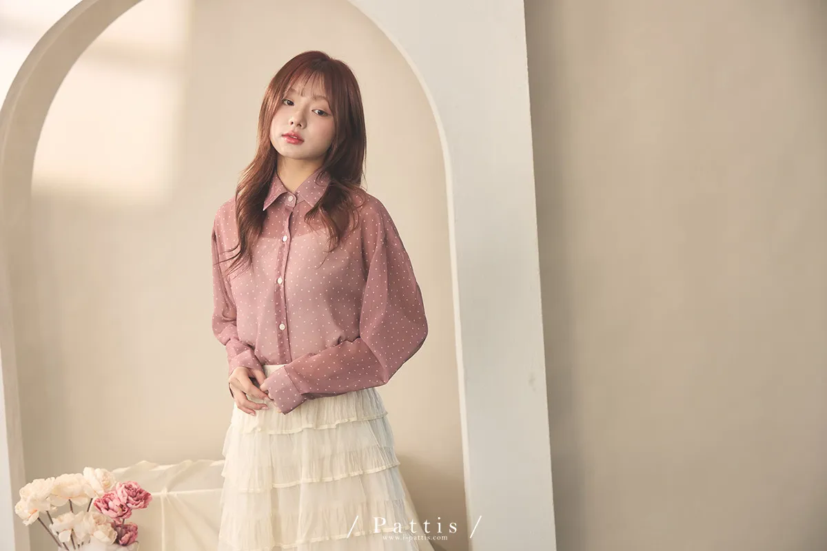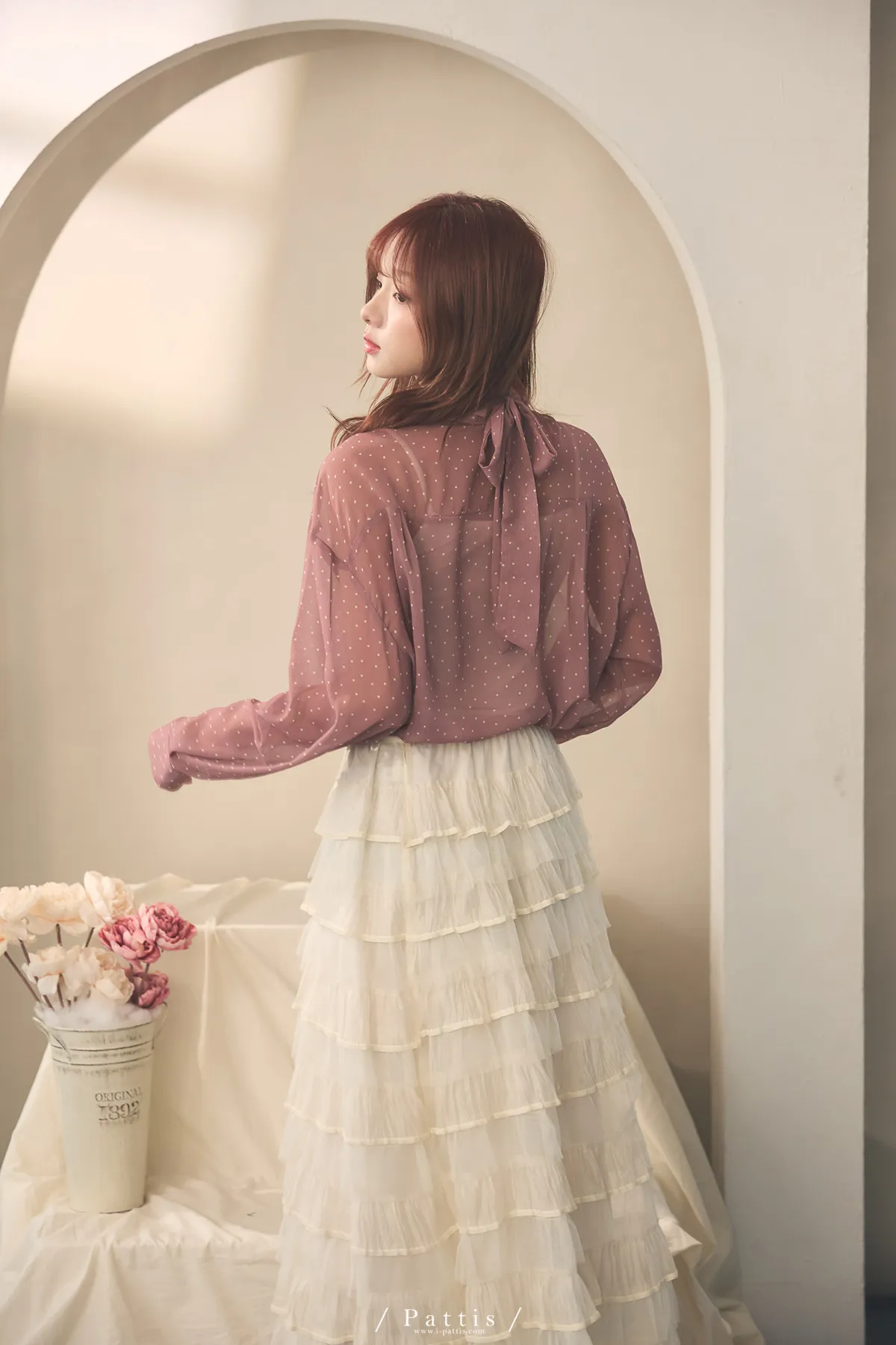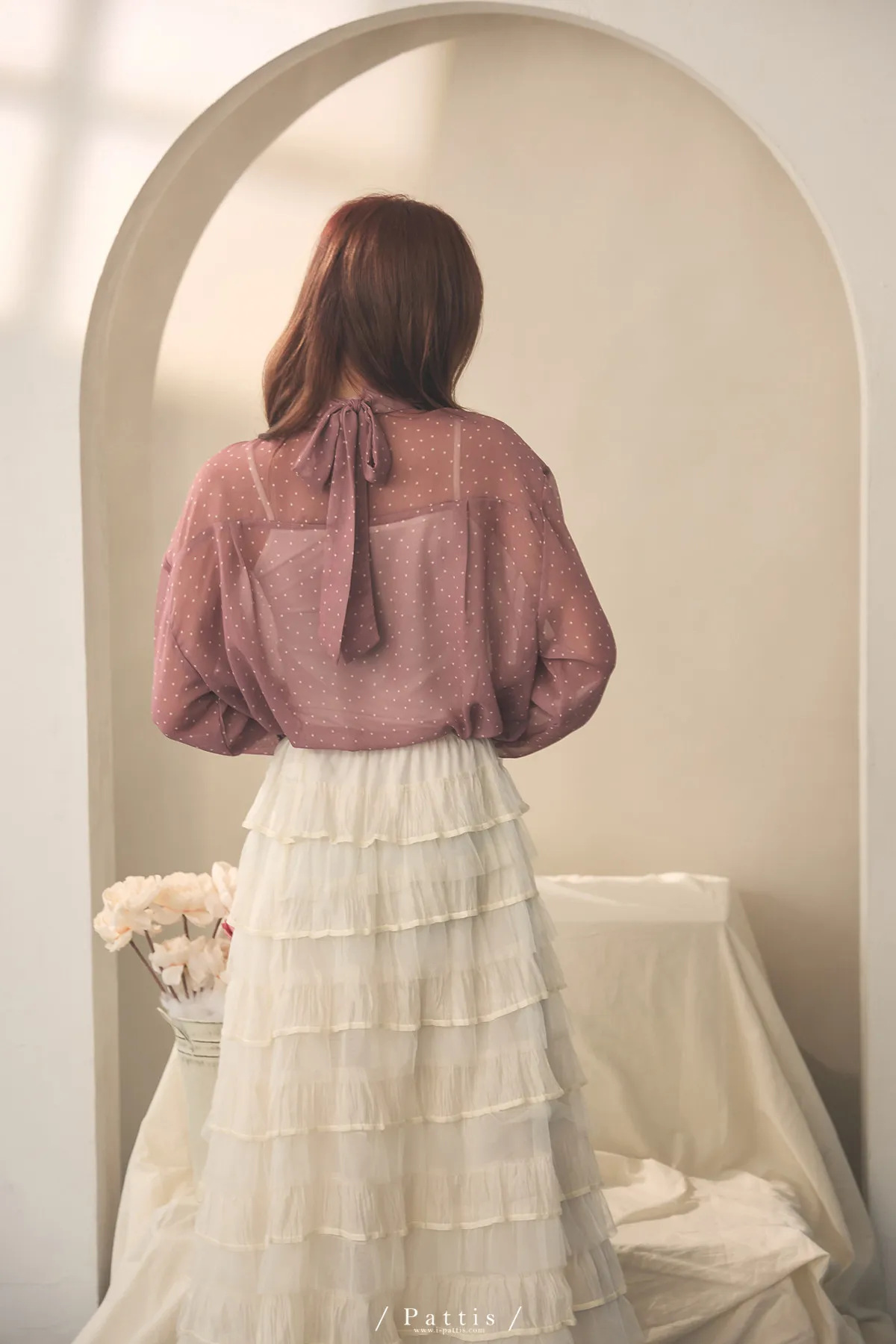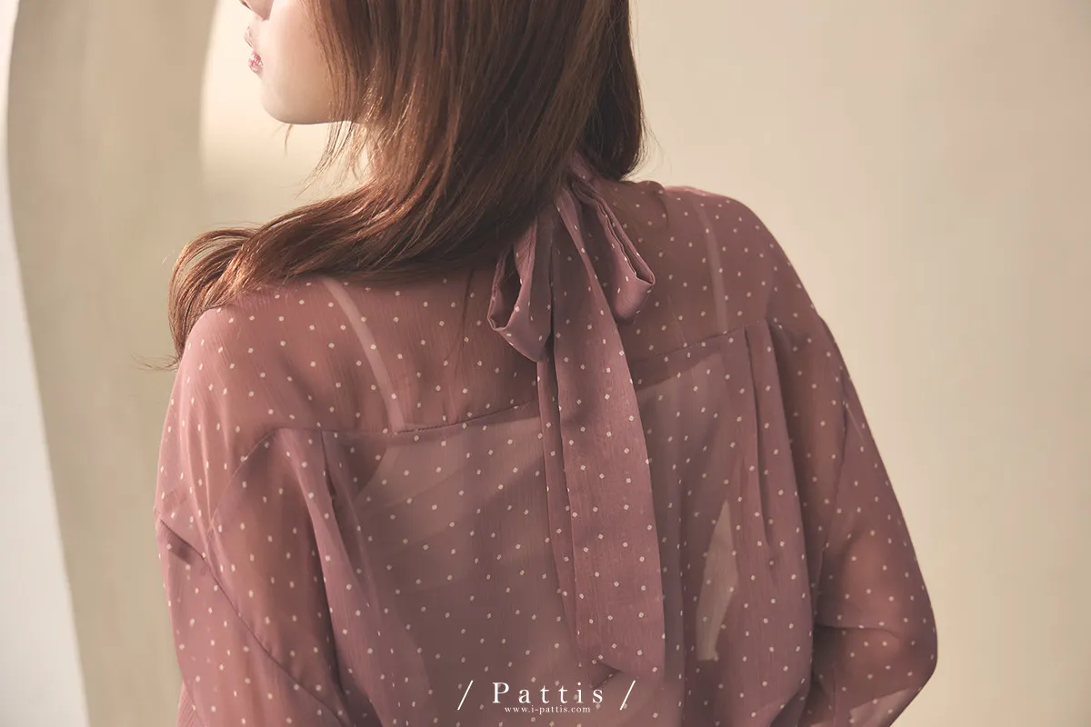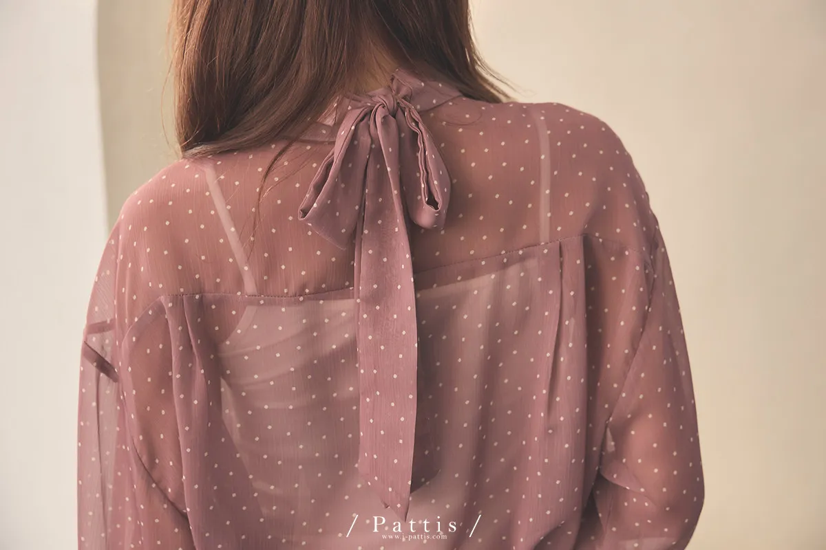 (現貨)後頸是我的領地 | 後領巾綁帶點點透肌襯衫上衣(深粉)