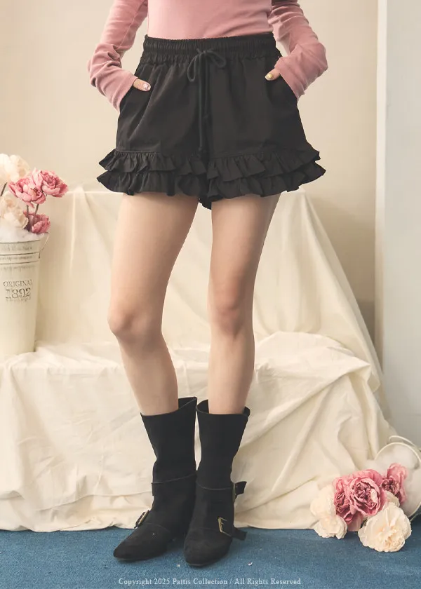 英倫蛋糕店 | 抽繩雙層傘狀荷葉短褲(黑)