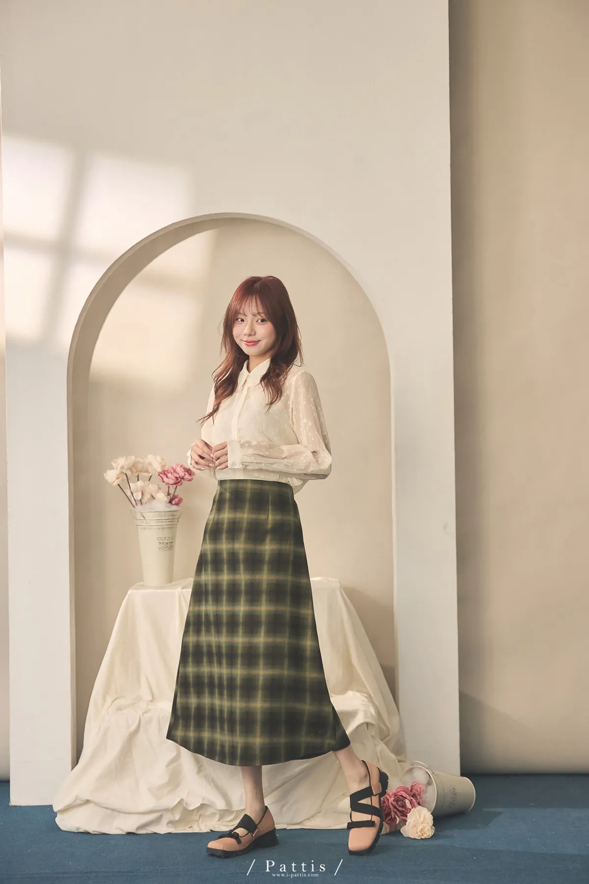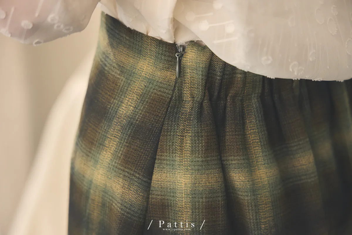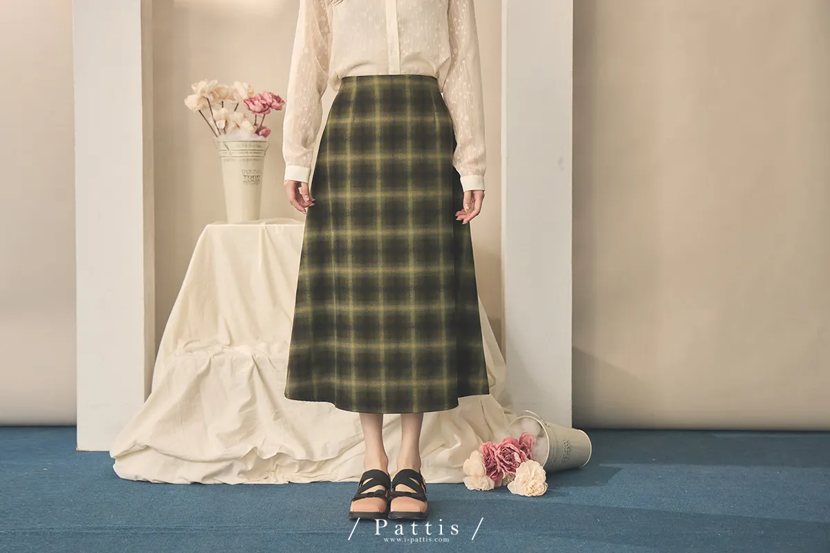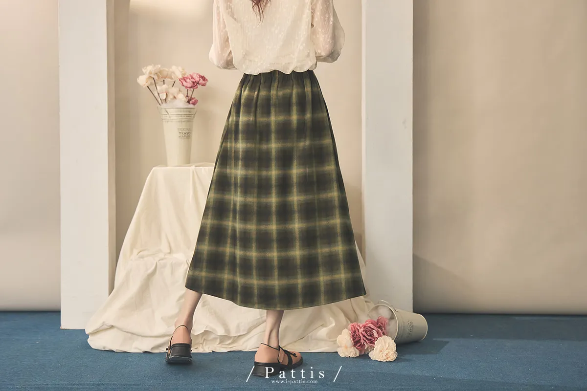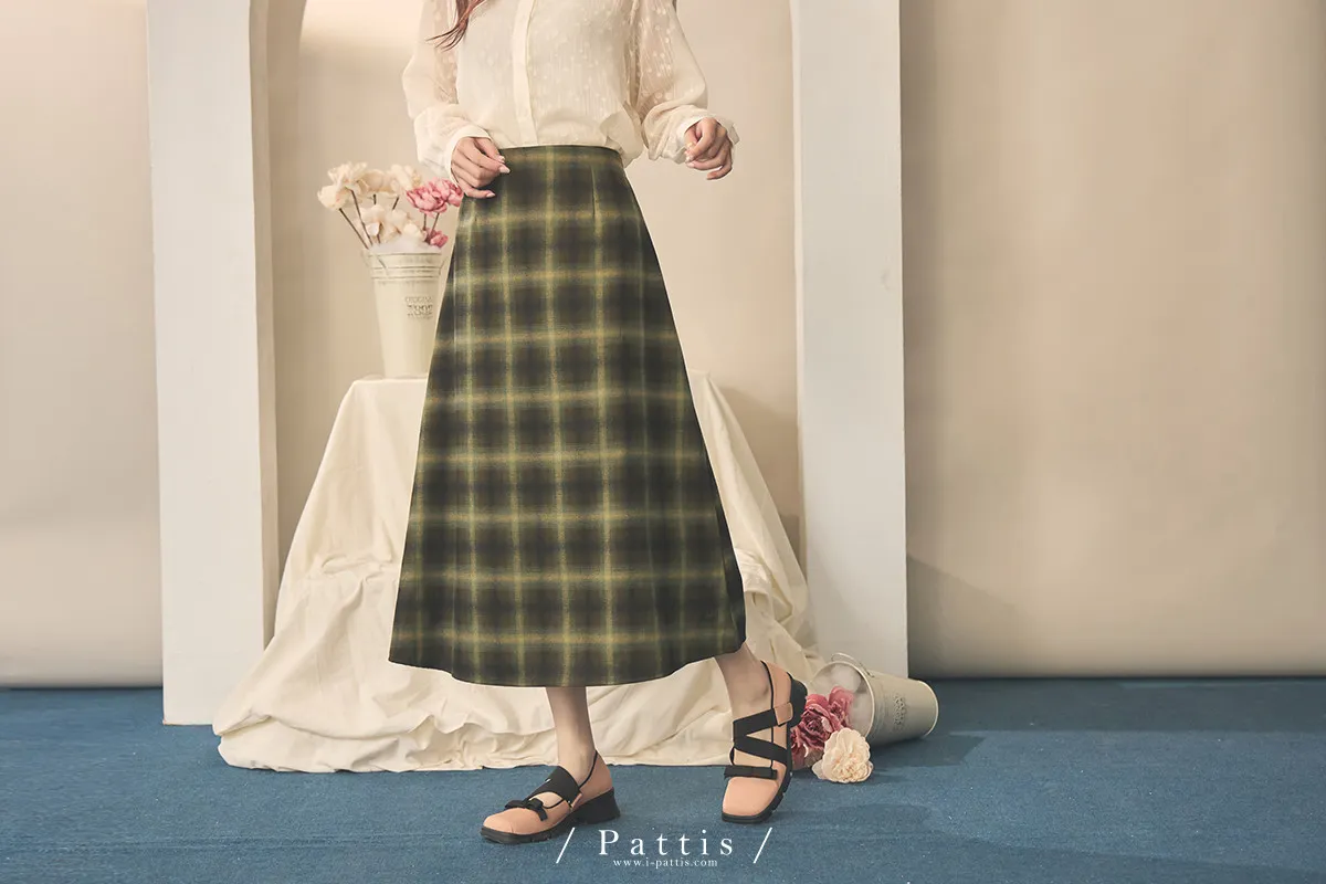 (現貨) *特*毛呢錯視感格紋長裙(黃綠)