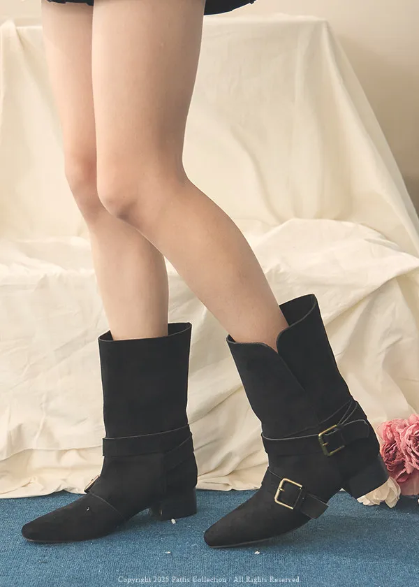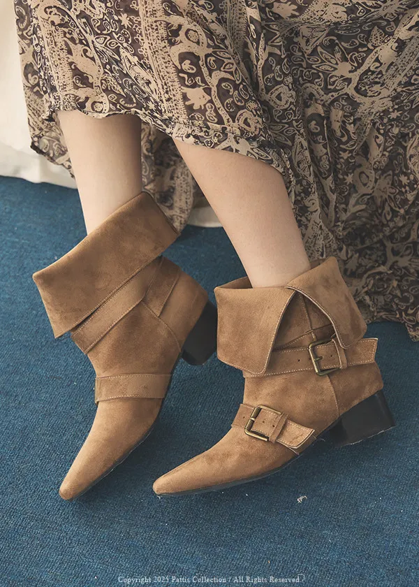 環扣繫帶尖頭低跟2way翻摺中筒短靴(駝棕/黑)