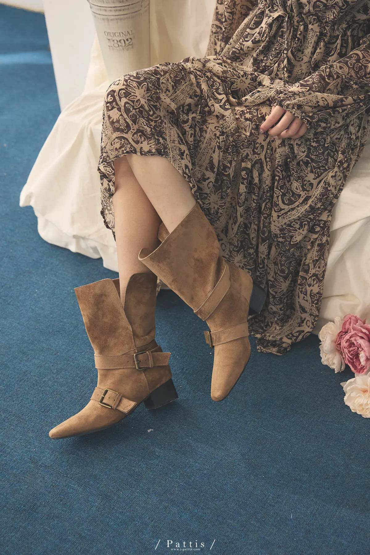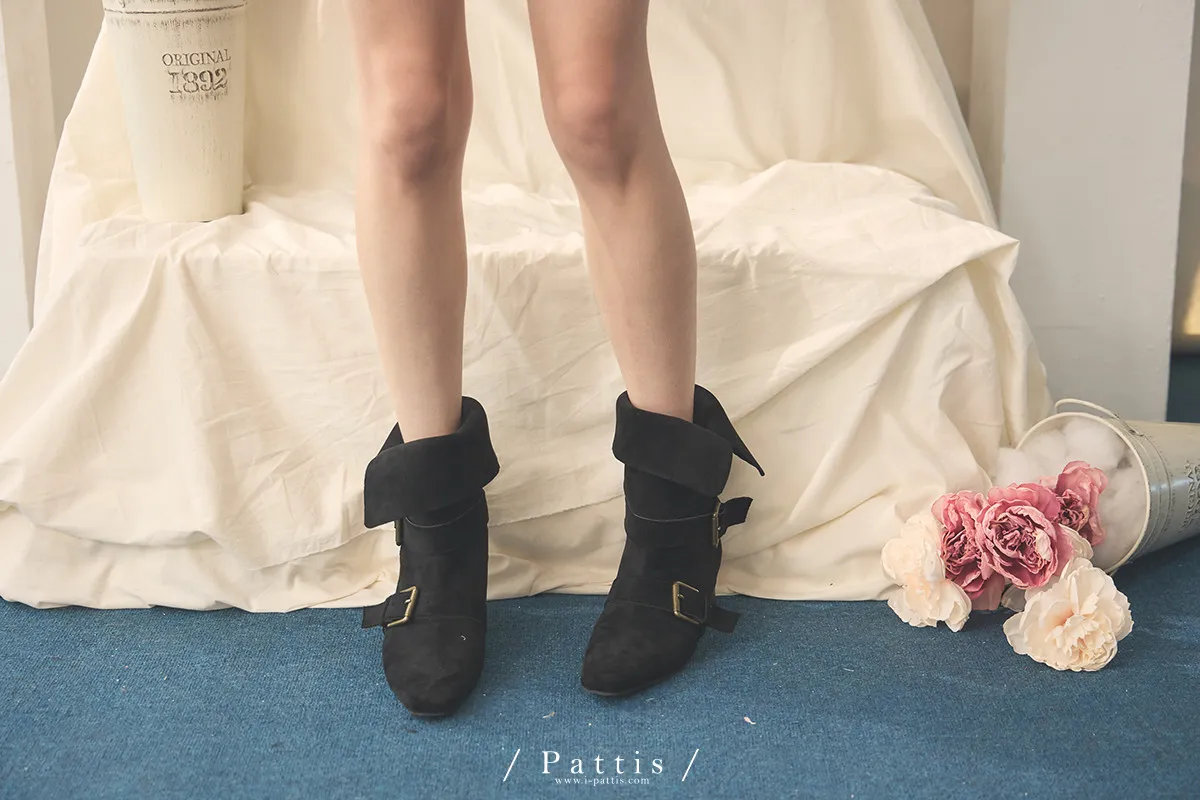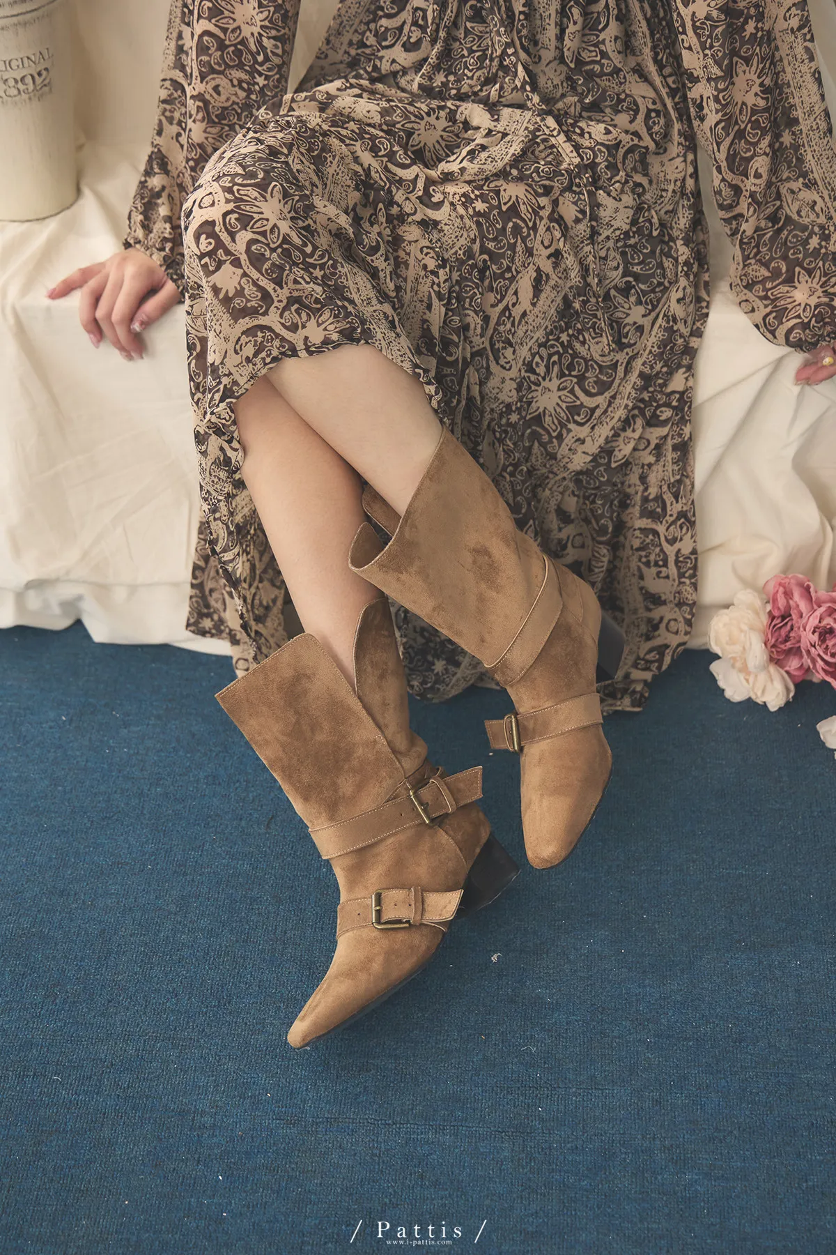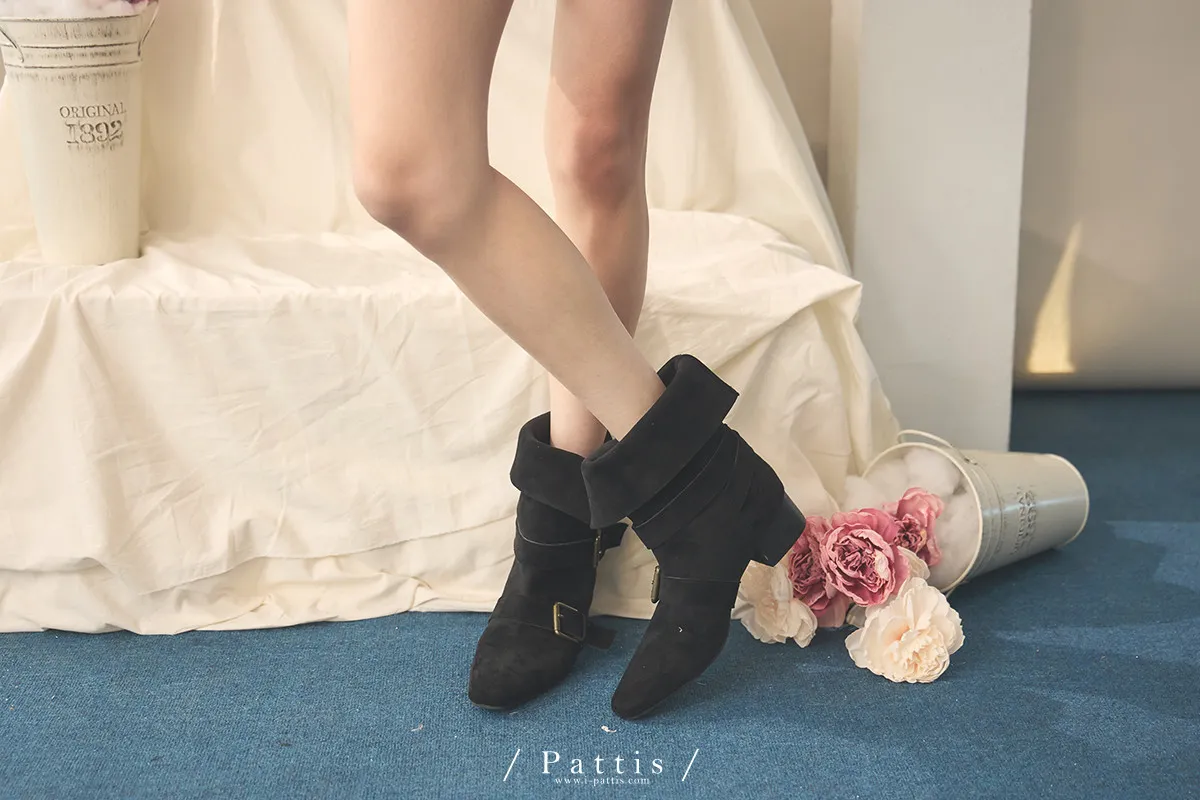 (現貨-陀棕24.0)環扣繫帶尖頭低跟2way翻摺中筒短靴(駝棕/黑)