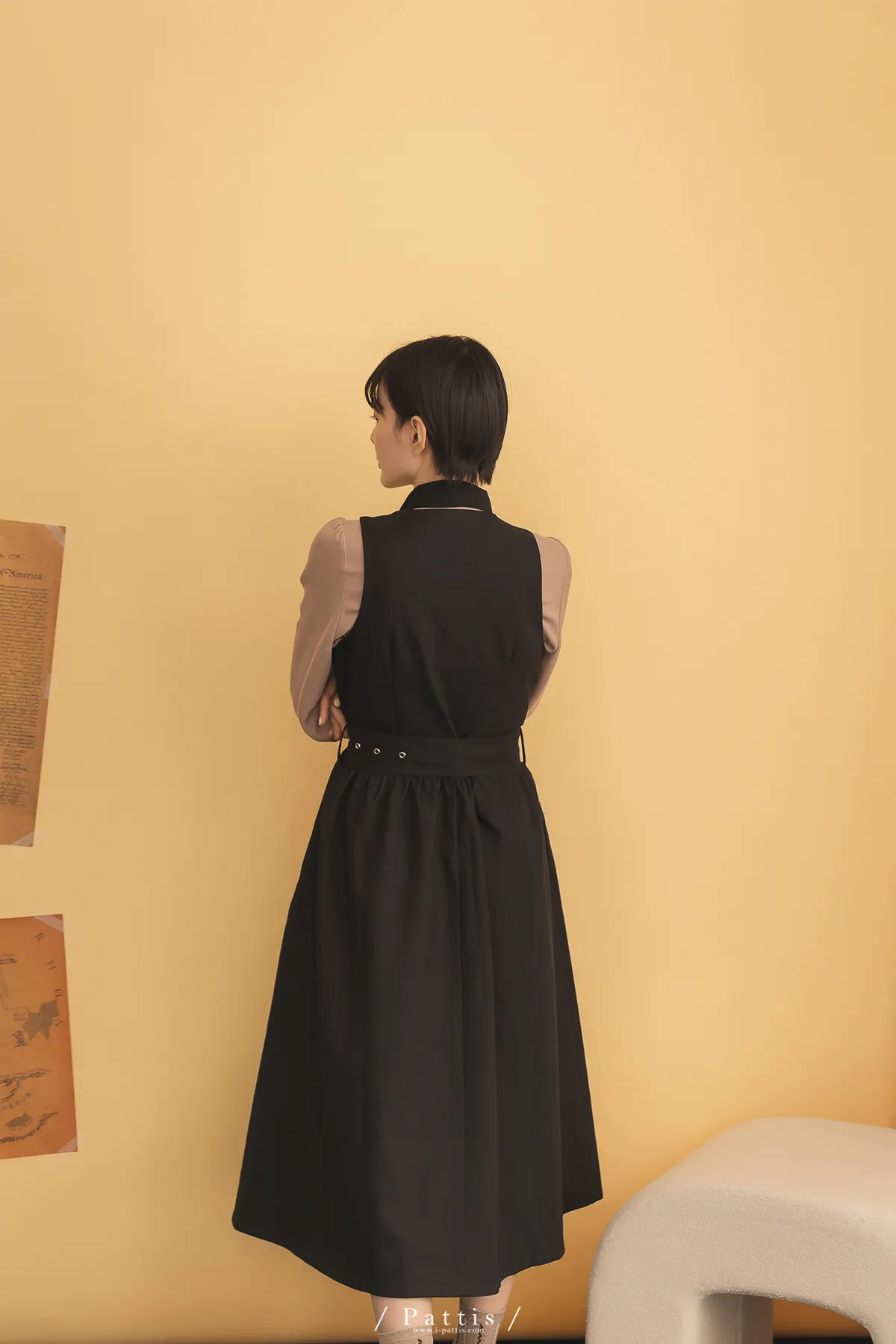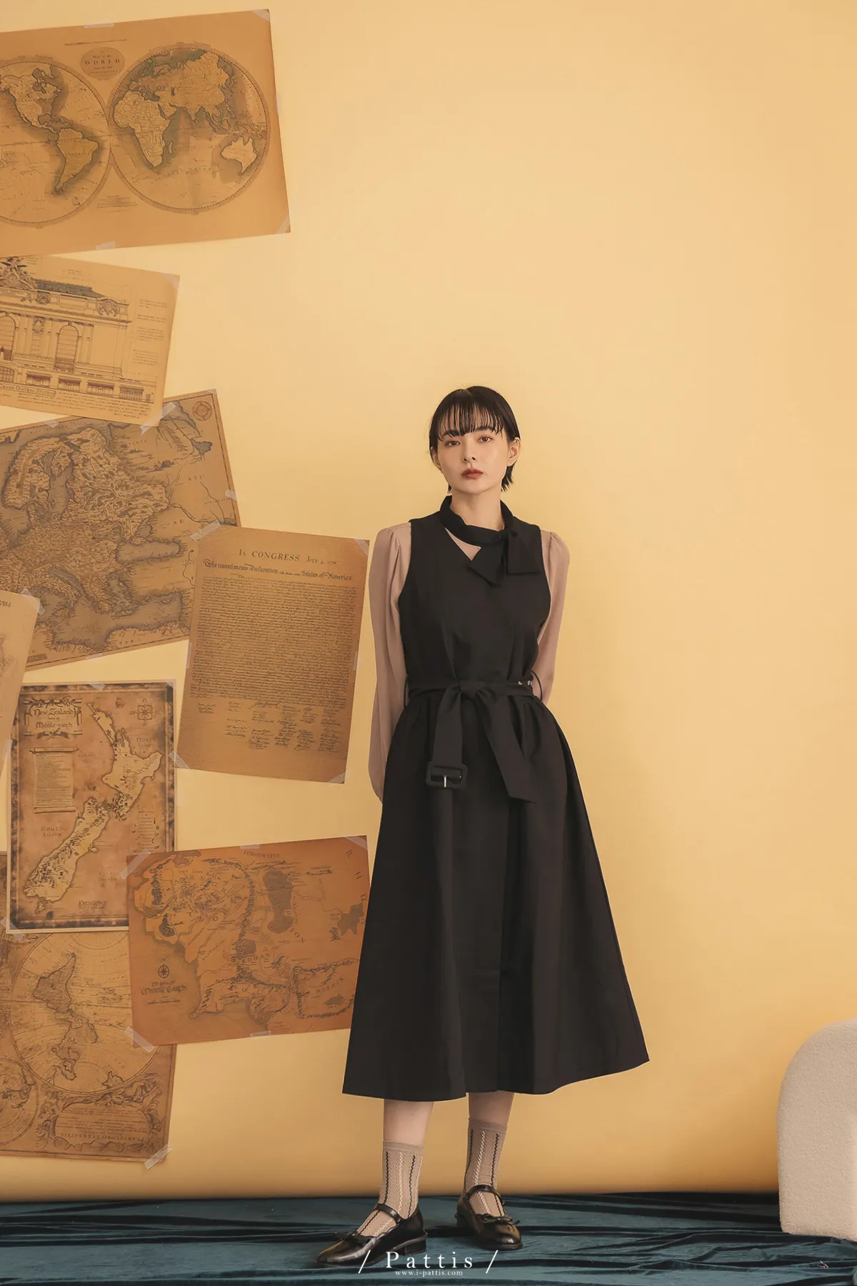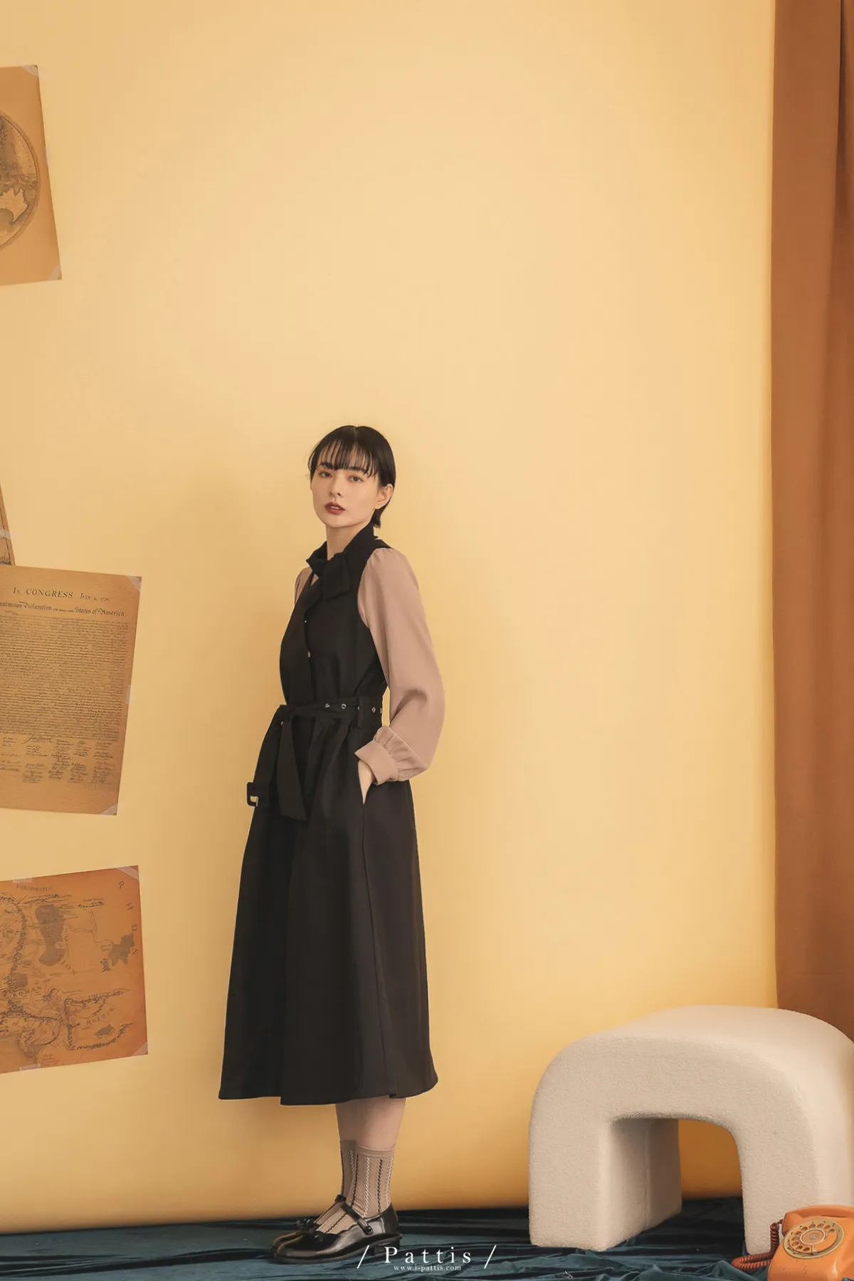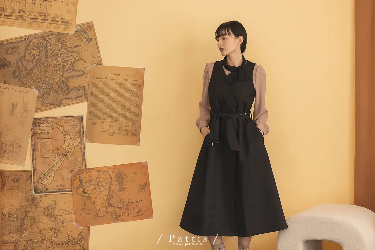 融雪前的山坡 | 挺版繫帶短風衣+V字背心洋裝set組(黑)