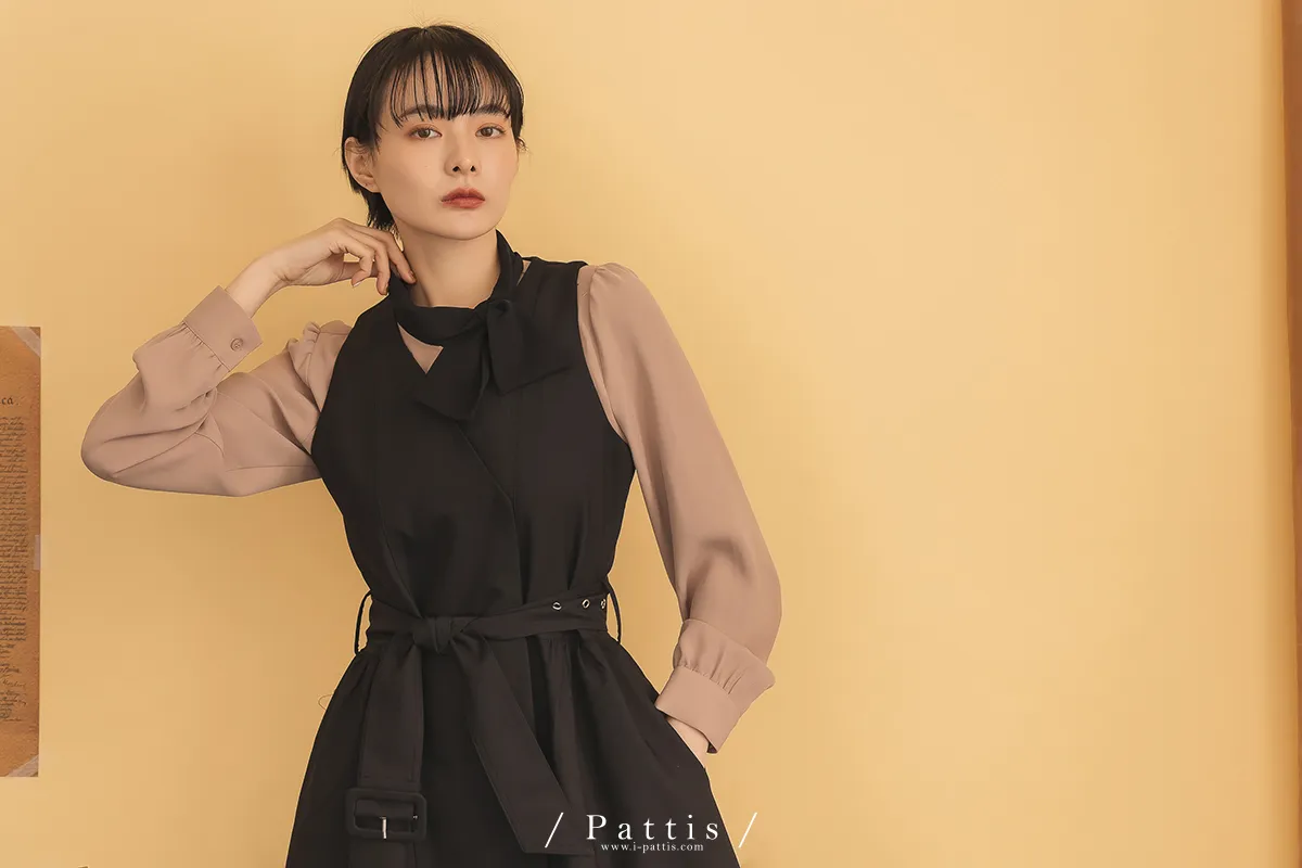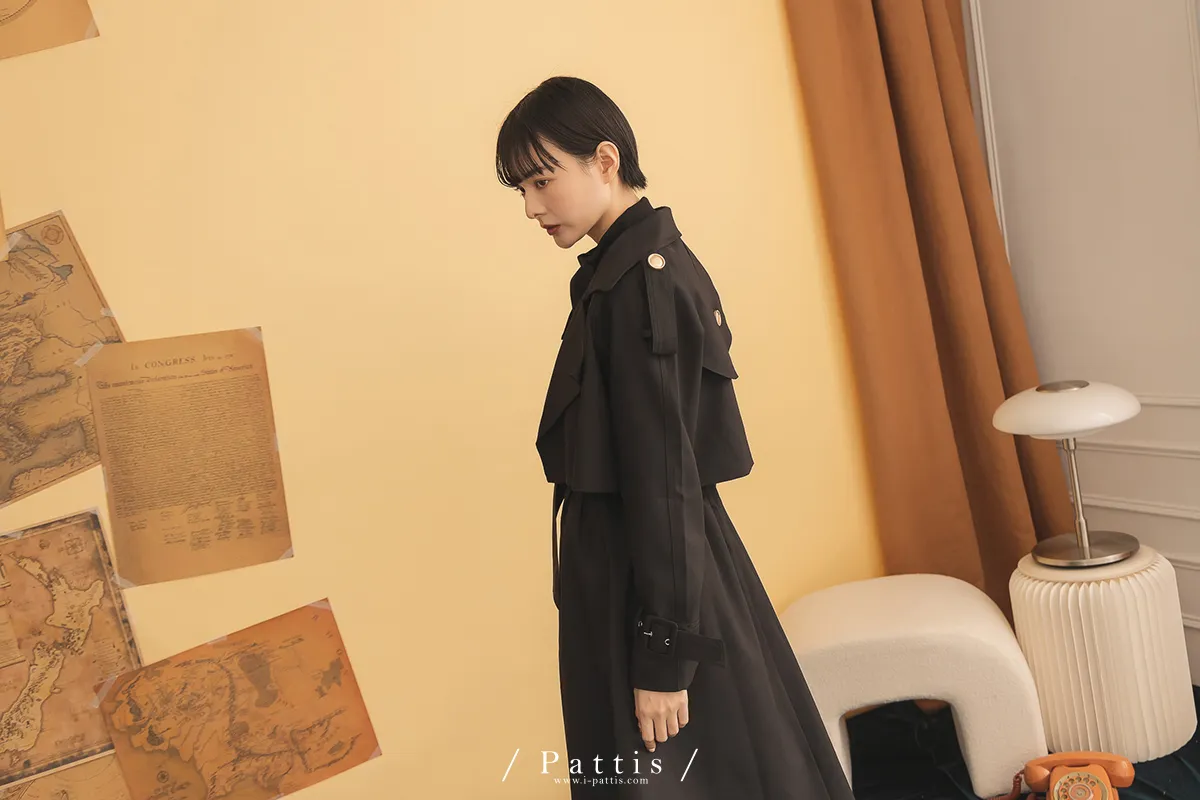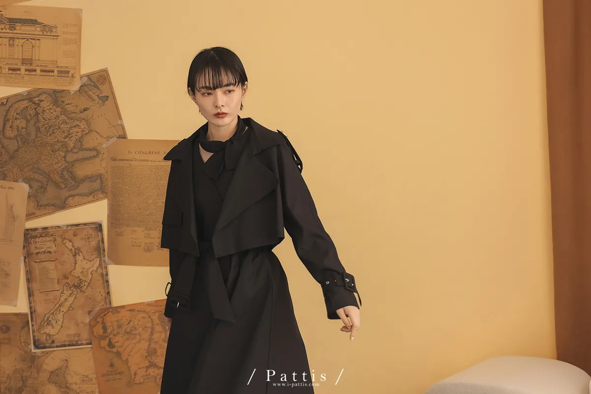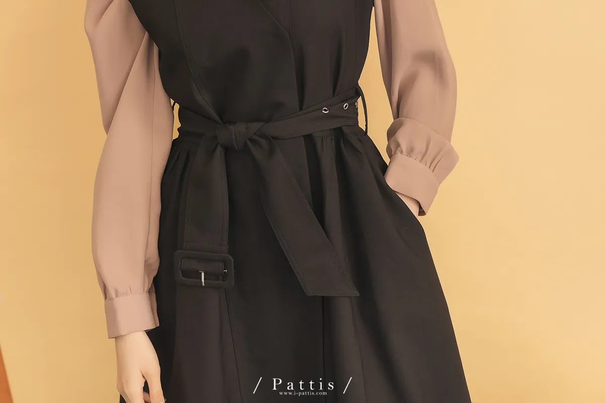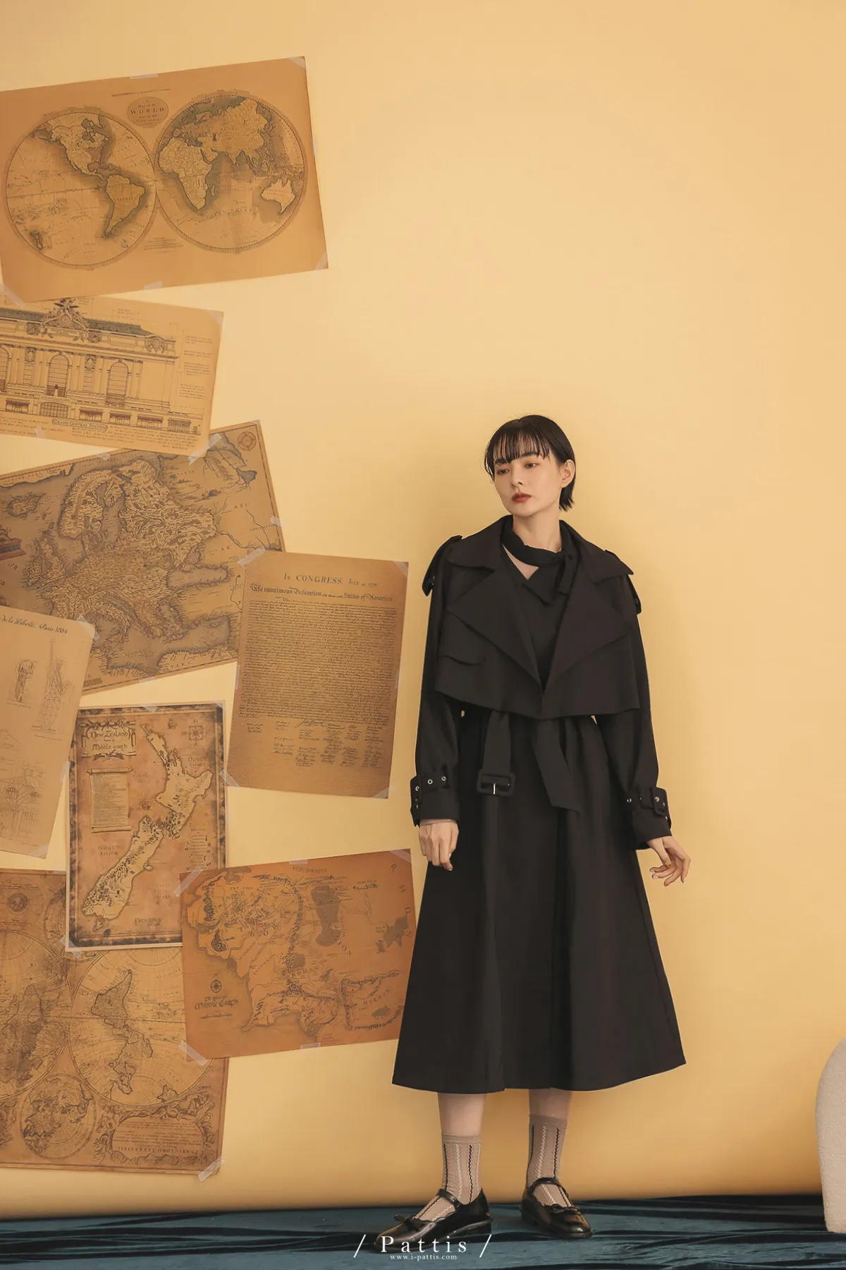 融雪前的山坡 | 挺版繫帶短風衣+V字背心洋裝set組(黑)