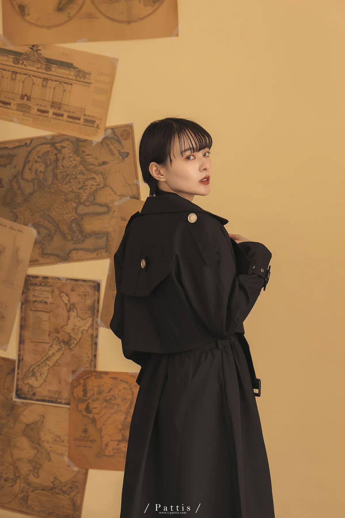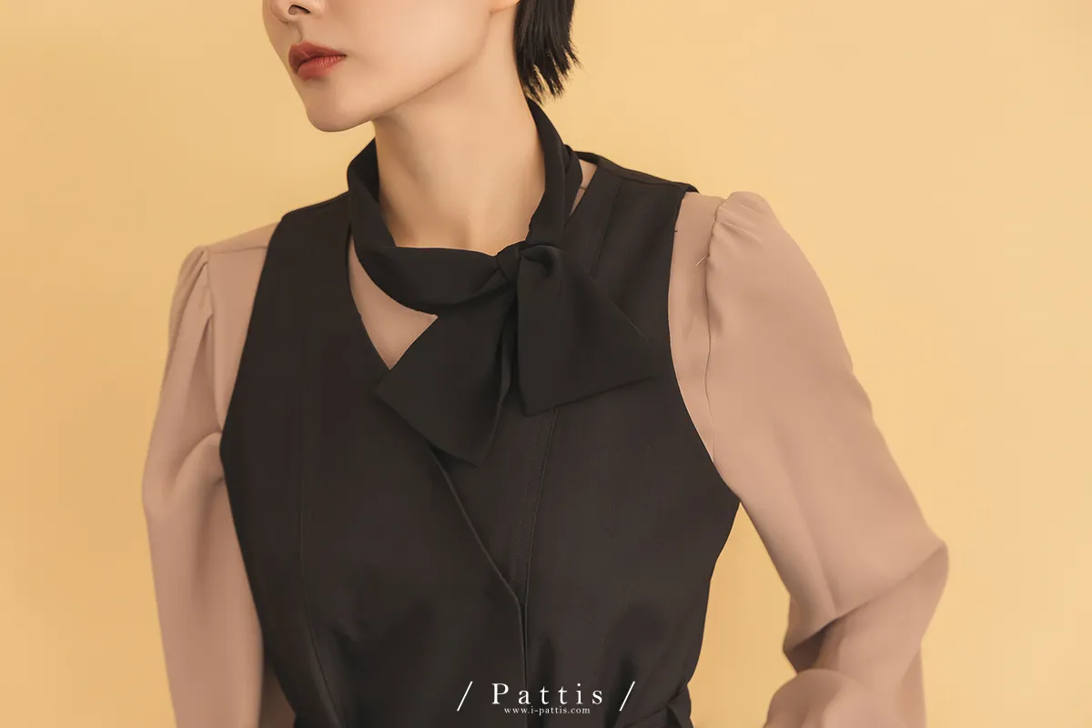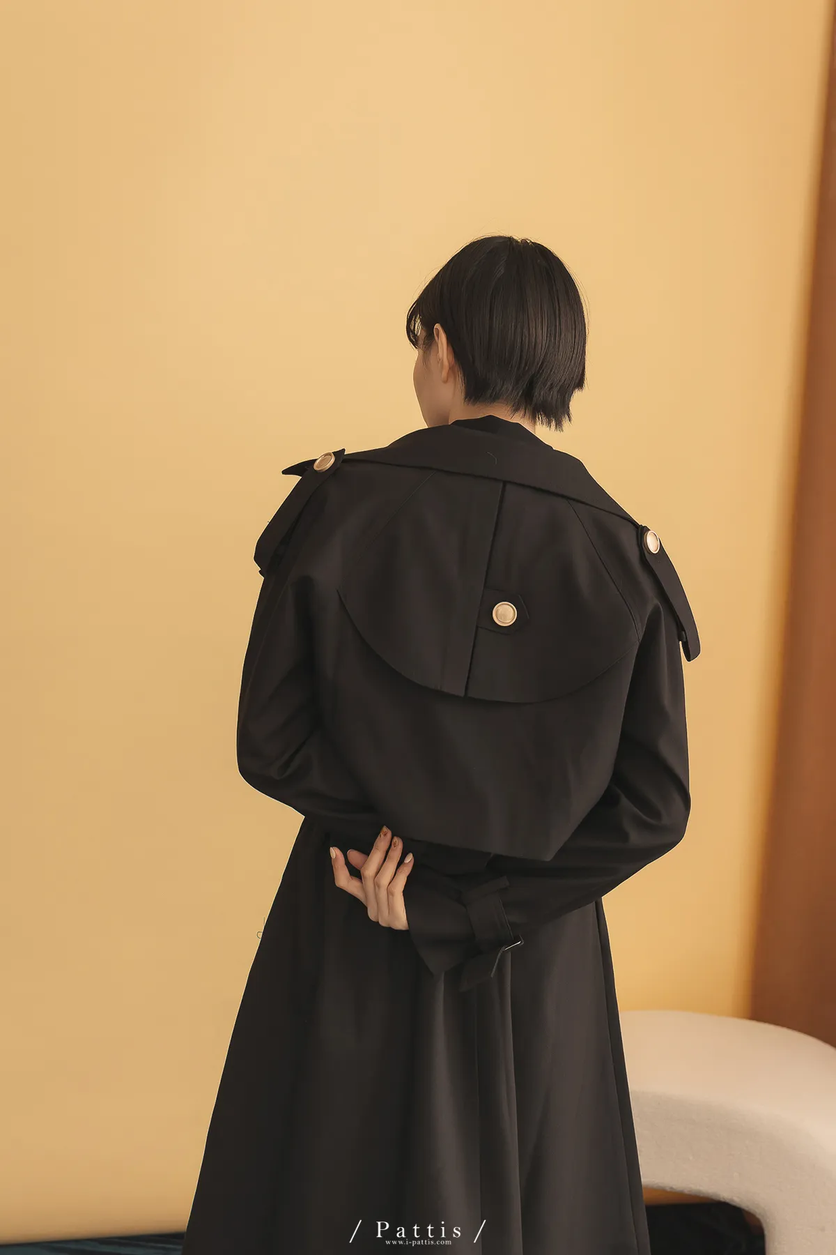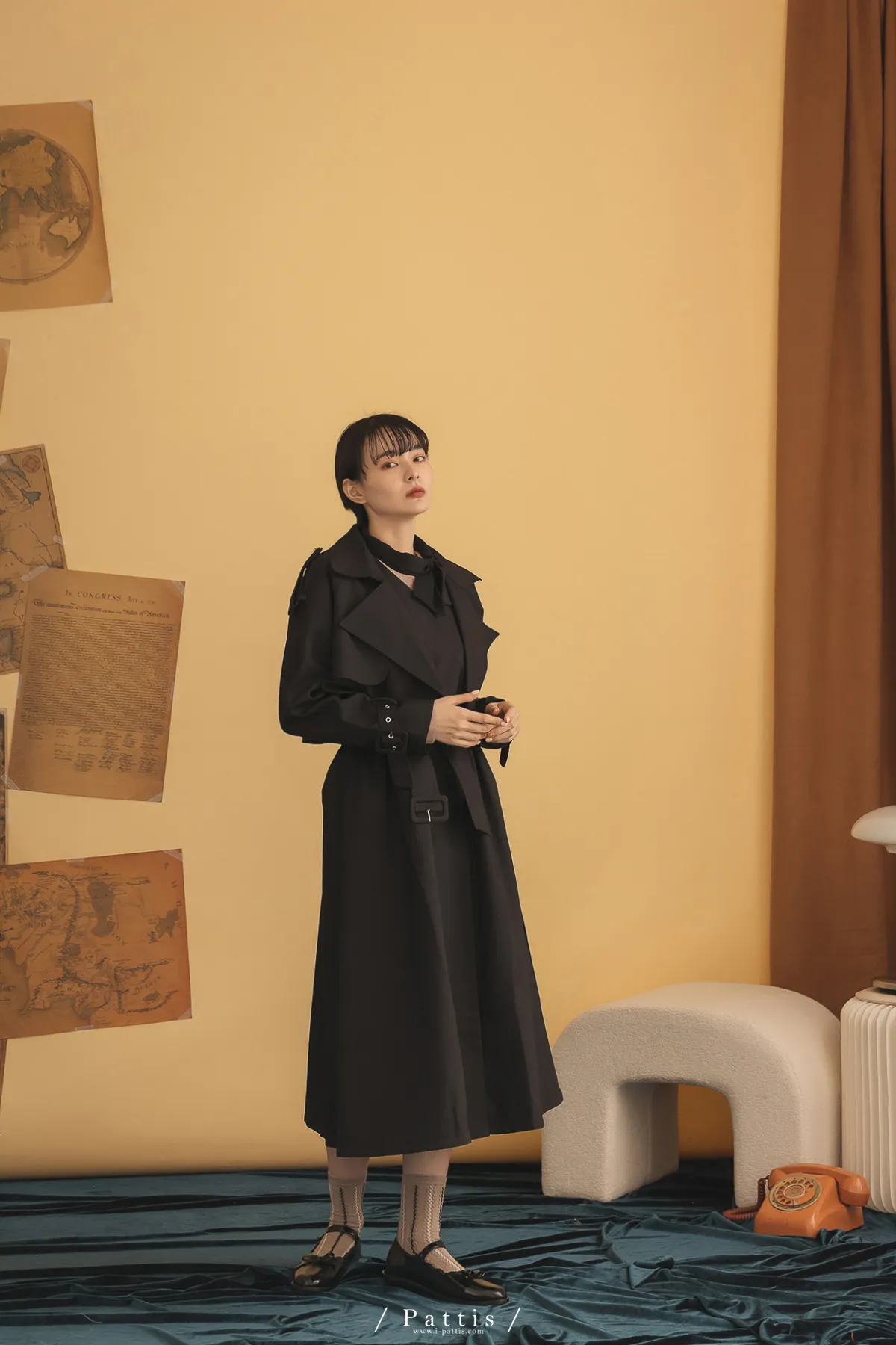 融雪前的山坡 | 挺版繫帶短風衣+V字背心洋裝set組(黑)