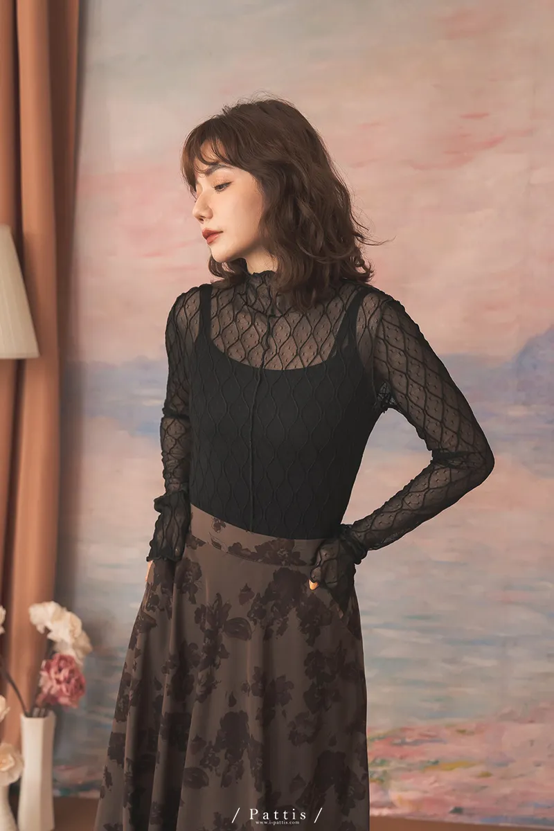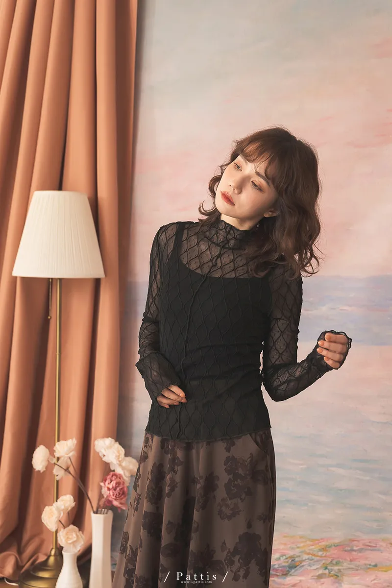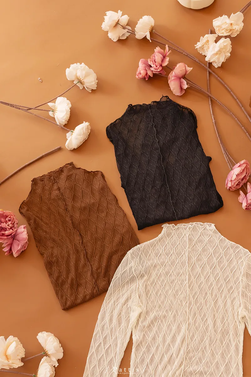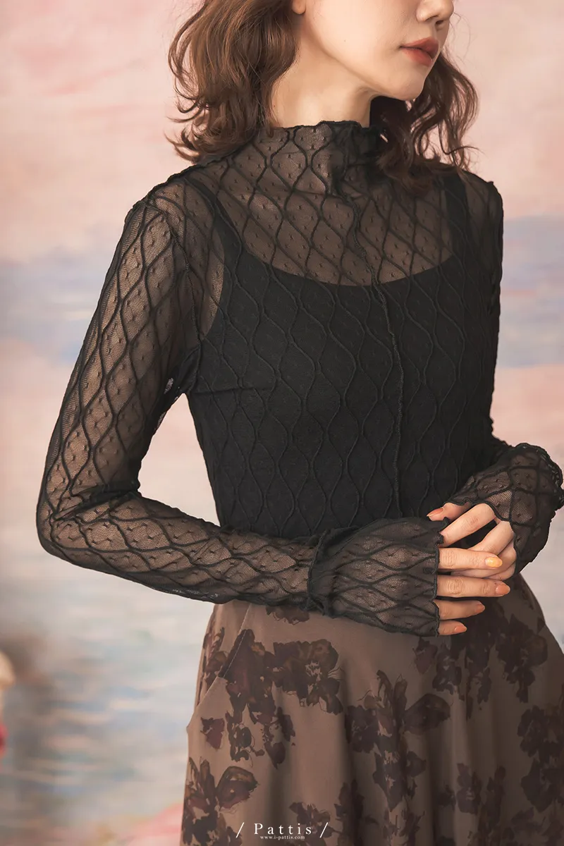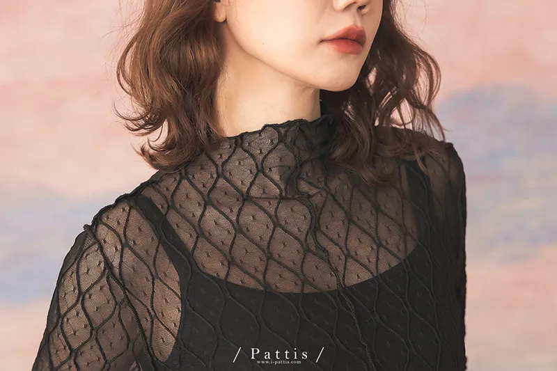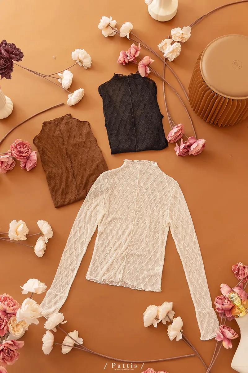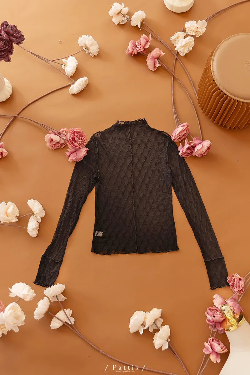 土星環宣言 | 水波紋透肌車線微高領上衣(墨水黑)