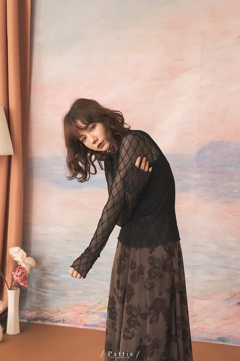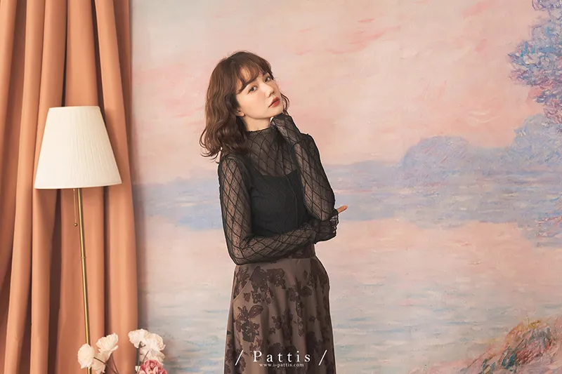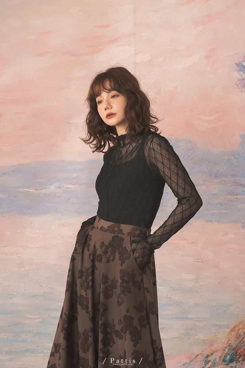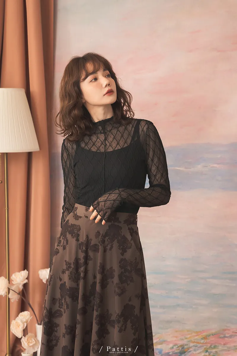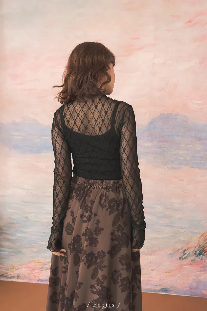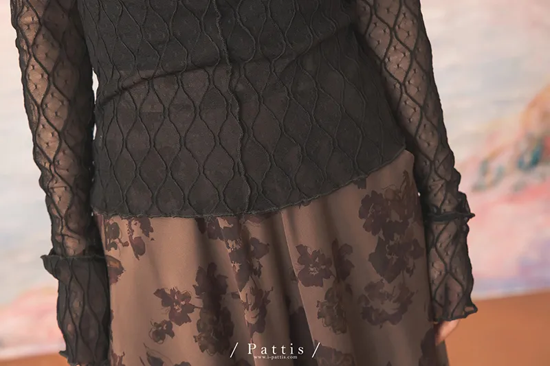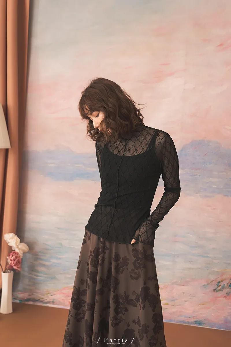 土星環宣言 | 水波紋透肌車線微高領上衣(墨水黑)