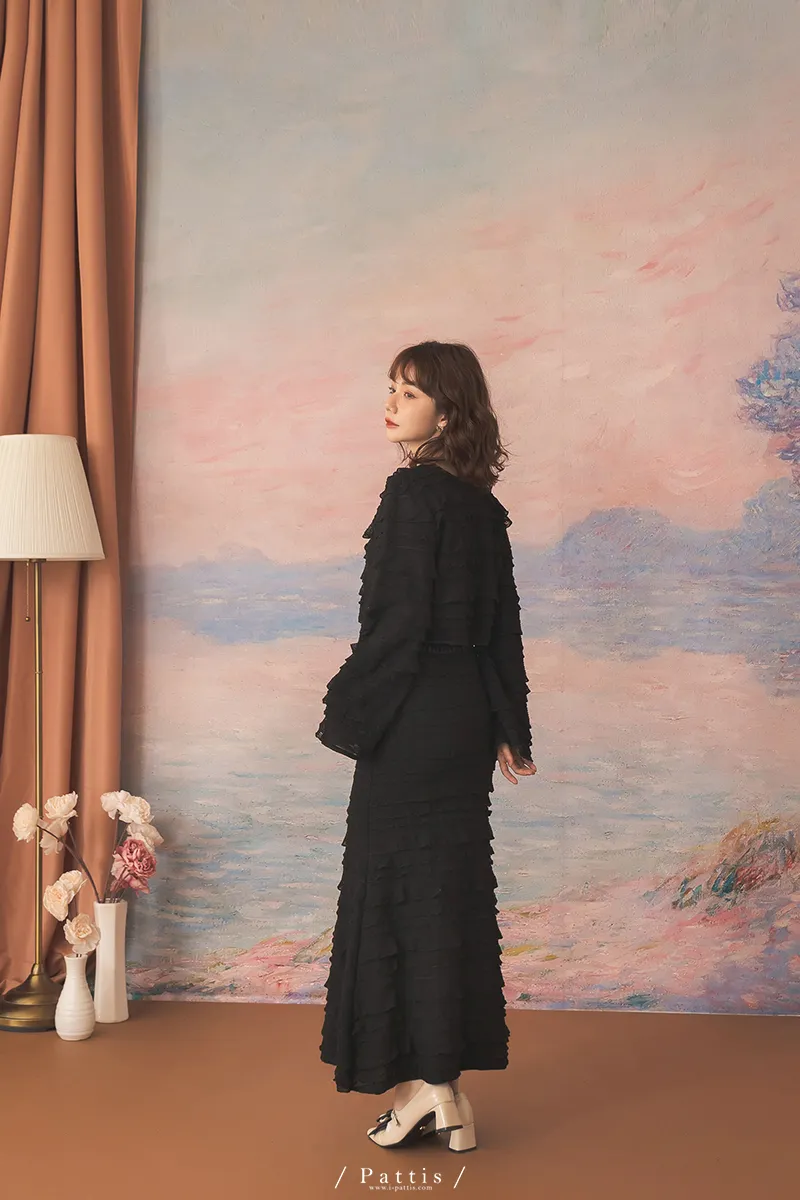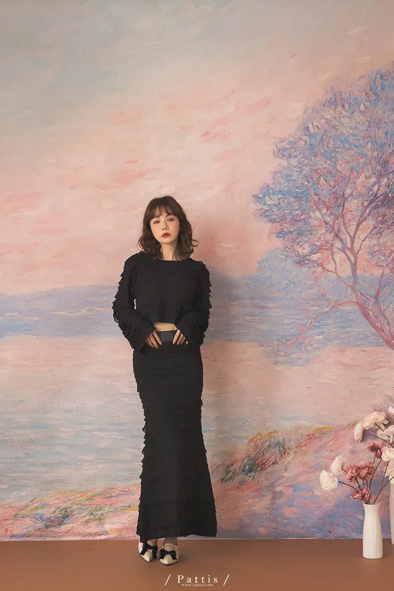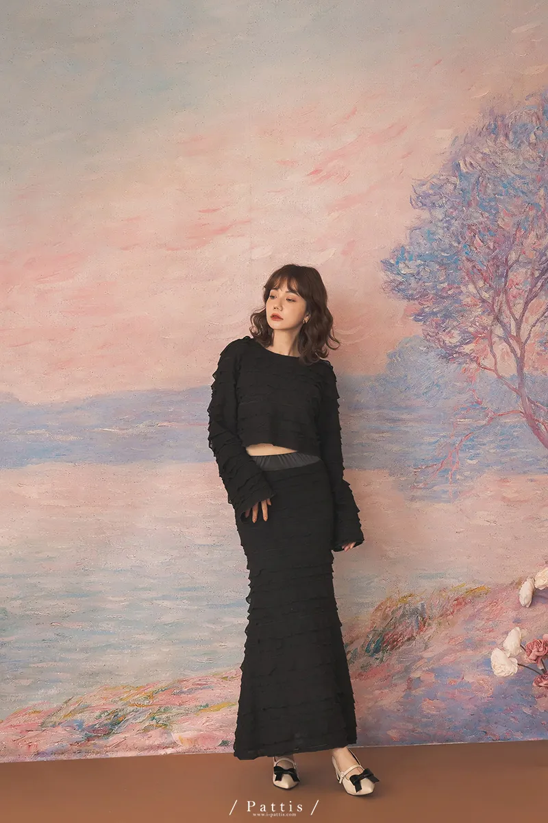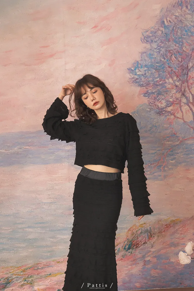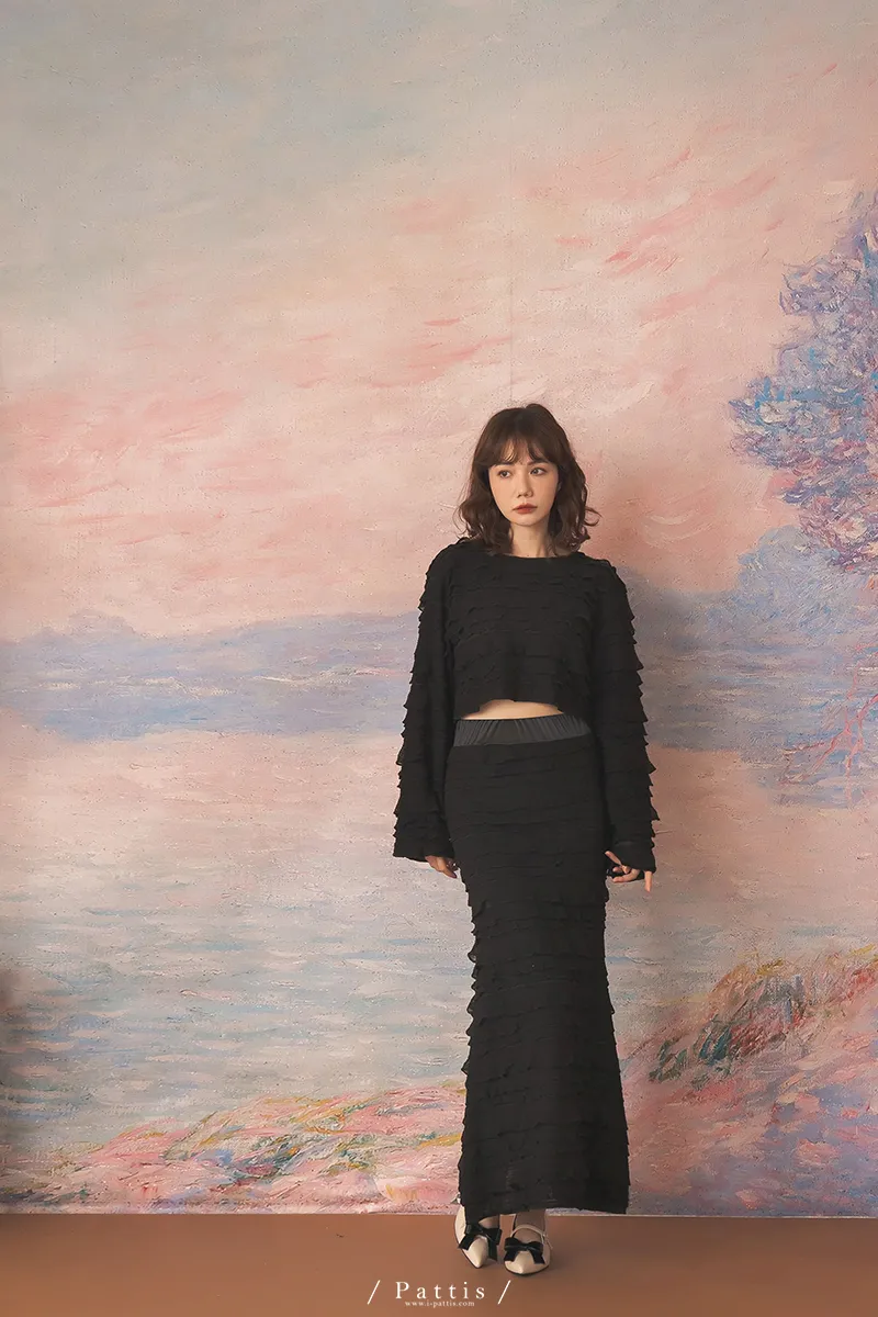 (現貨-上衣)月夜下小篆文|-可分售-波浪荷葉散袖短版上衣+長裙set組(黑)