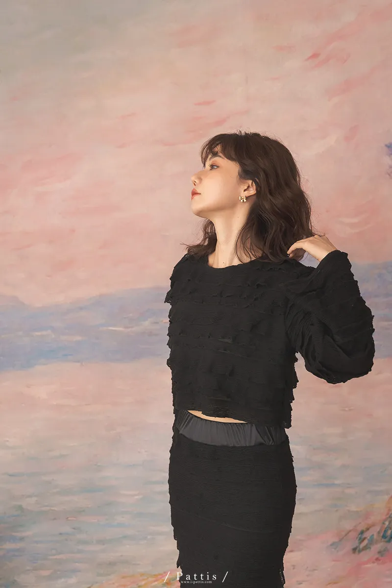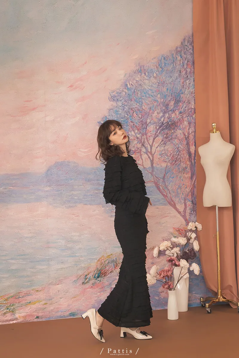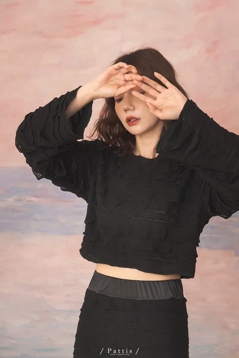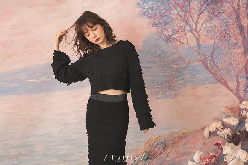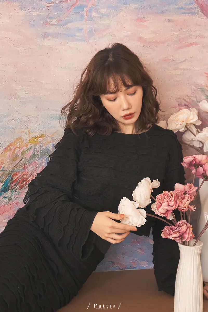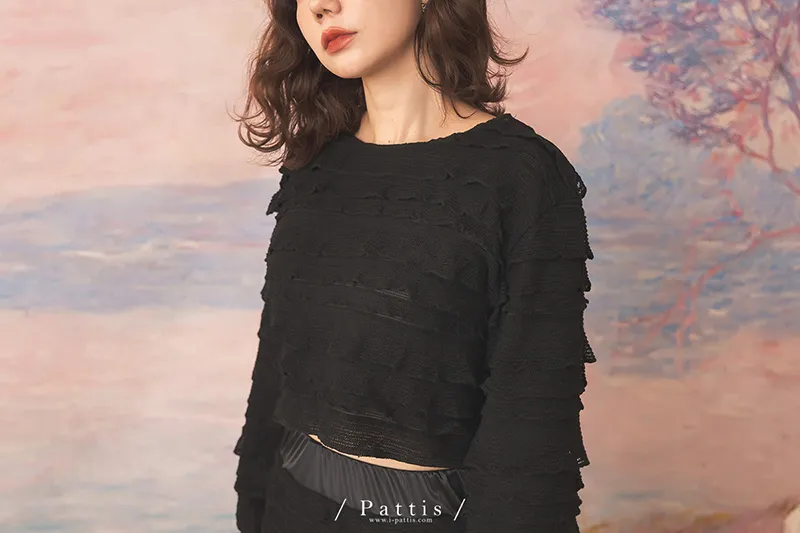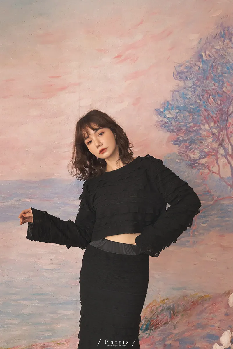 (現貨-上衣)月夜下小篆文|-可分售-波浪荷葉散袖短版上衣+長裙set組(黑)