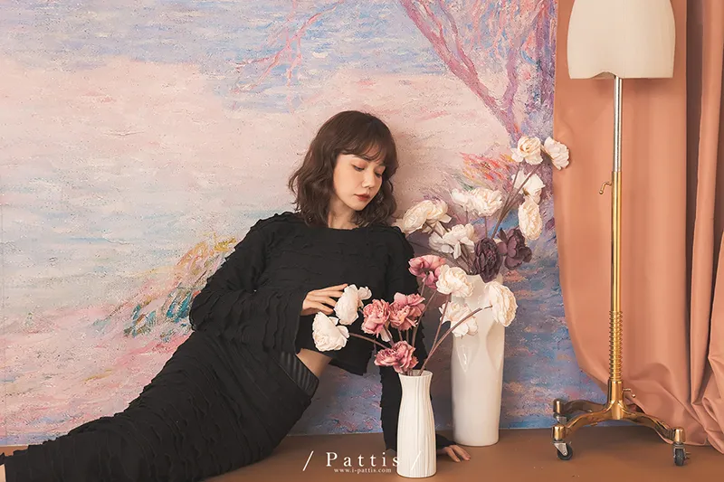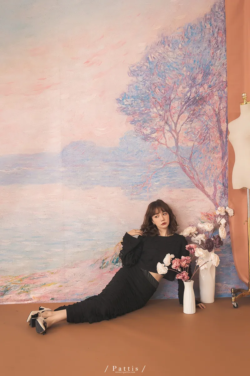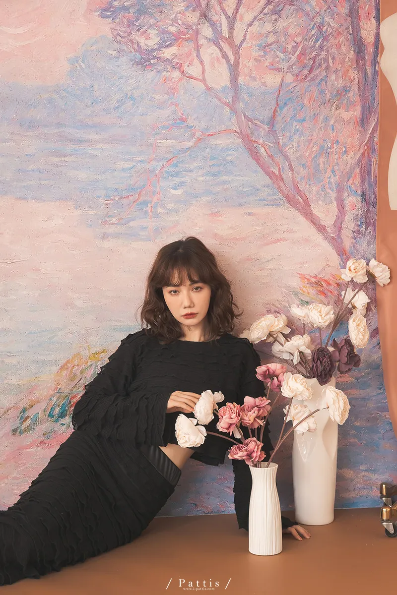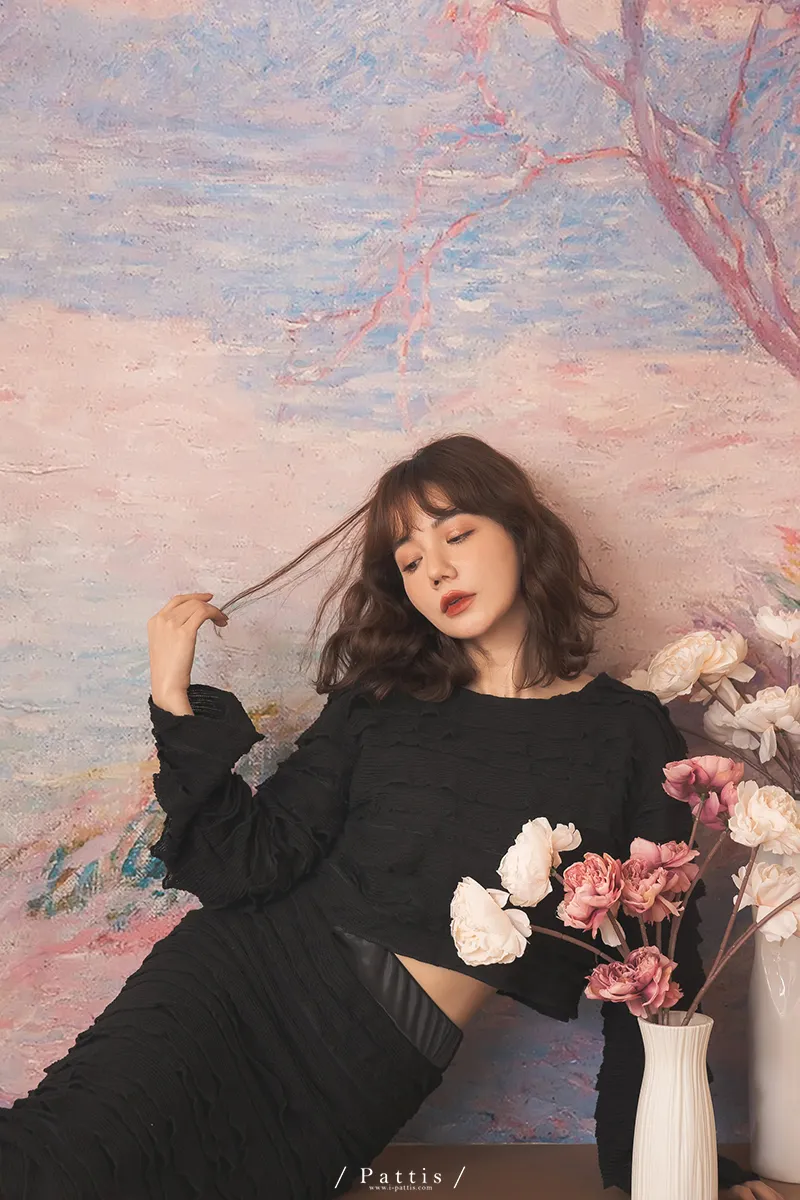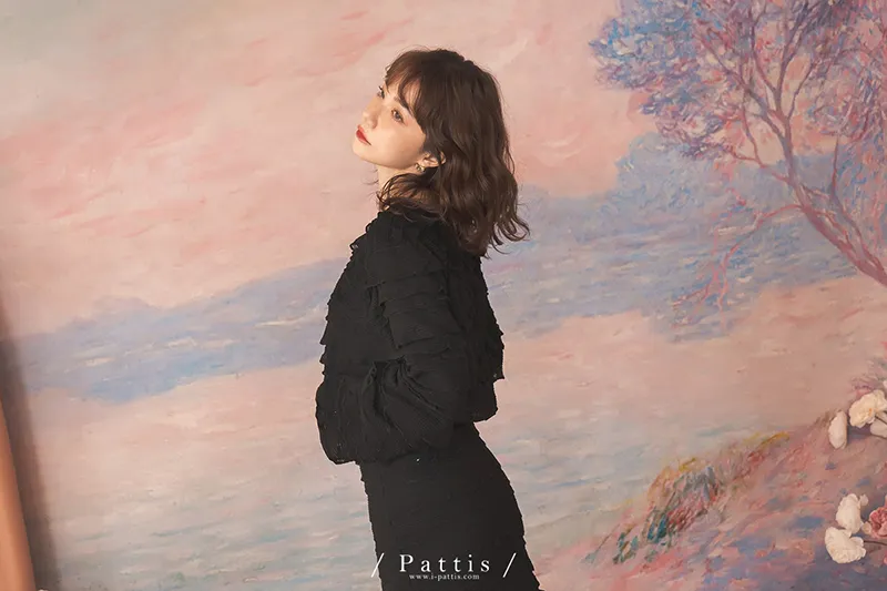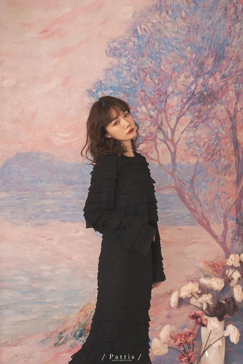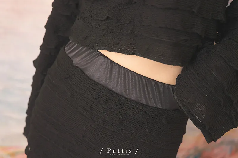 (現貨-上衣)月夜下小篆文|-可分售-波浪荷葉散袖短版上衣+長裙set組(黑)