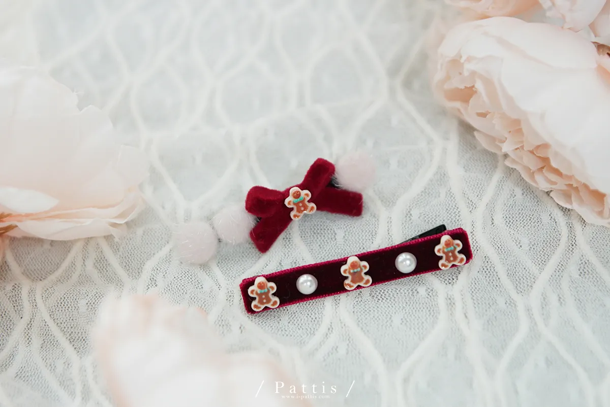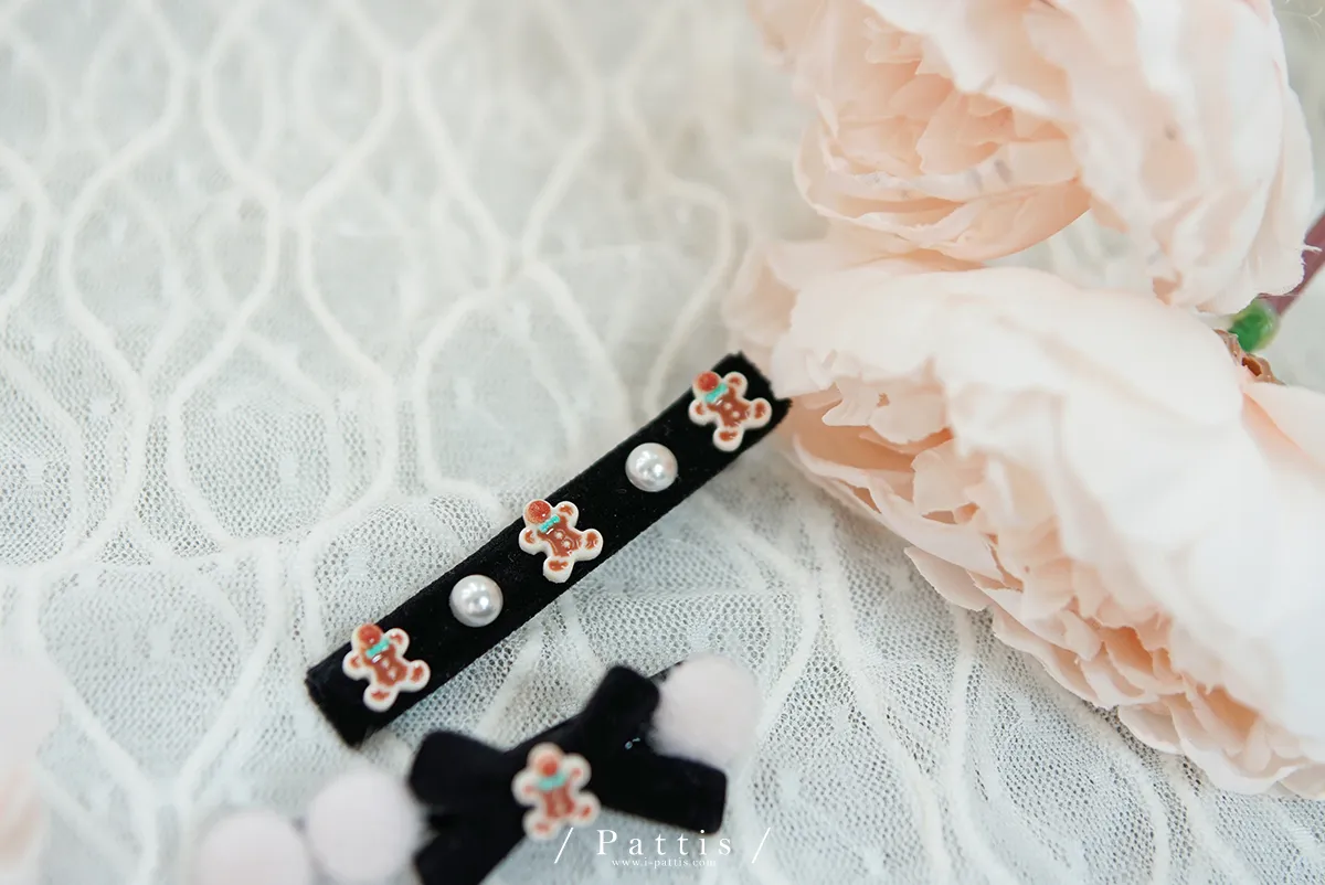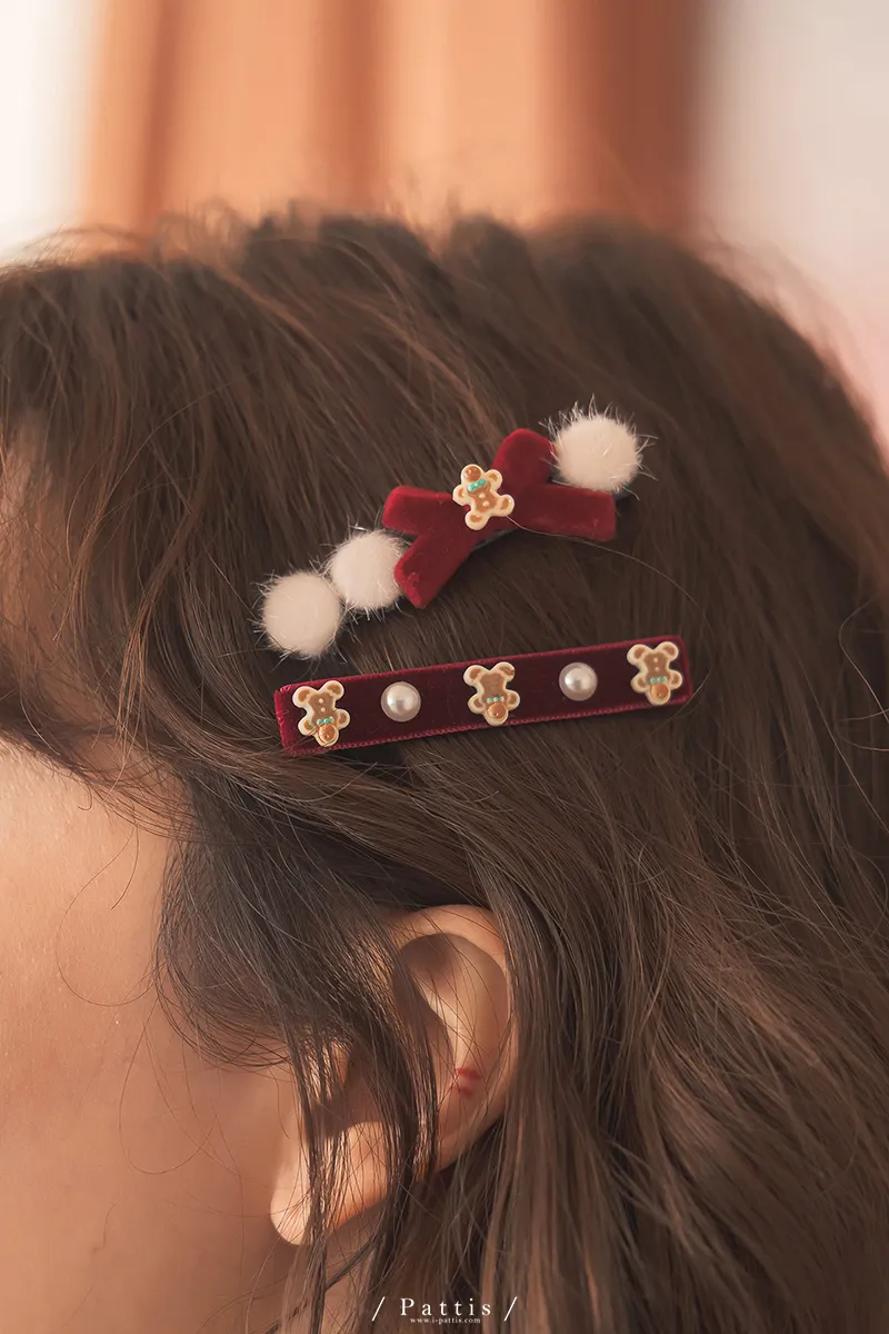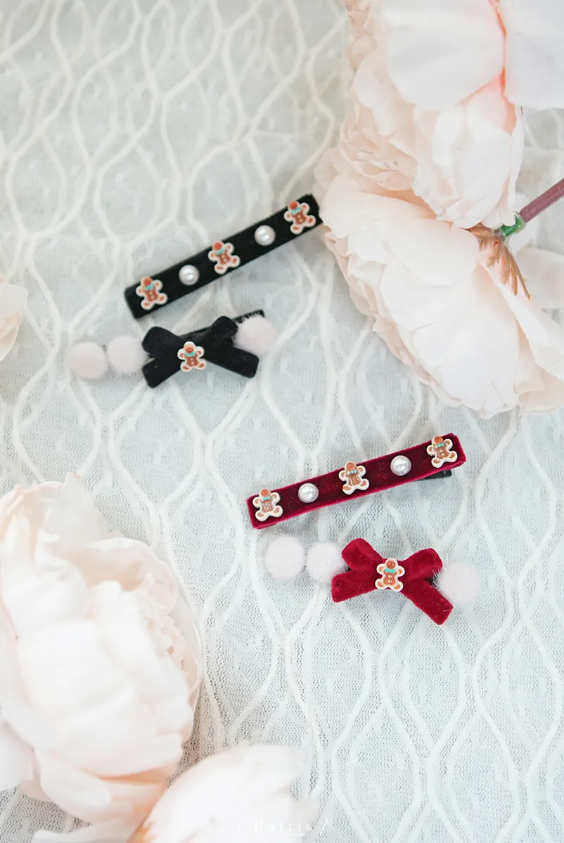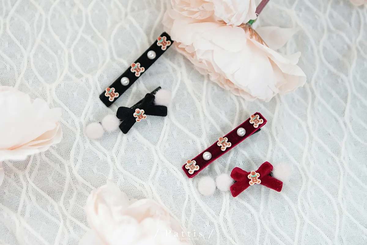 薑餅人綴珍珠毛球天鵝絨髮夾set組(酒紅/黑)