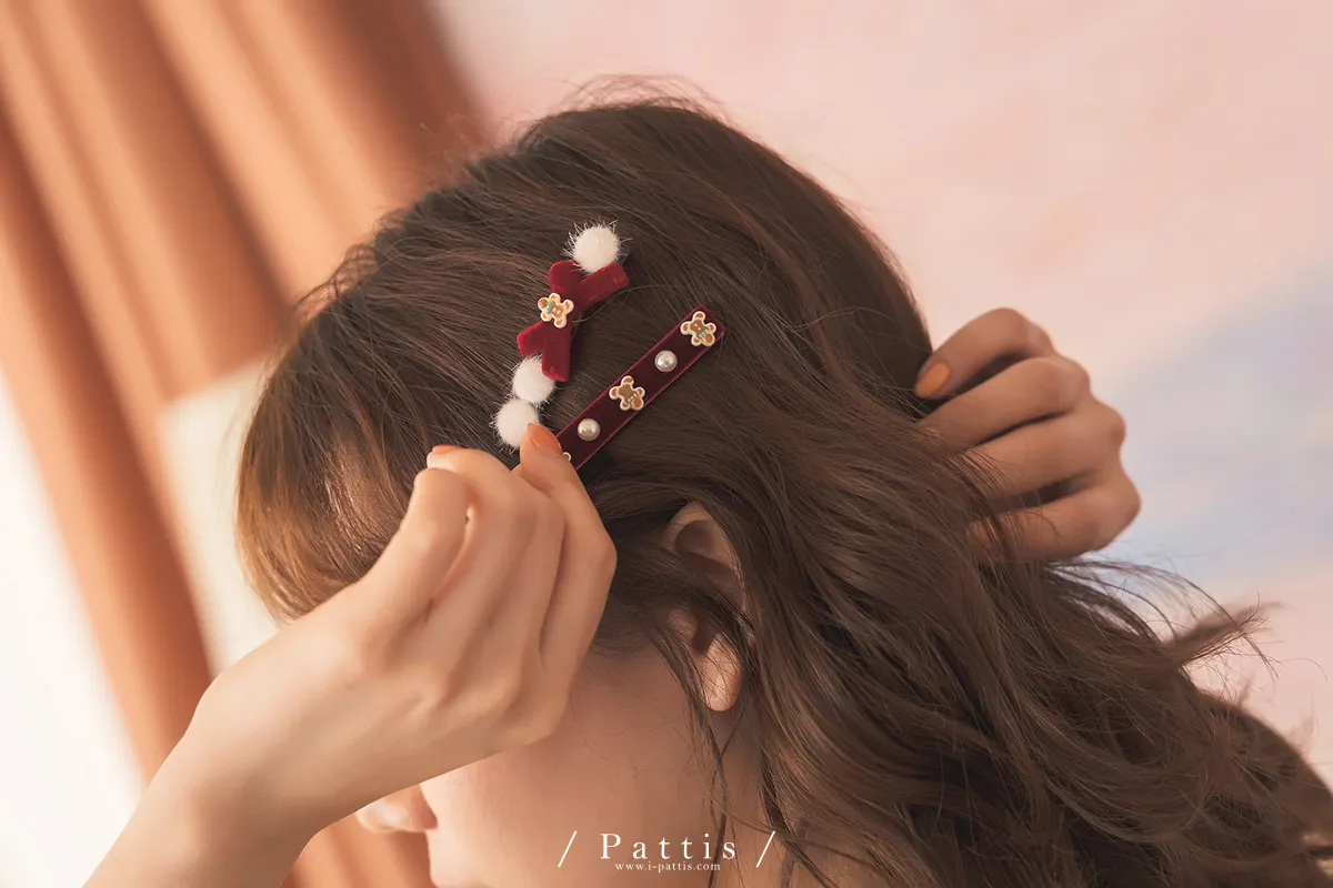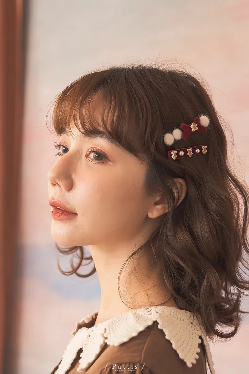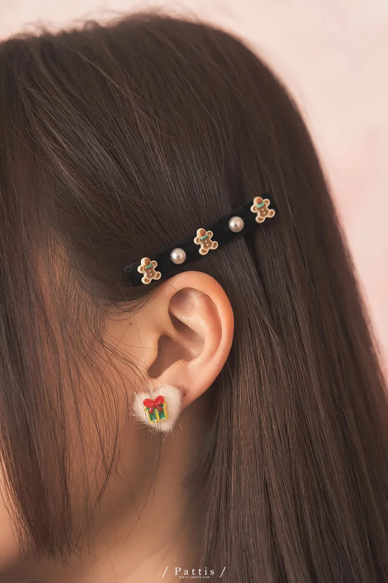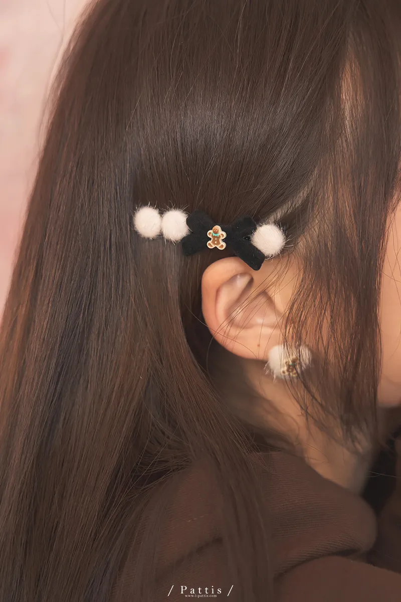 薑餅人綴珍珠毛球天鵝絨髮夾set組(酒紅/黑)