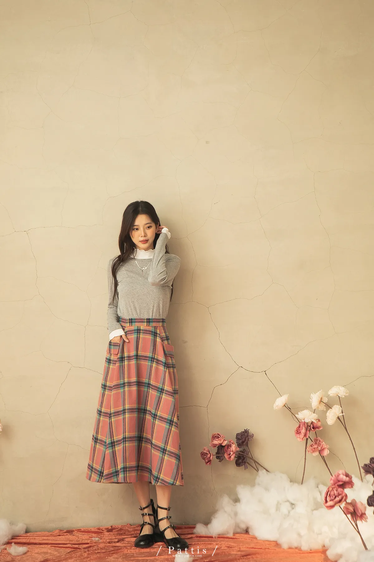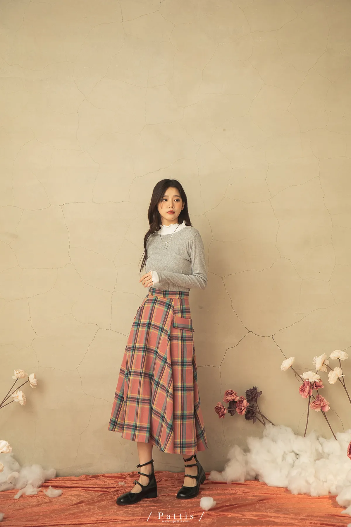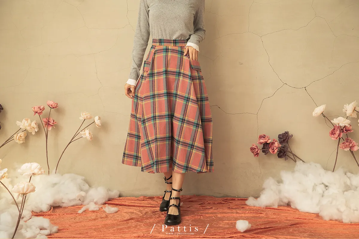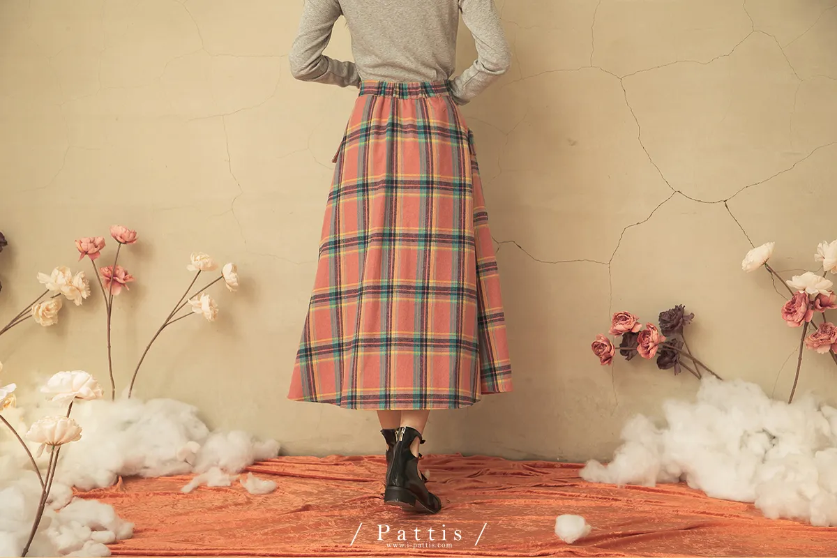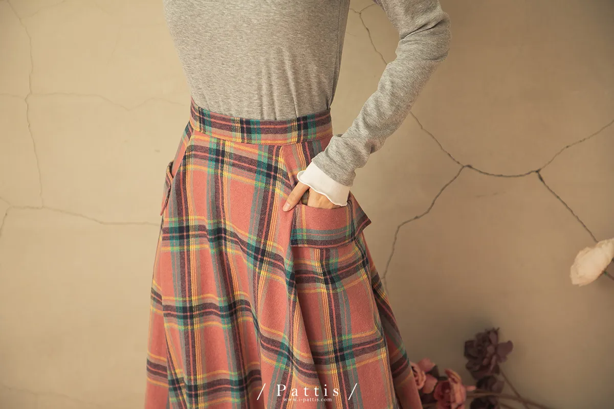 蠟筆繪製的序章 | 格紋雙口帶毛呢傘裙(粉)