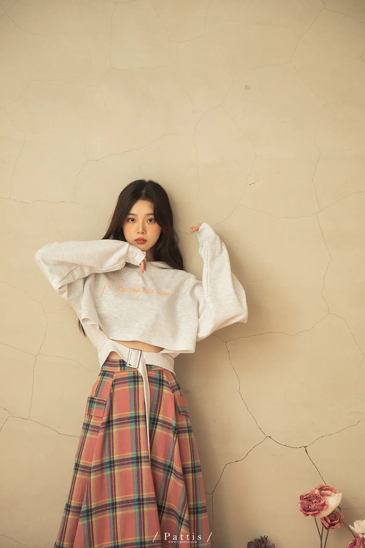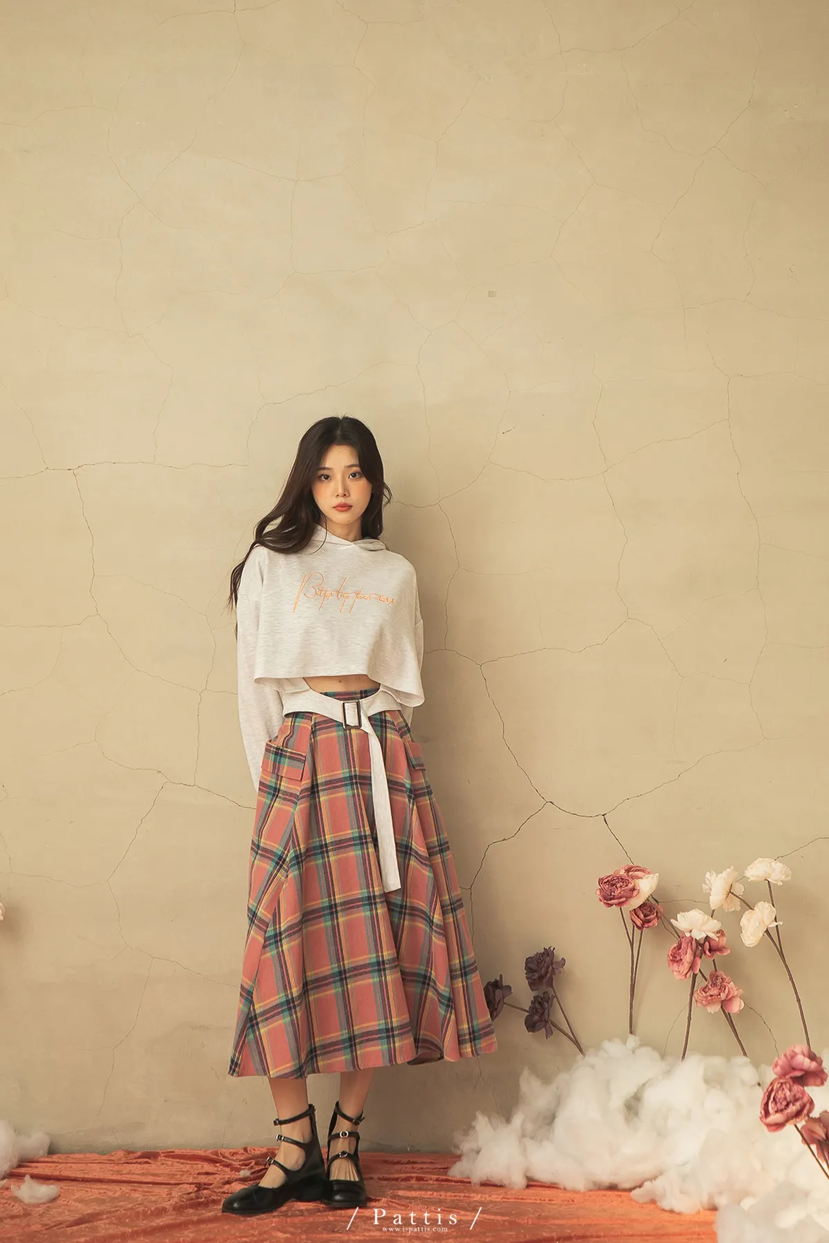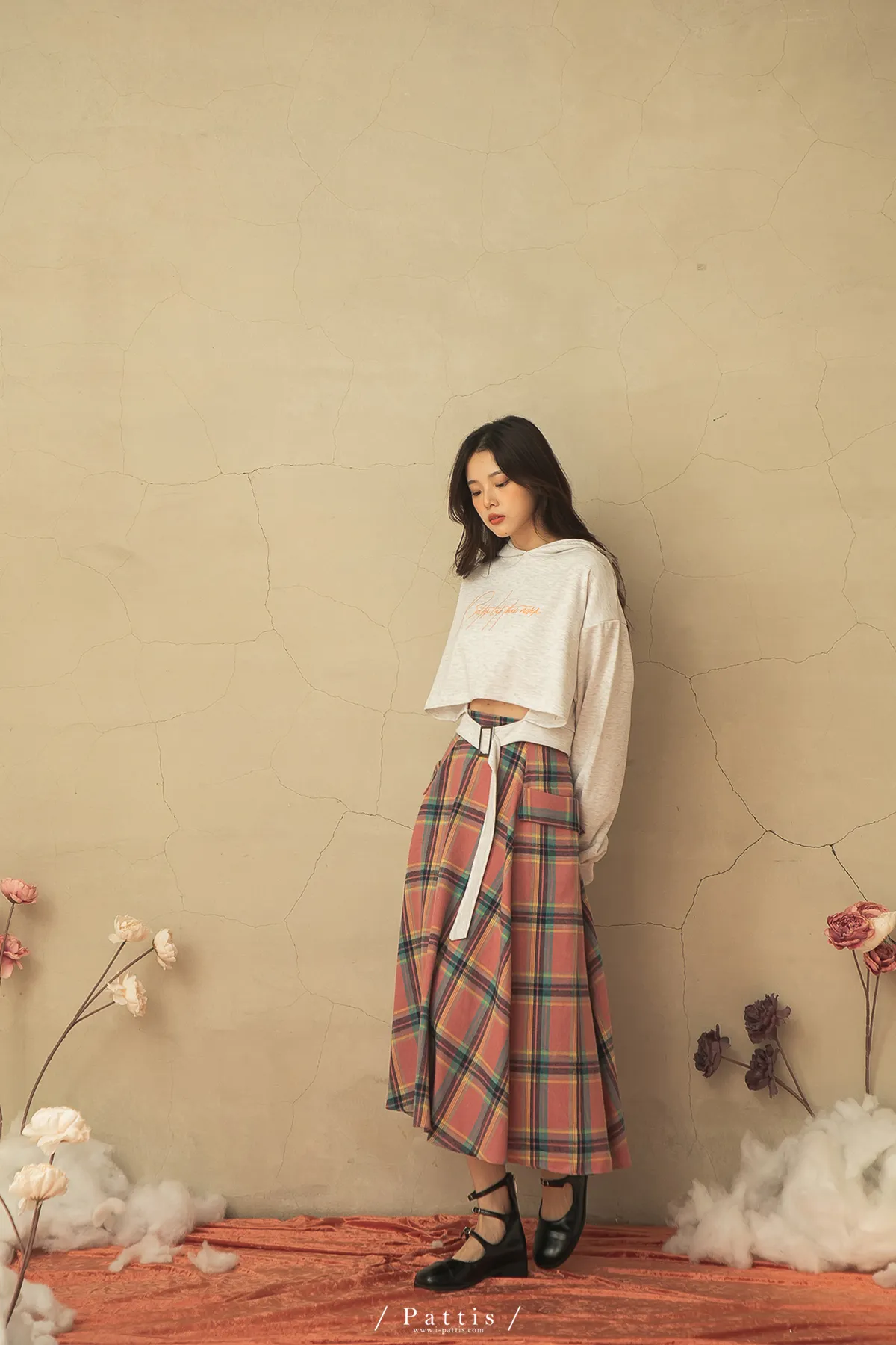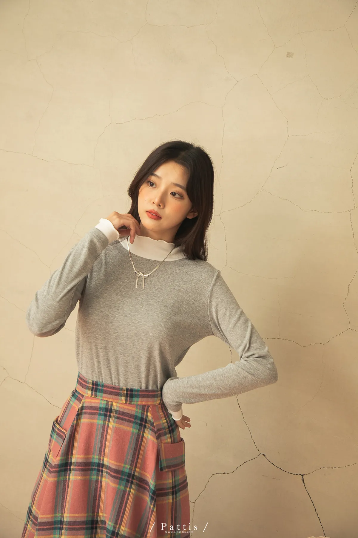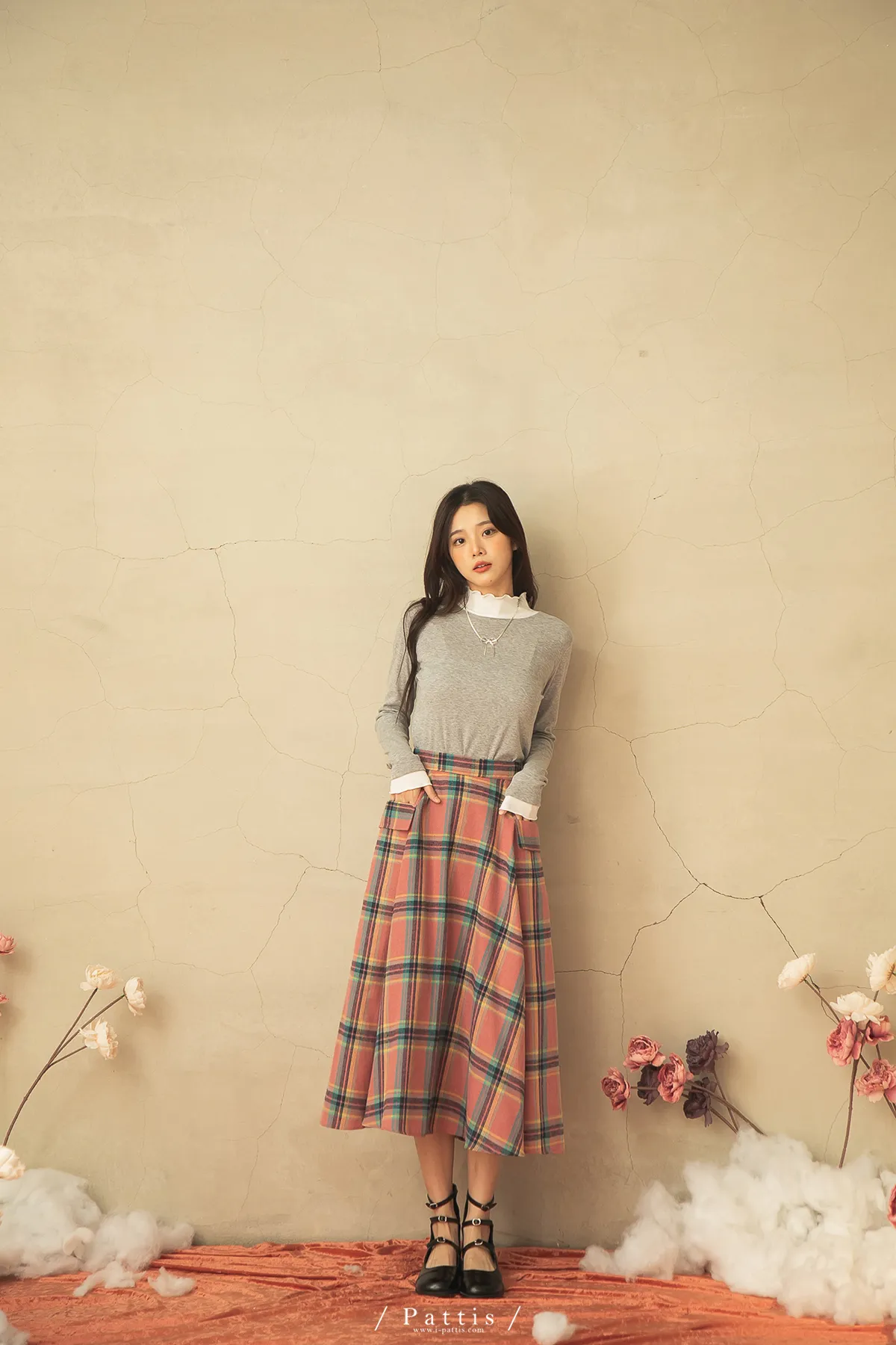 蠟筆繪製的序章 | 格紋雙口帶毛呢傘裙(粉)