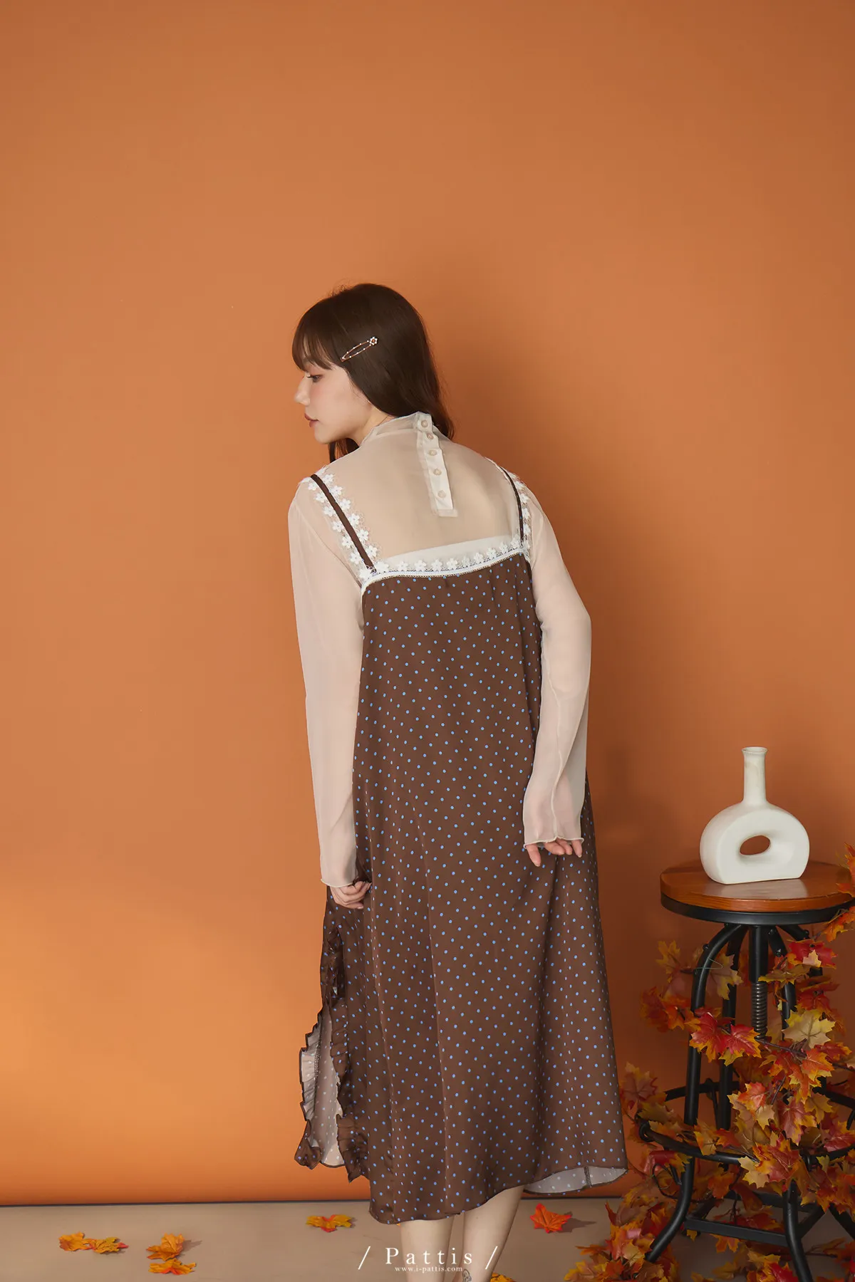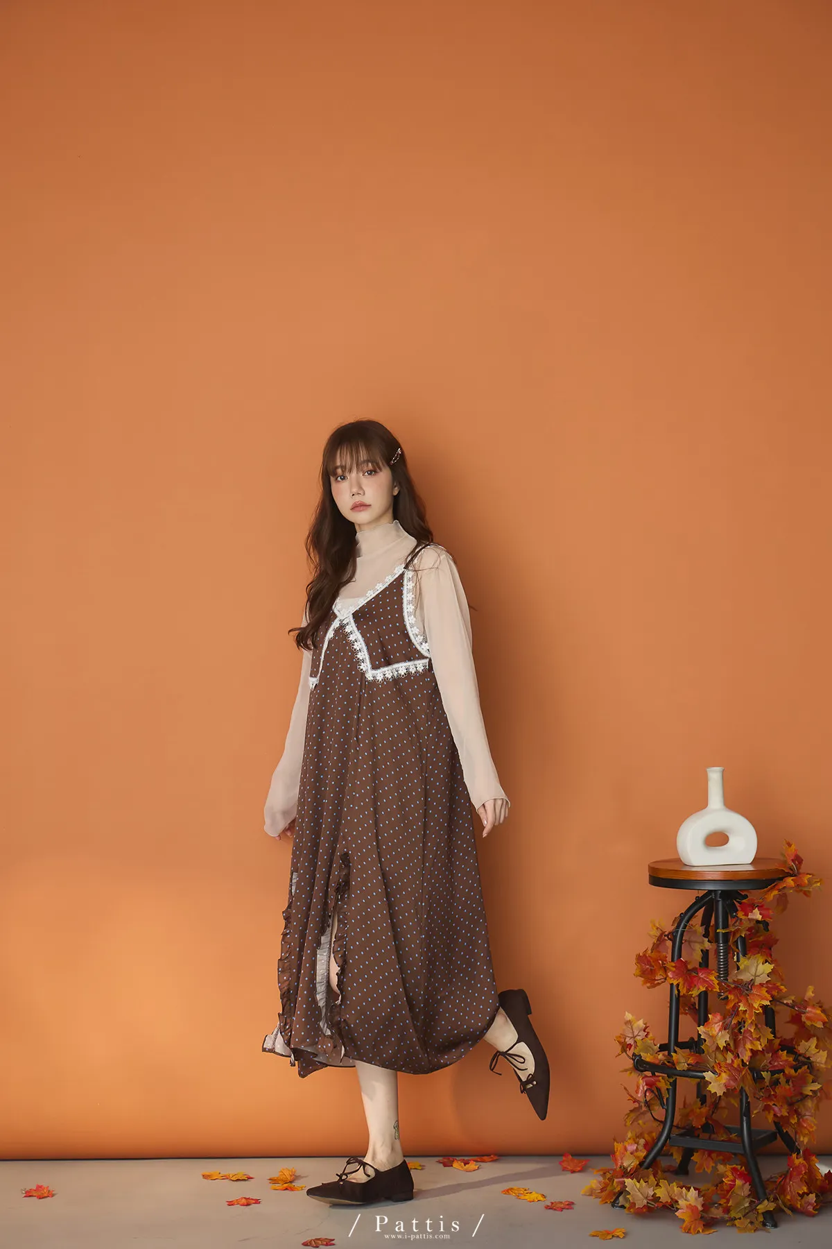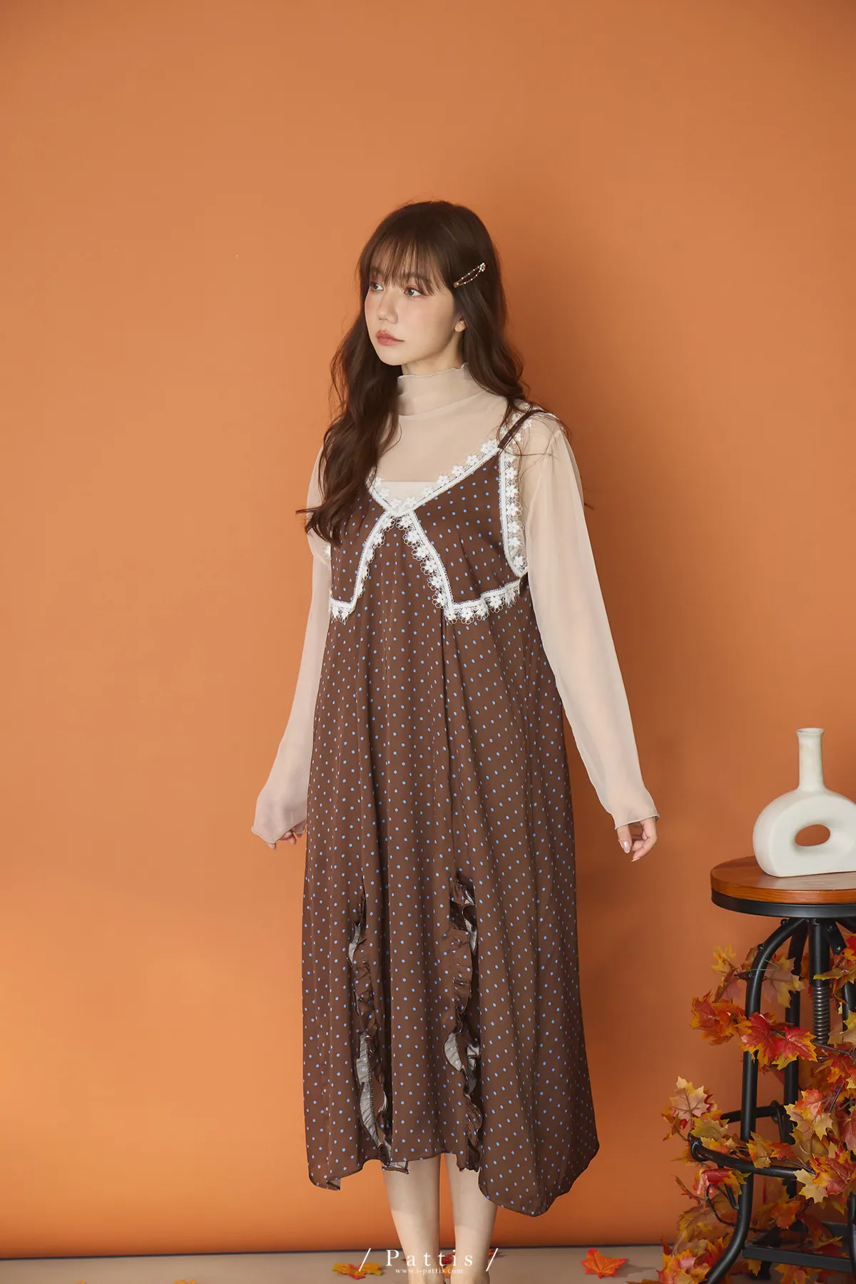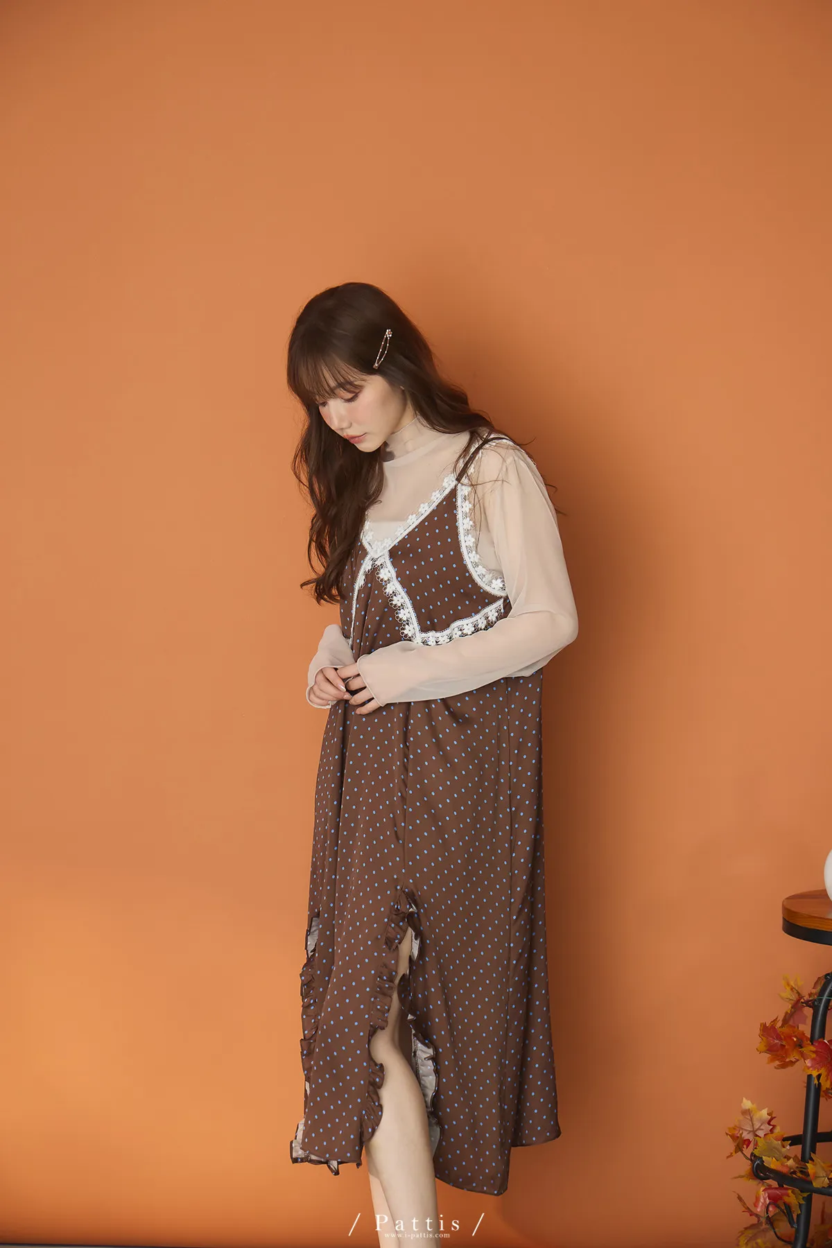 如果童話故事將成真 | 蕾絲滾邊波點吊帶開叉洋裝(棕)