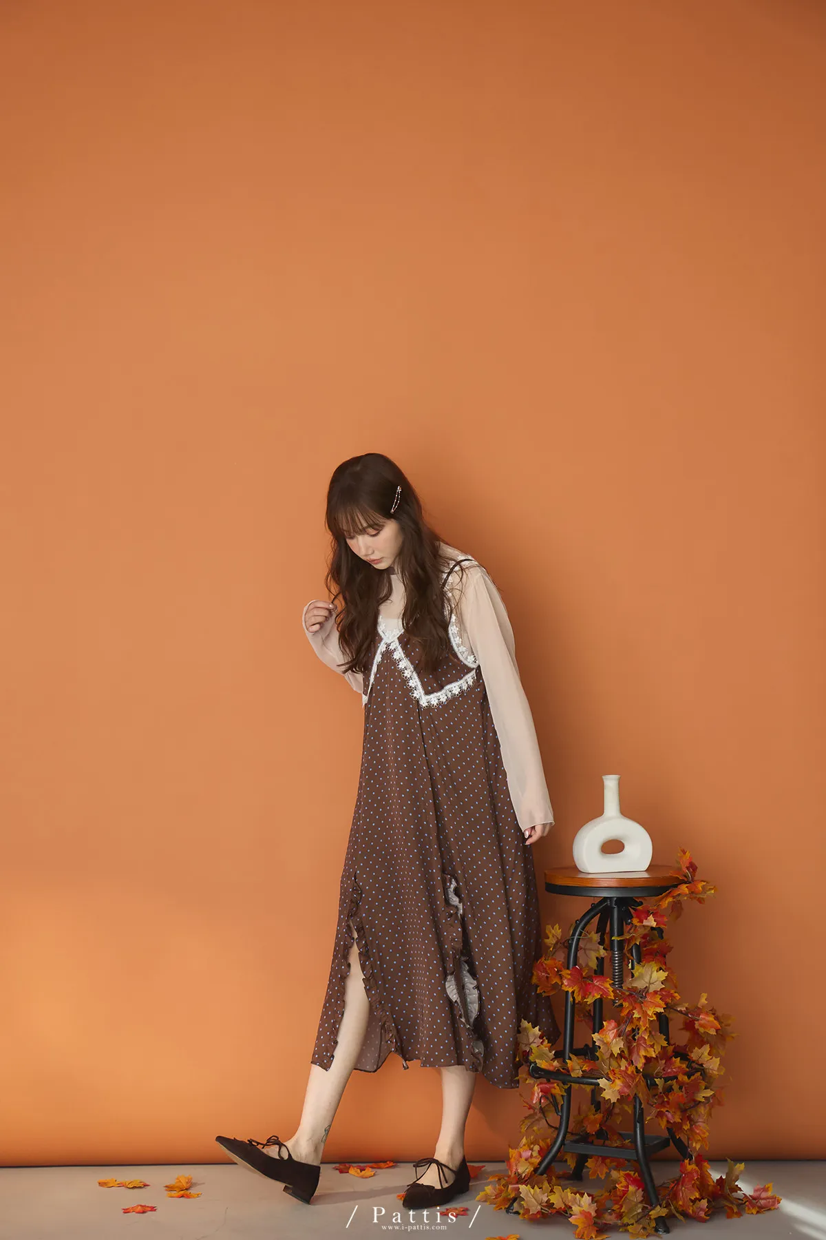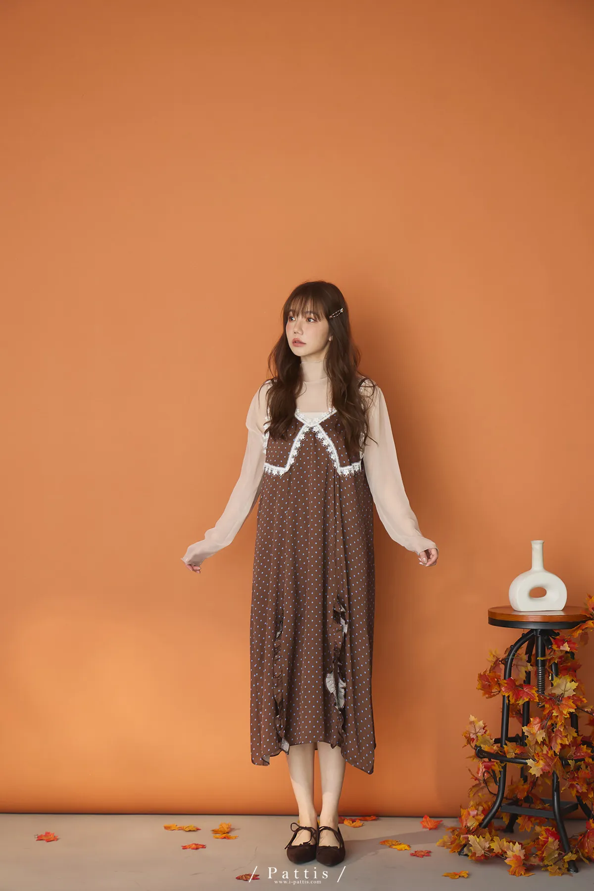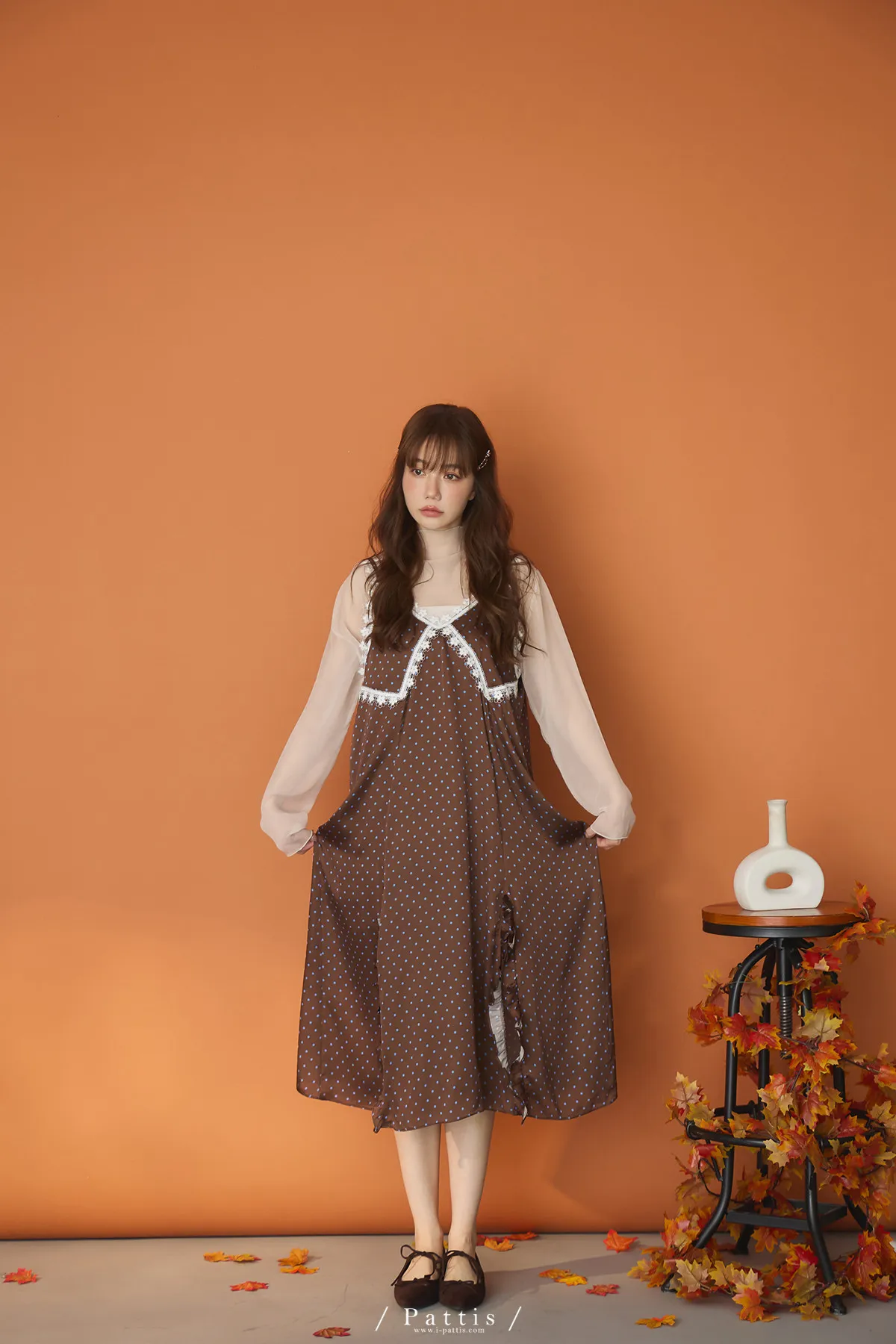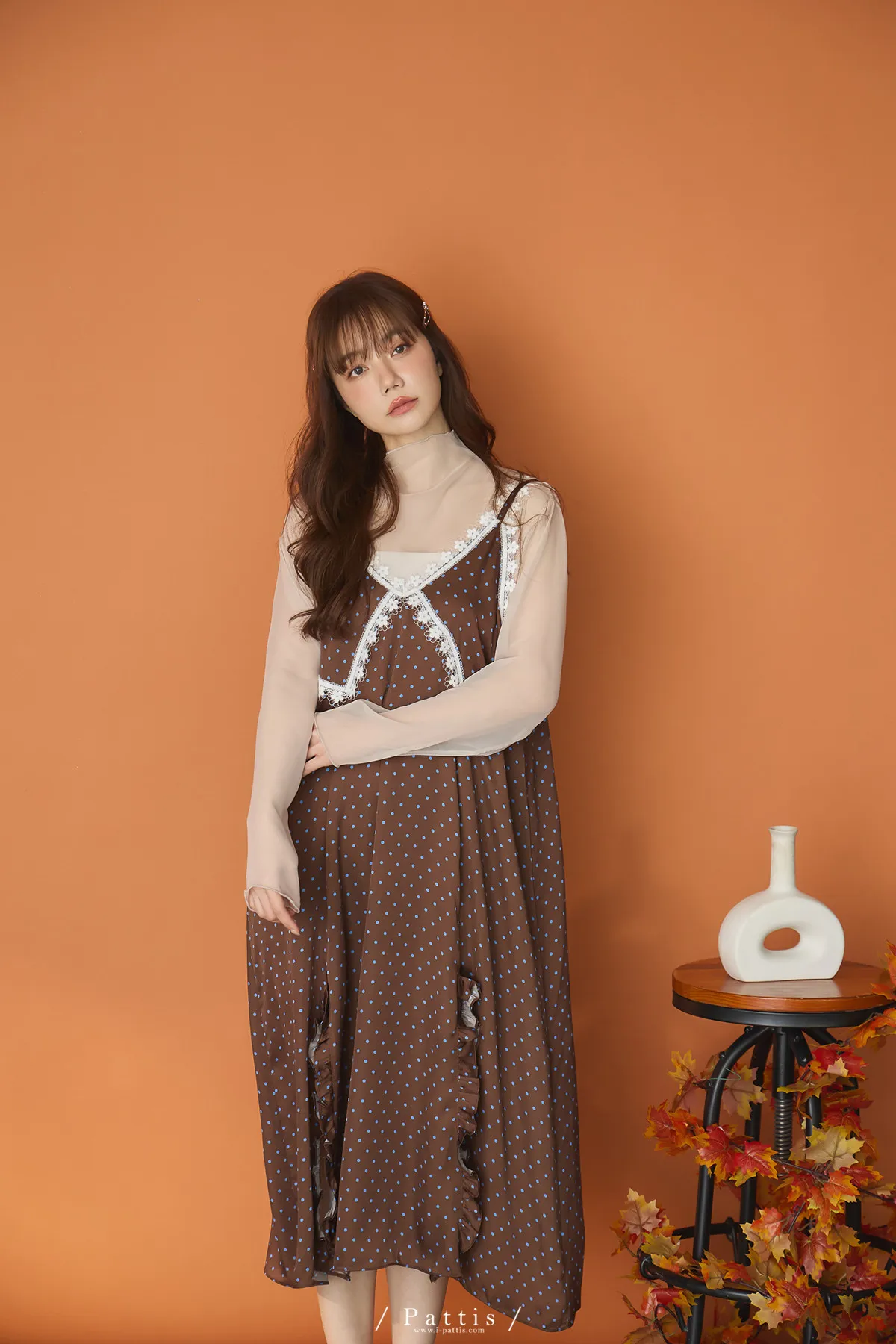 如果童話故事將成真 | 蕾絲滾邊波點吊帶開叉洋裝(棕)