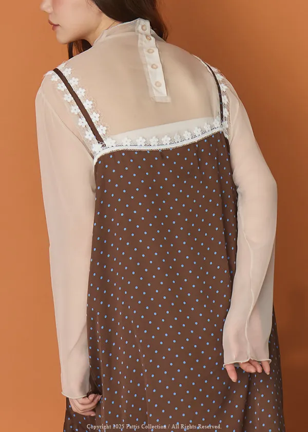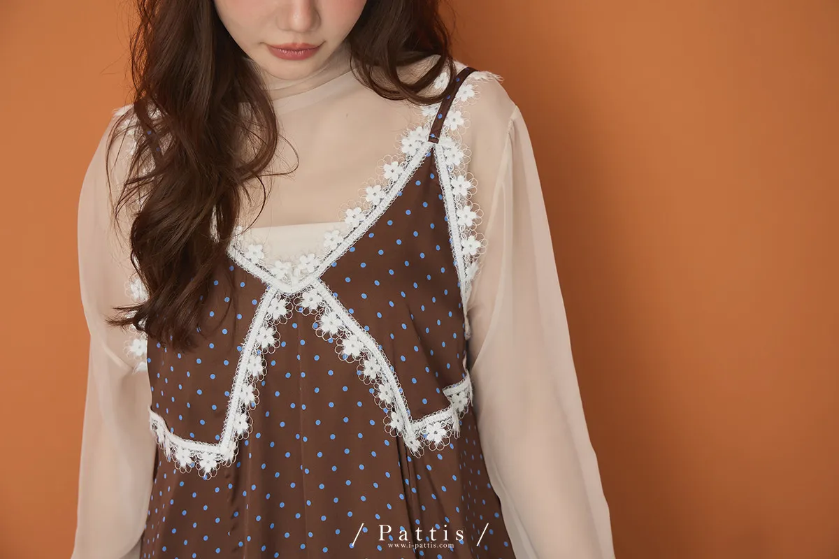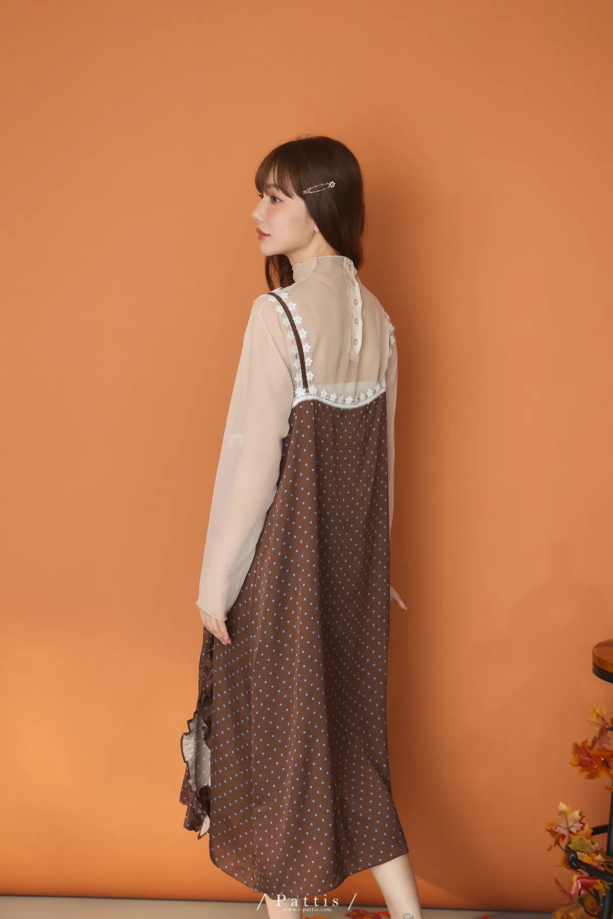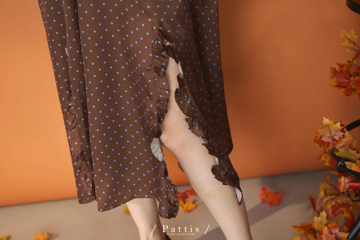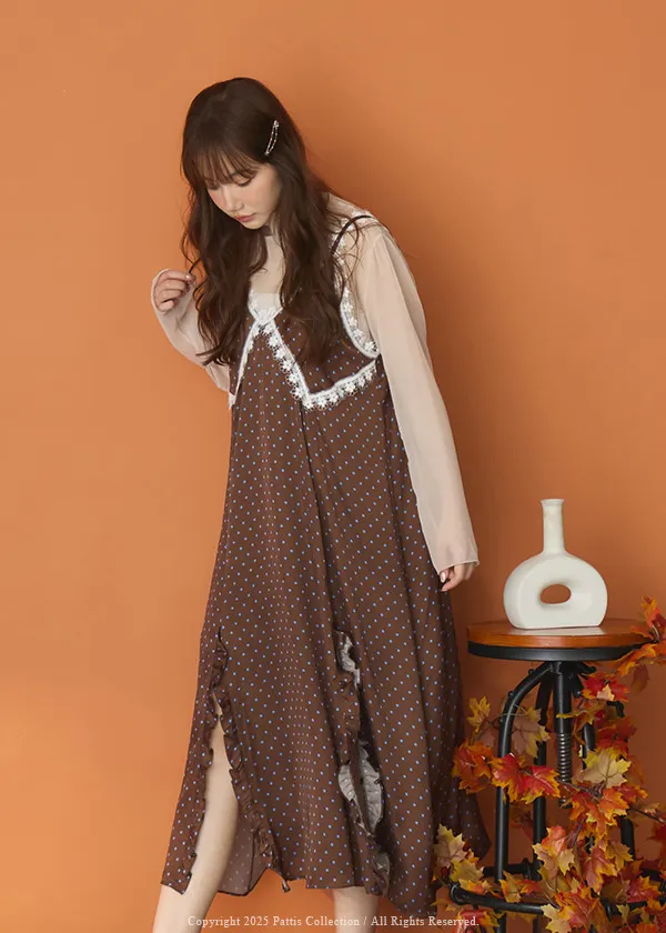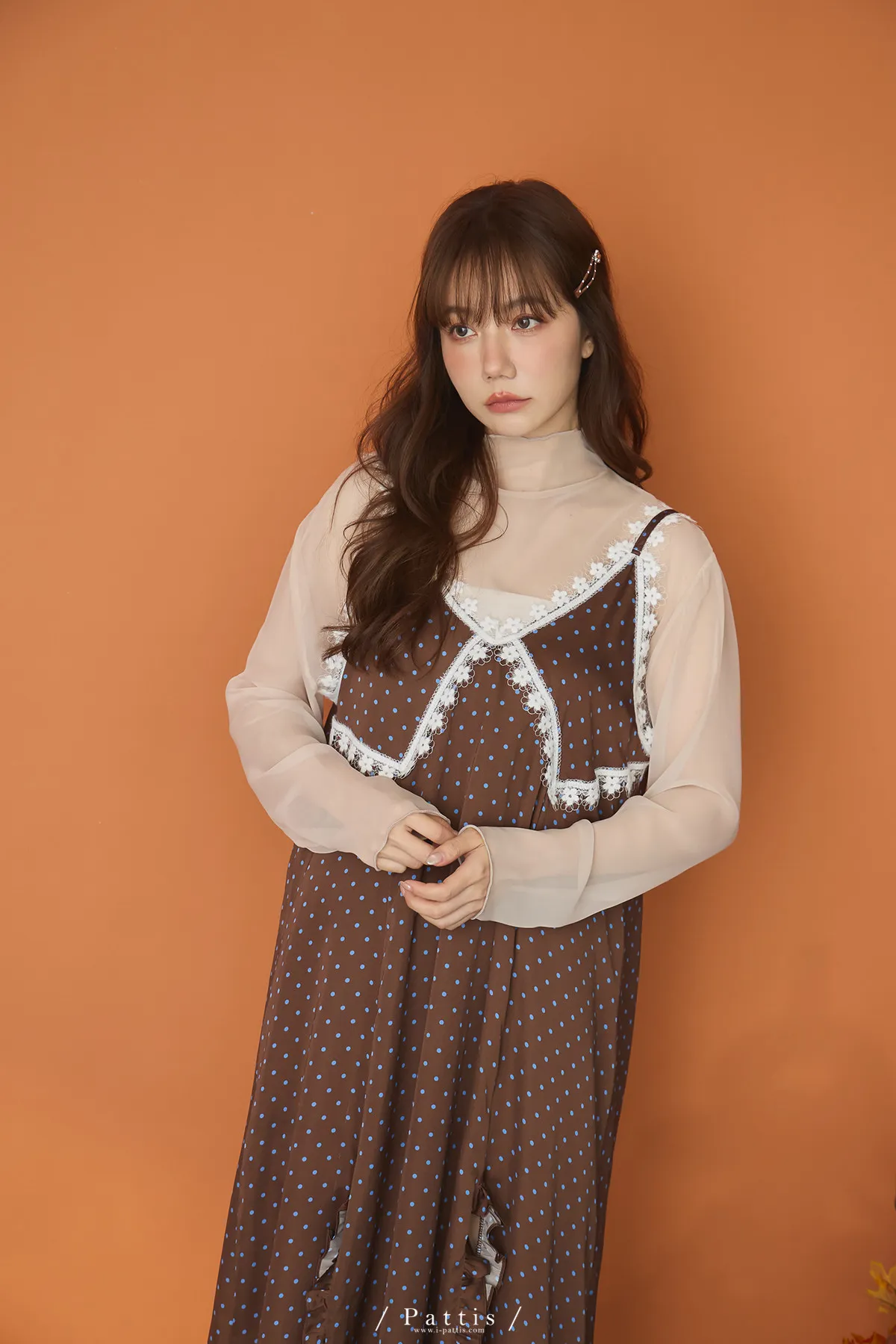 如果童話故事將成真 | 蕾絲滾邊波點吊帶開叉洋裝(棕)