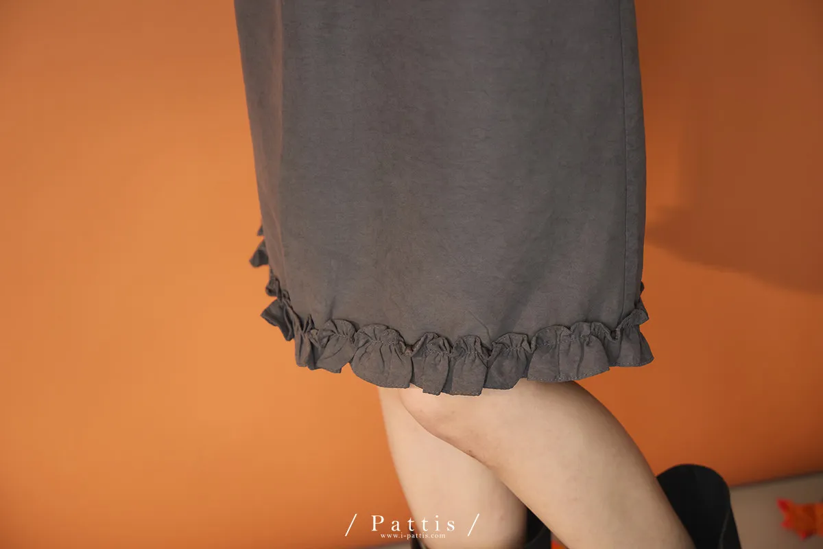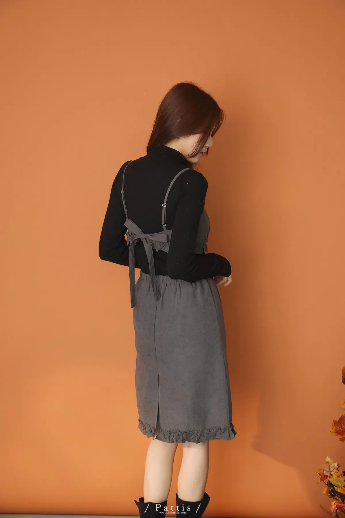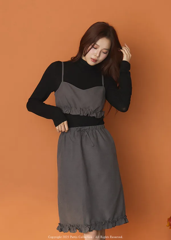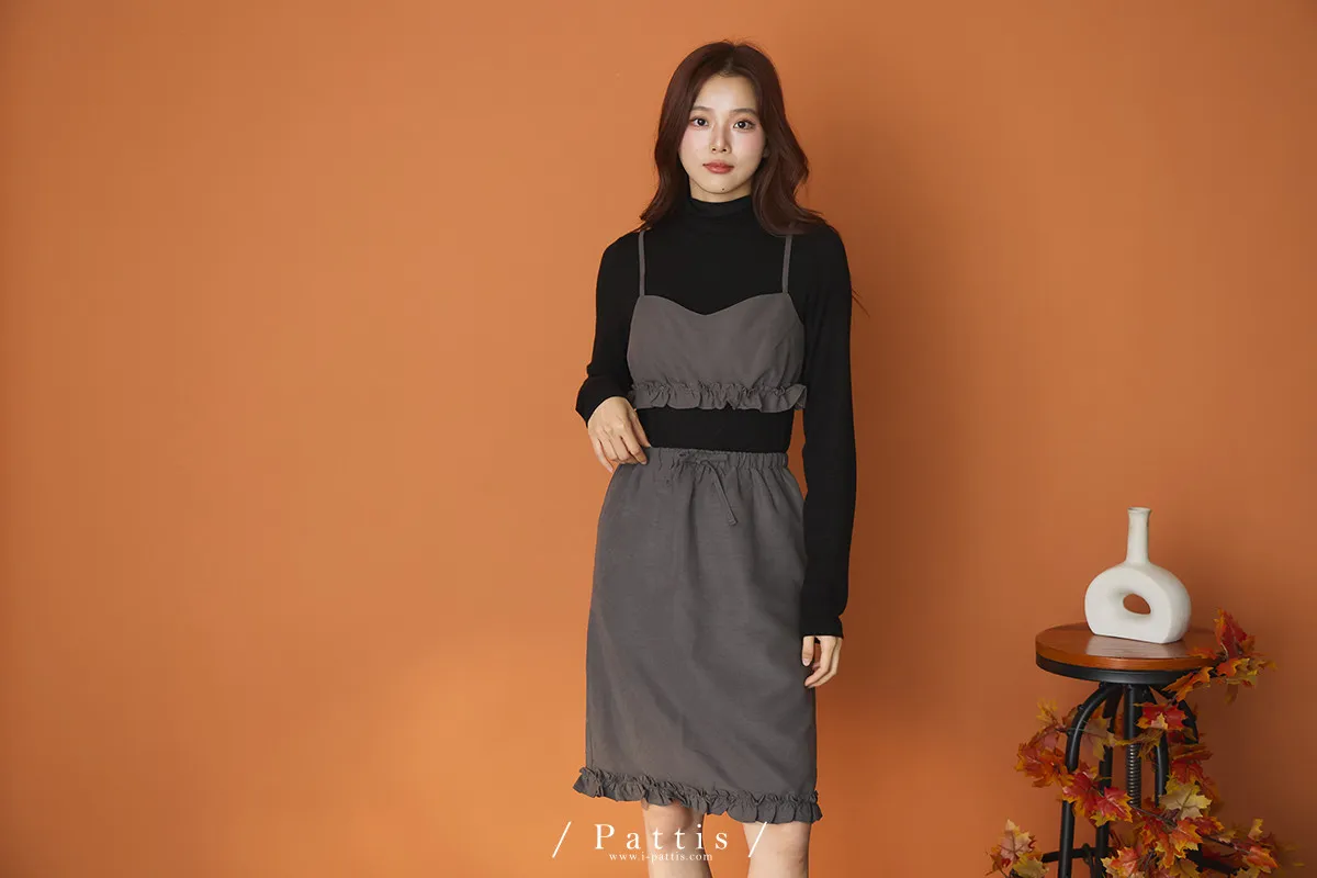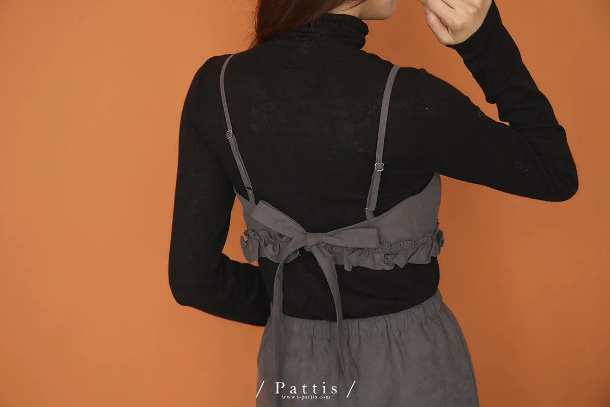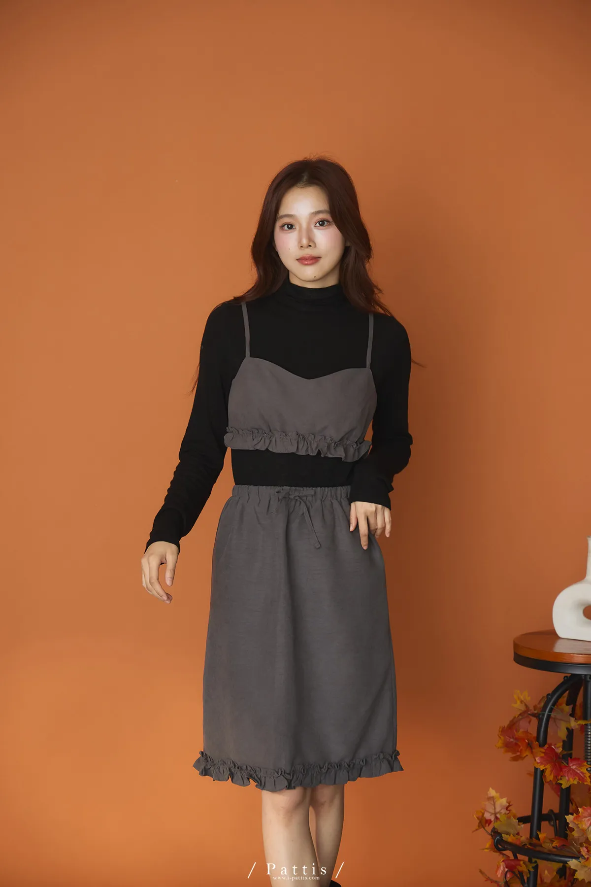 (現貨)城市迷走的早晨 | (可分售)桃心荷葉綁帶背心+抽繩荷長裙set (灰)