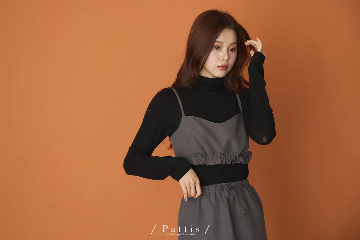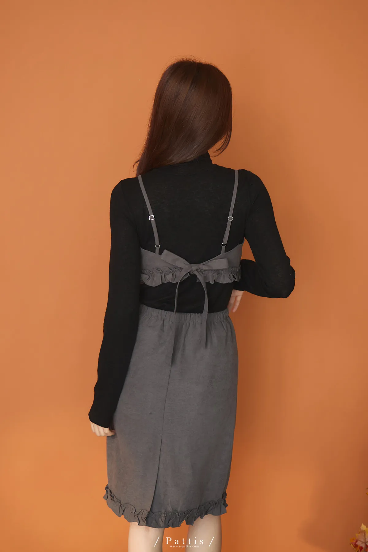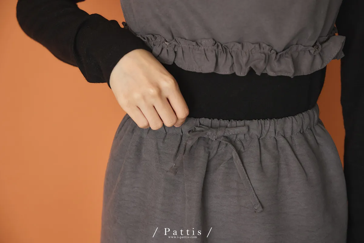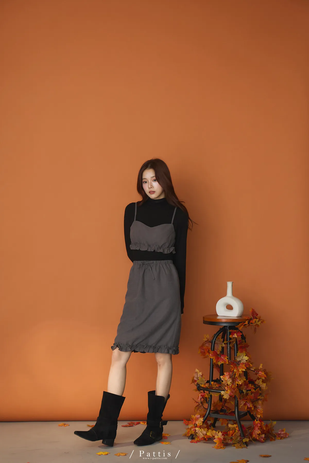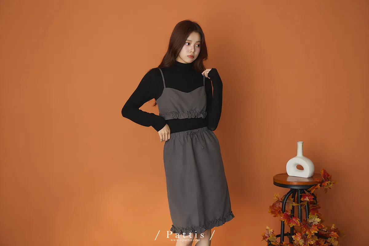 (現貨)城市迷走的早晨 | (可分售)桃心荷葉綁帶背心+抽繩荷長裙set (灰)