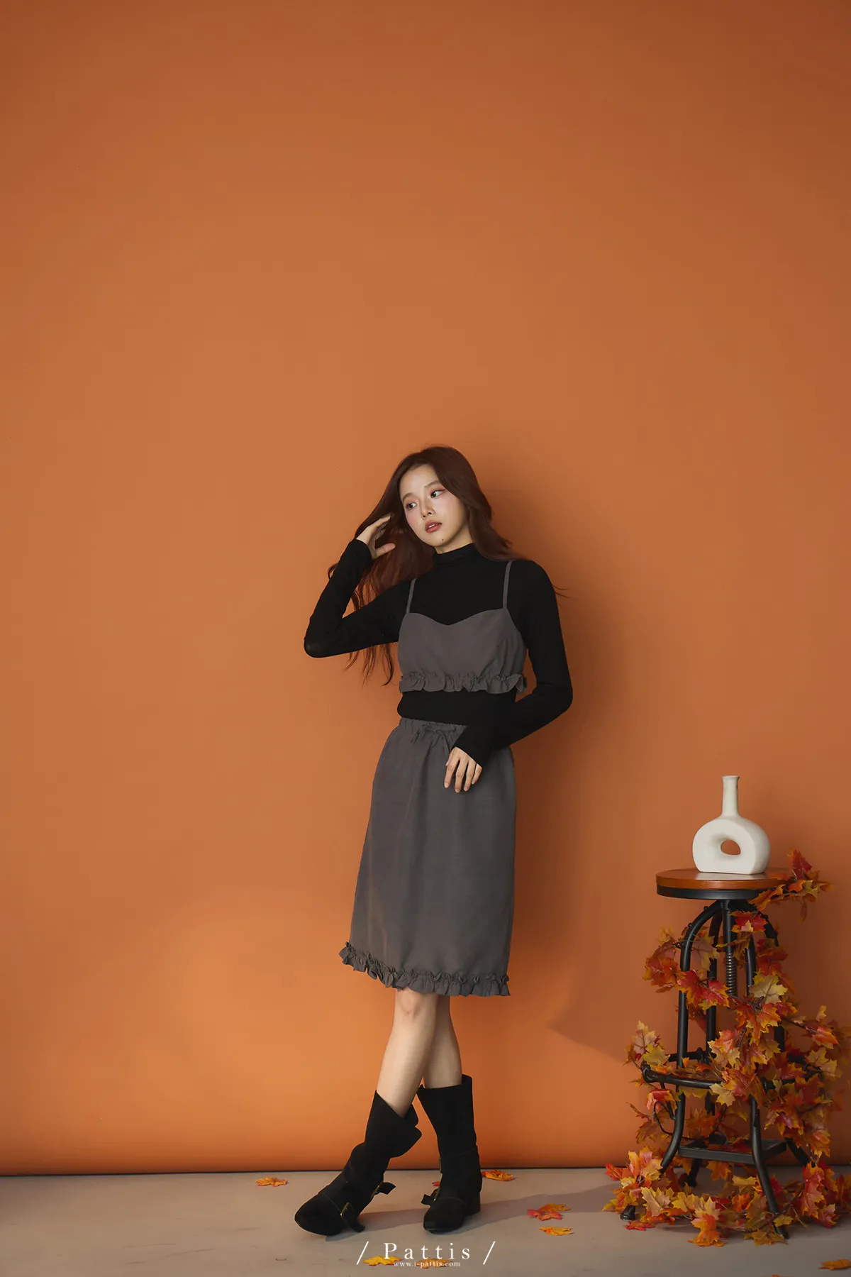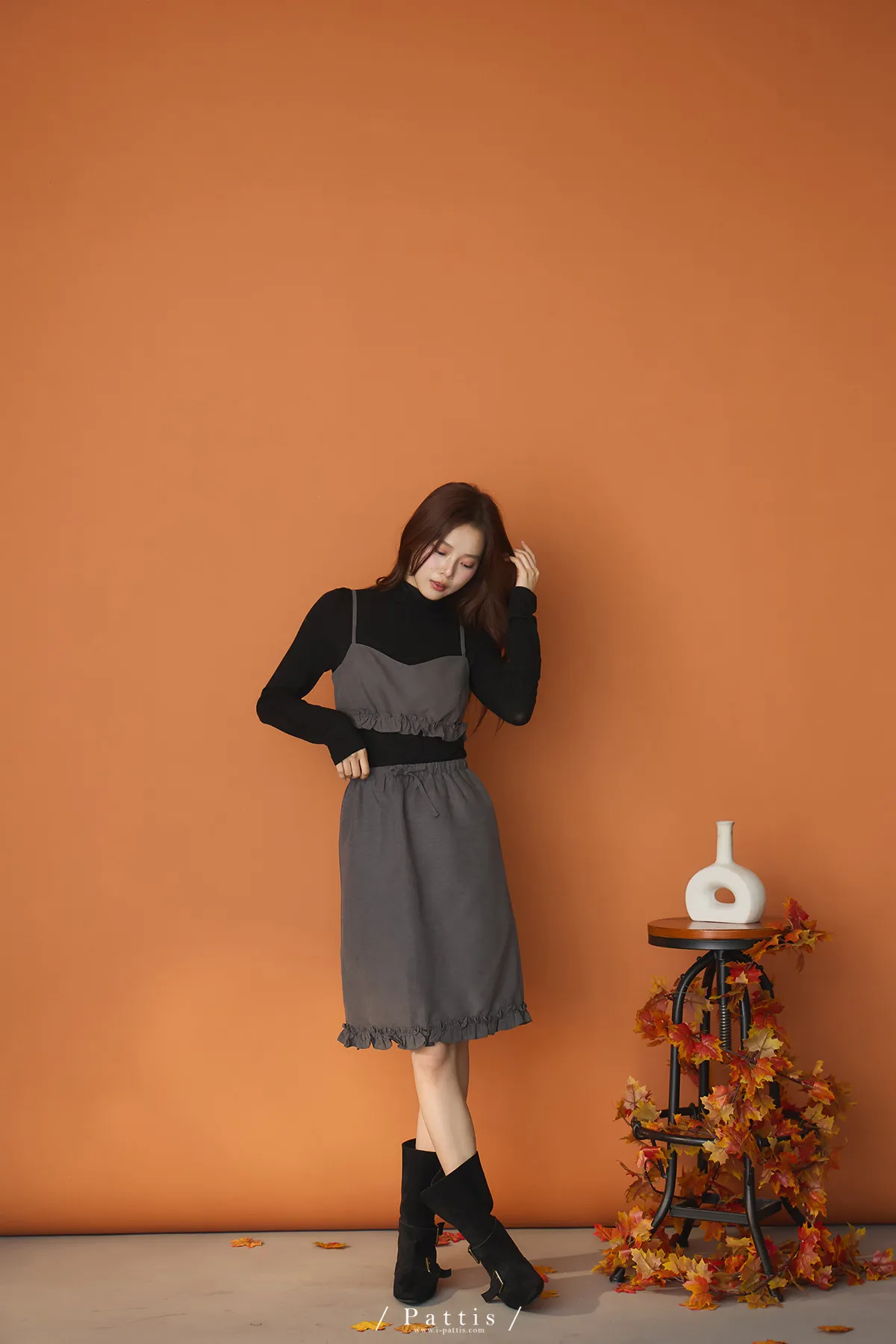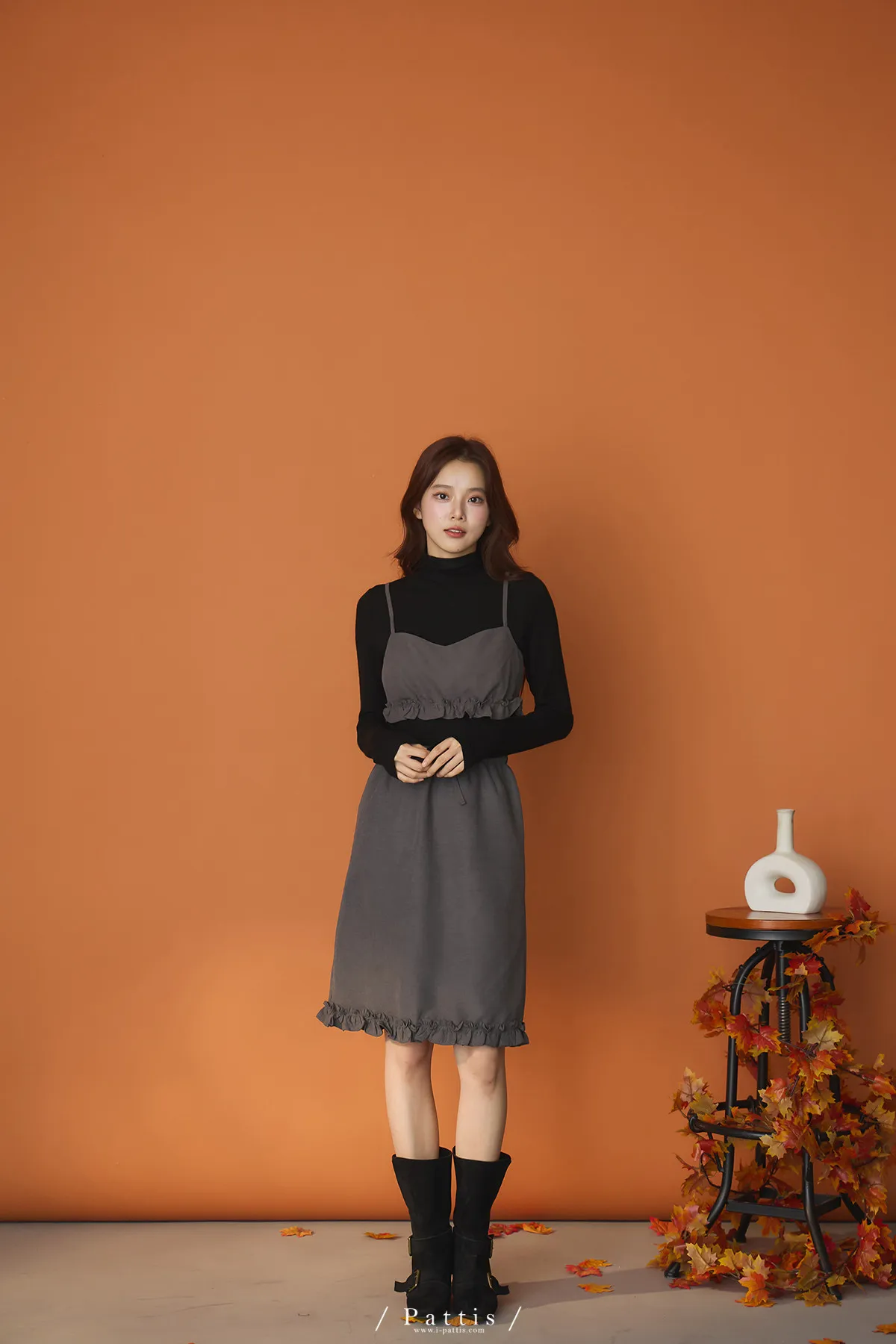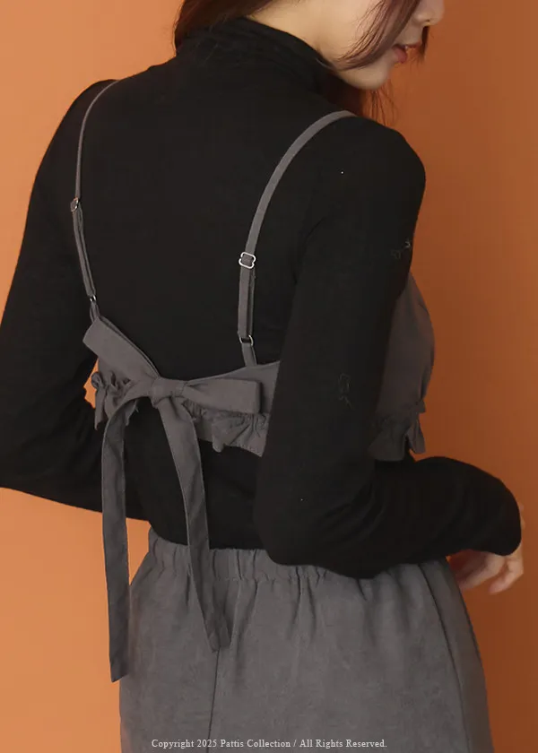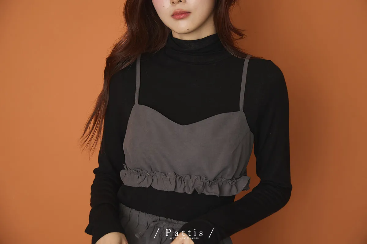 (現貨)城市迷走的早晨 | (可分售)桃心荷葉綁帶背心+抽繩荷長裙set (灰)