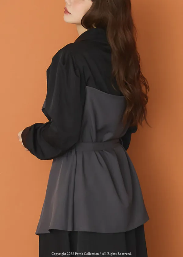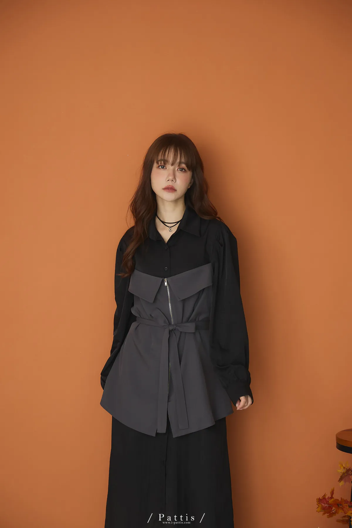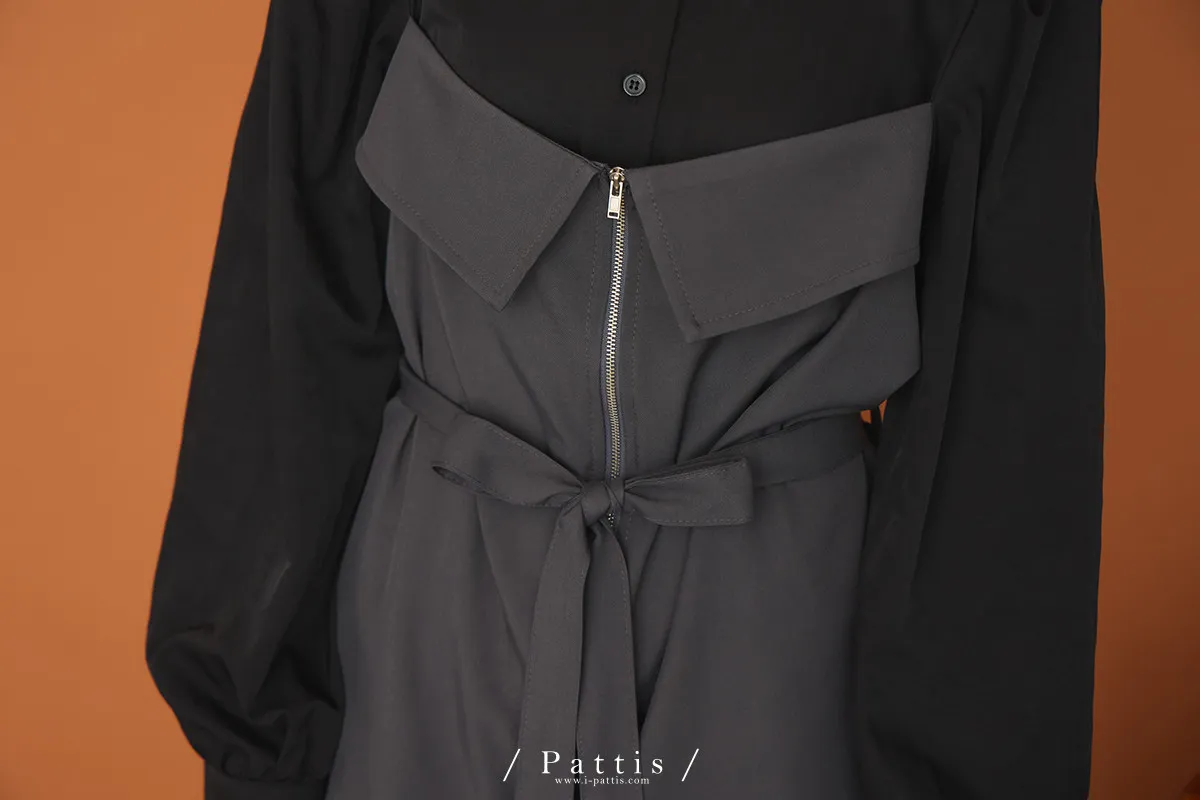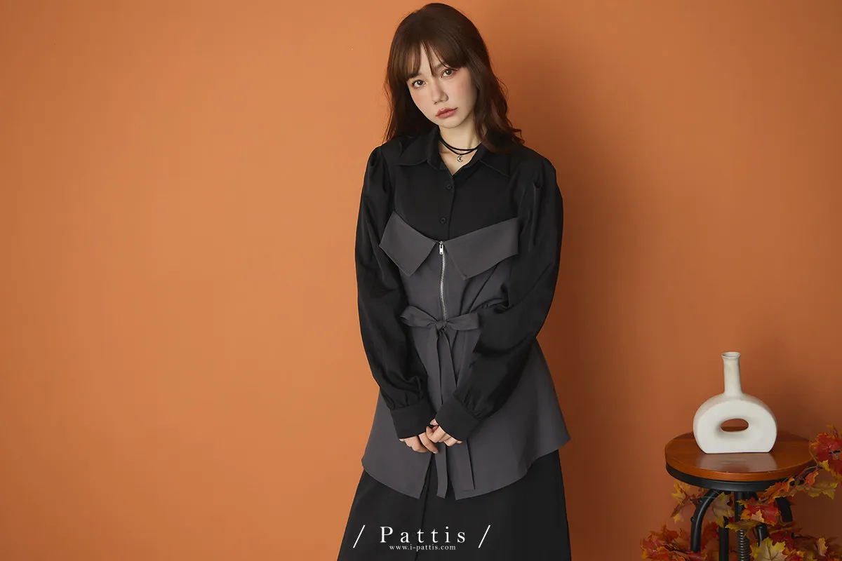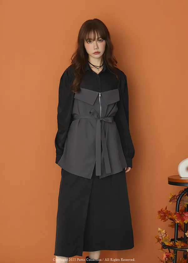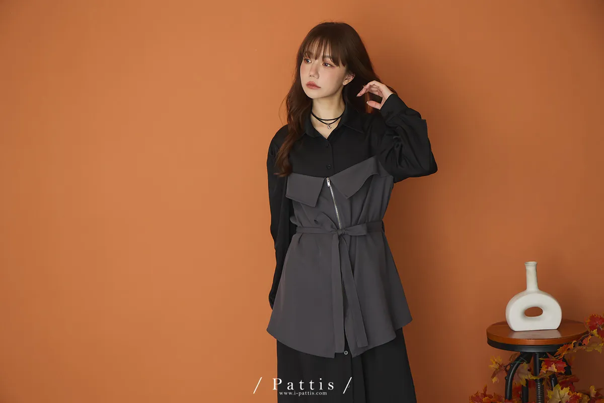 打包那些眷戀給你 | 假兩件翻摺背心繫帶襯衫洋裝(灰黑)