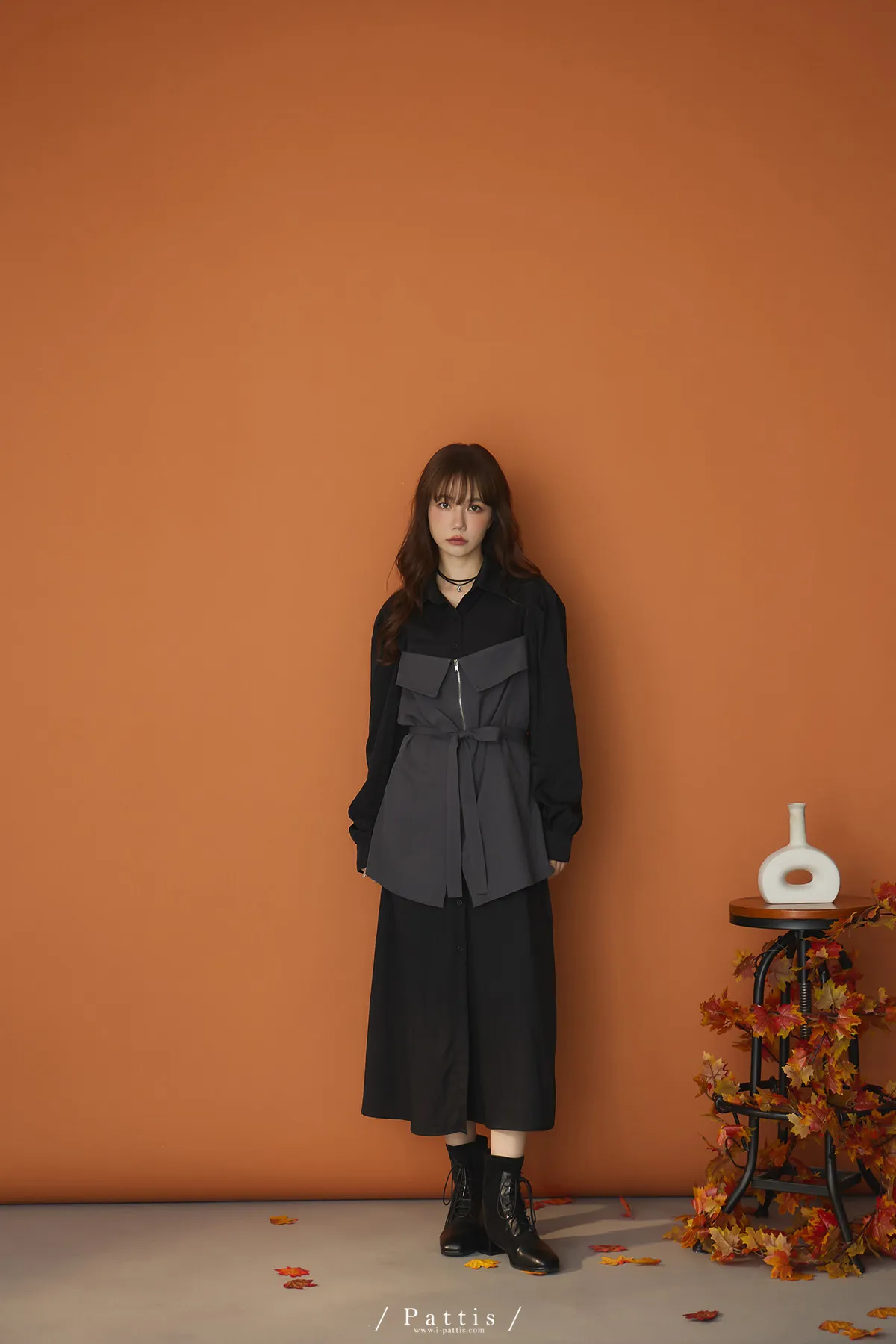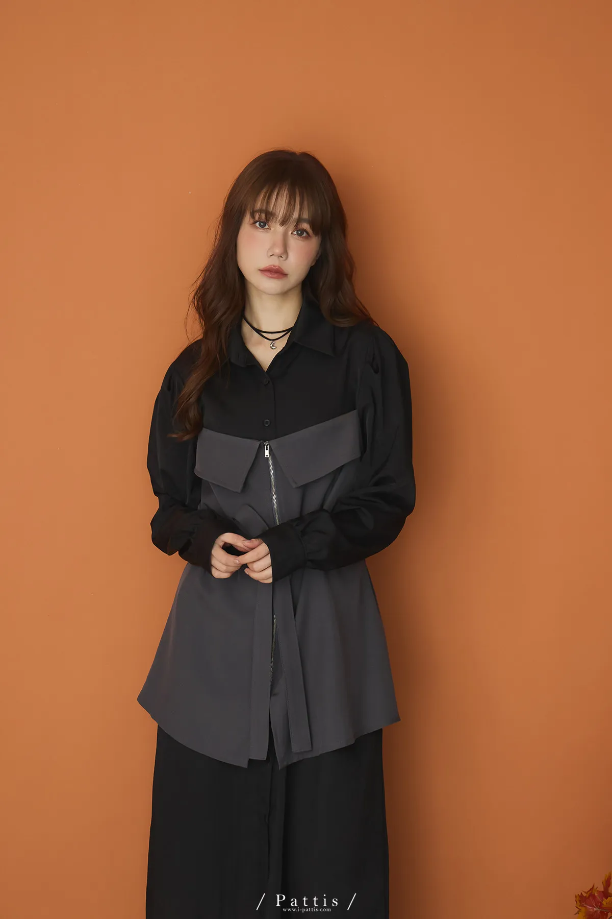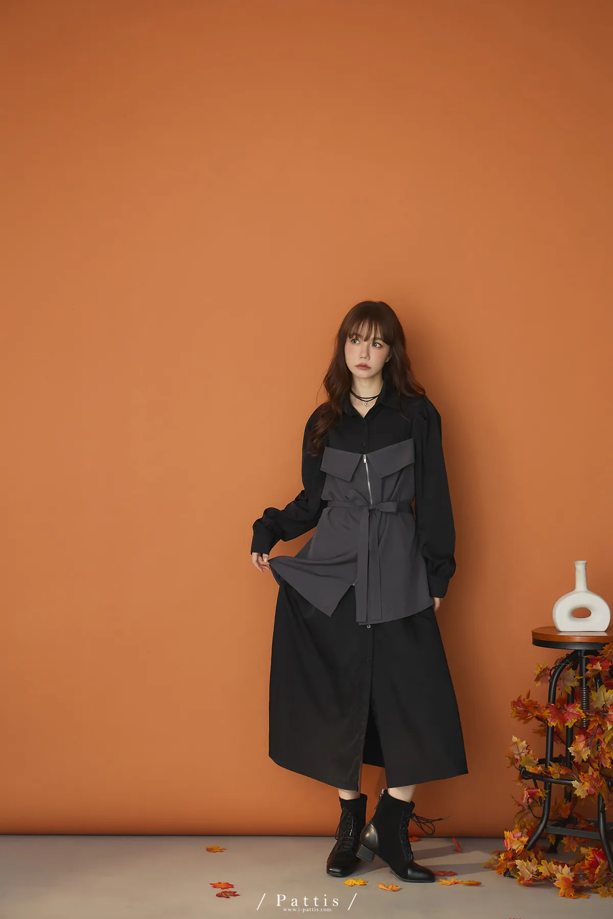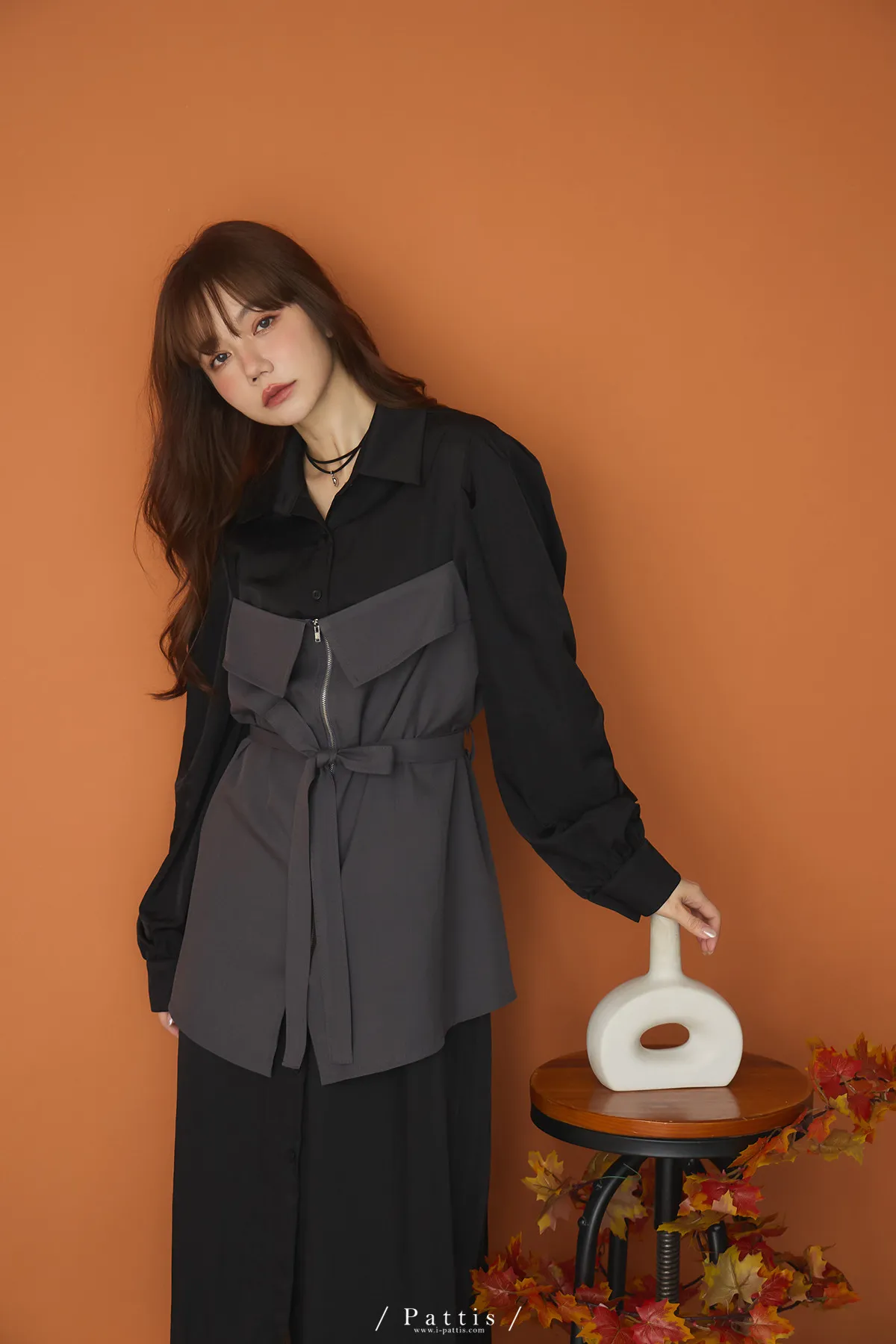 打包那些眷戀給你 | 假兩件翻摺背心繫帶襯衫洋裝(灰黑)