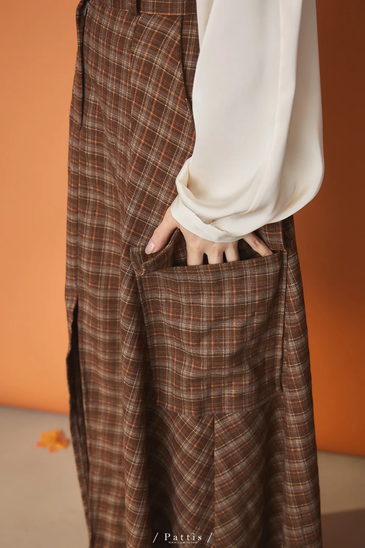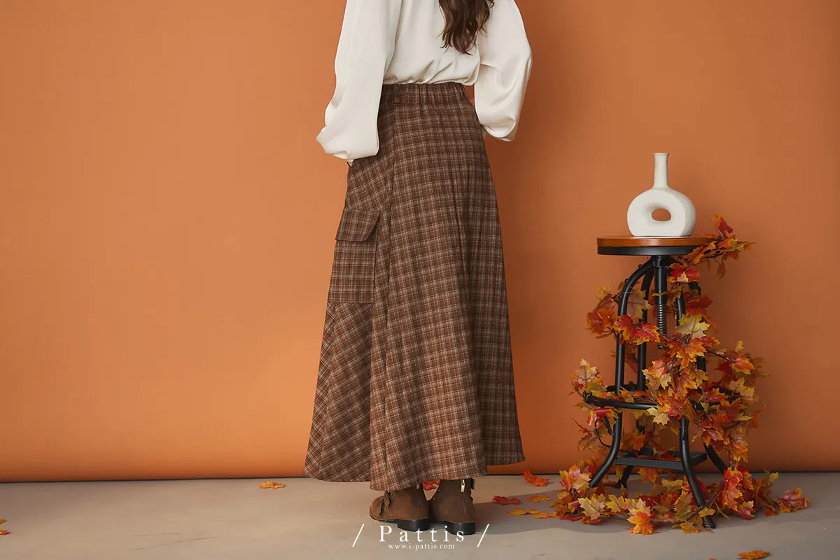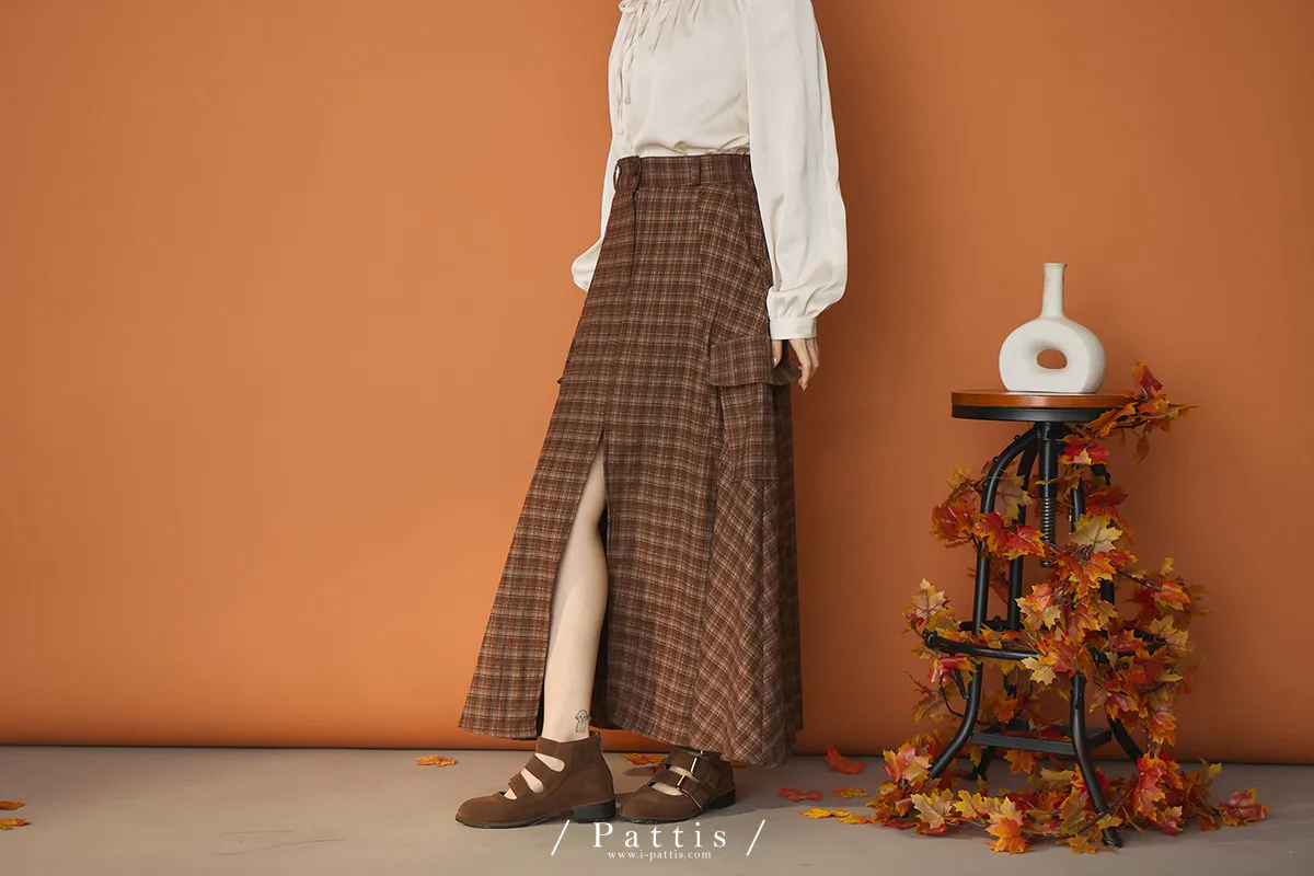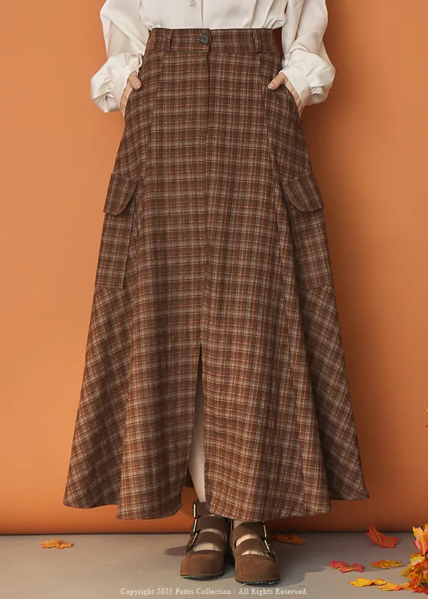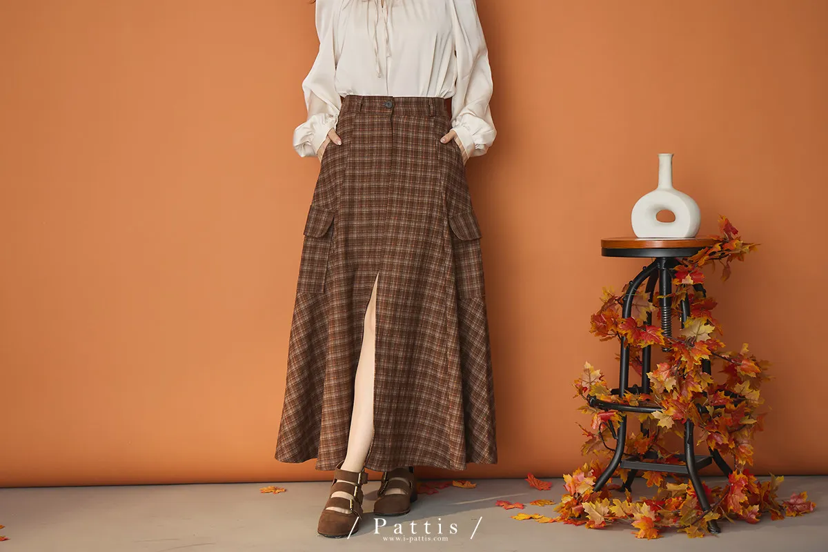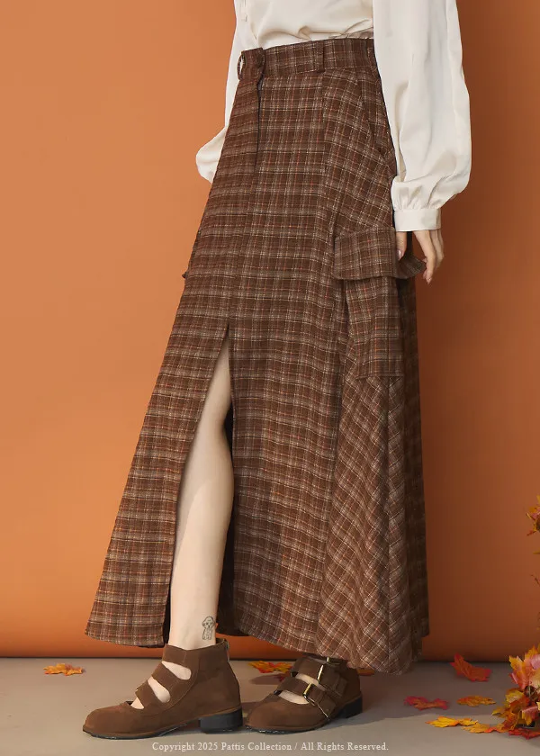 (現貨)自由是靈魂氧氣 | 開叉口袋造型格紋傘裙(咖啡)