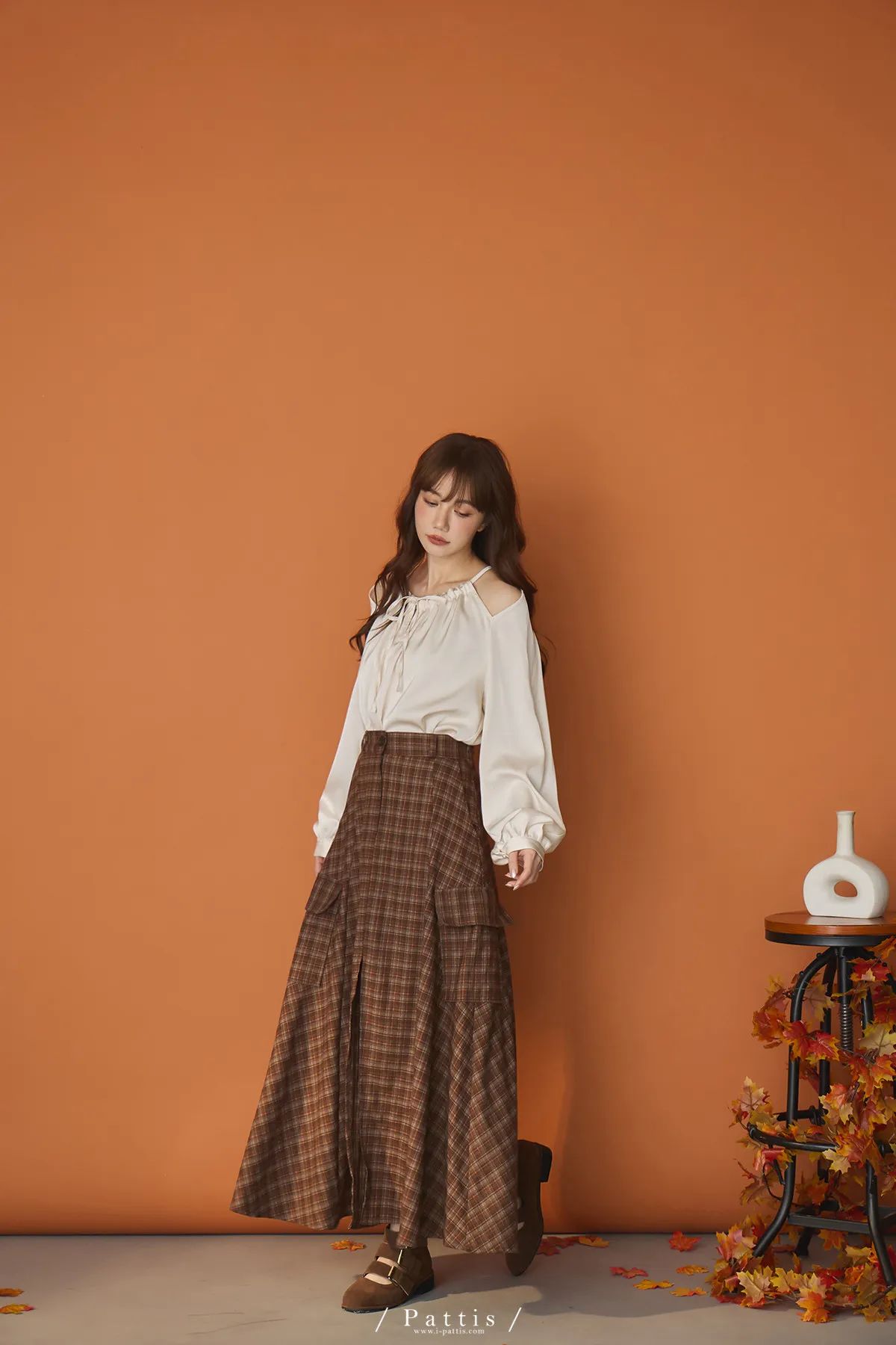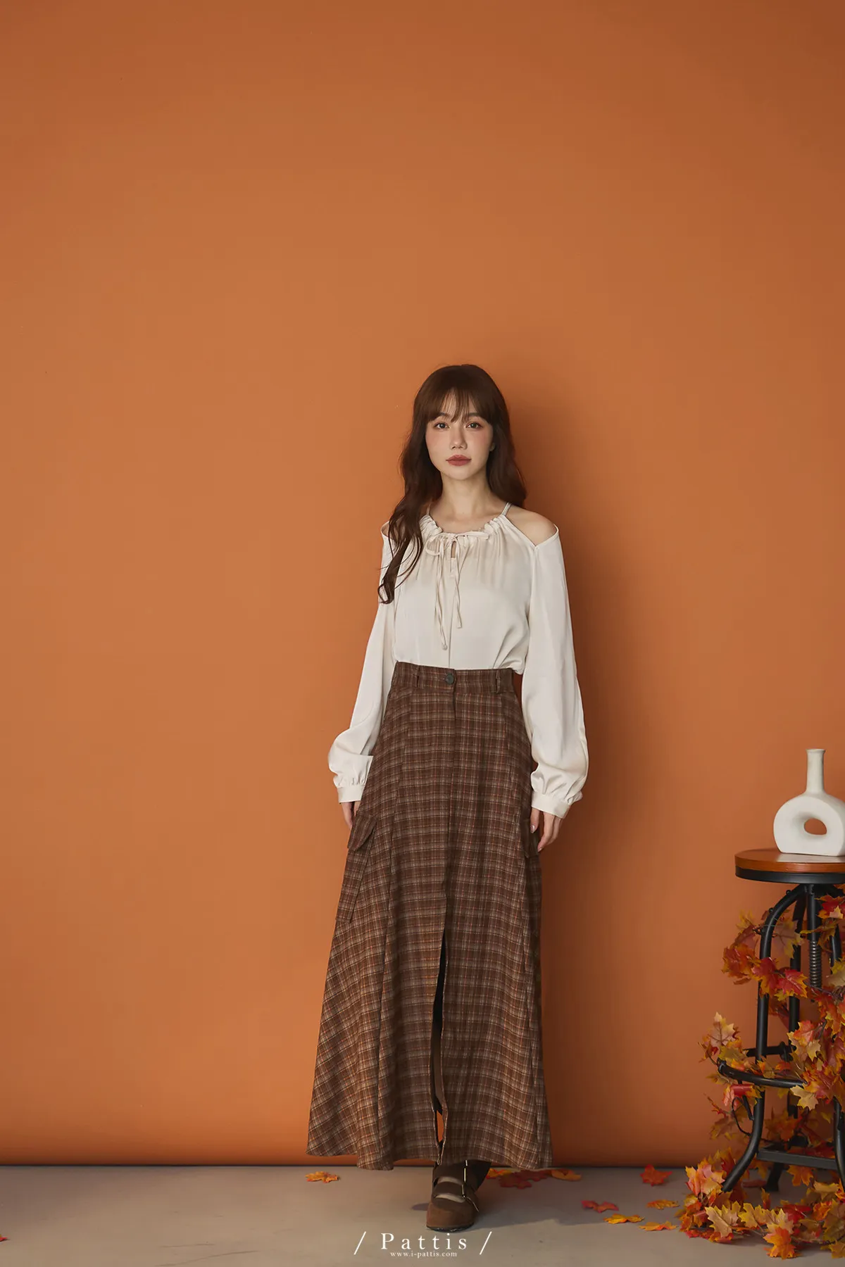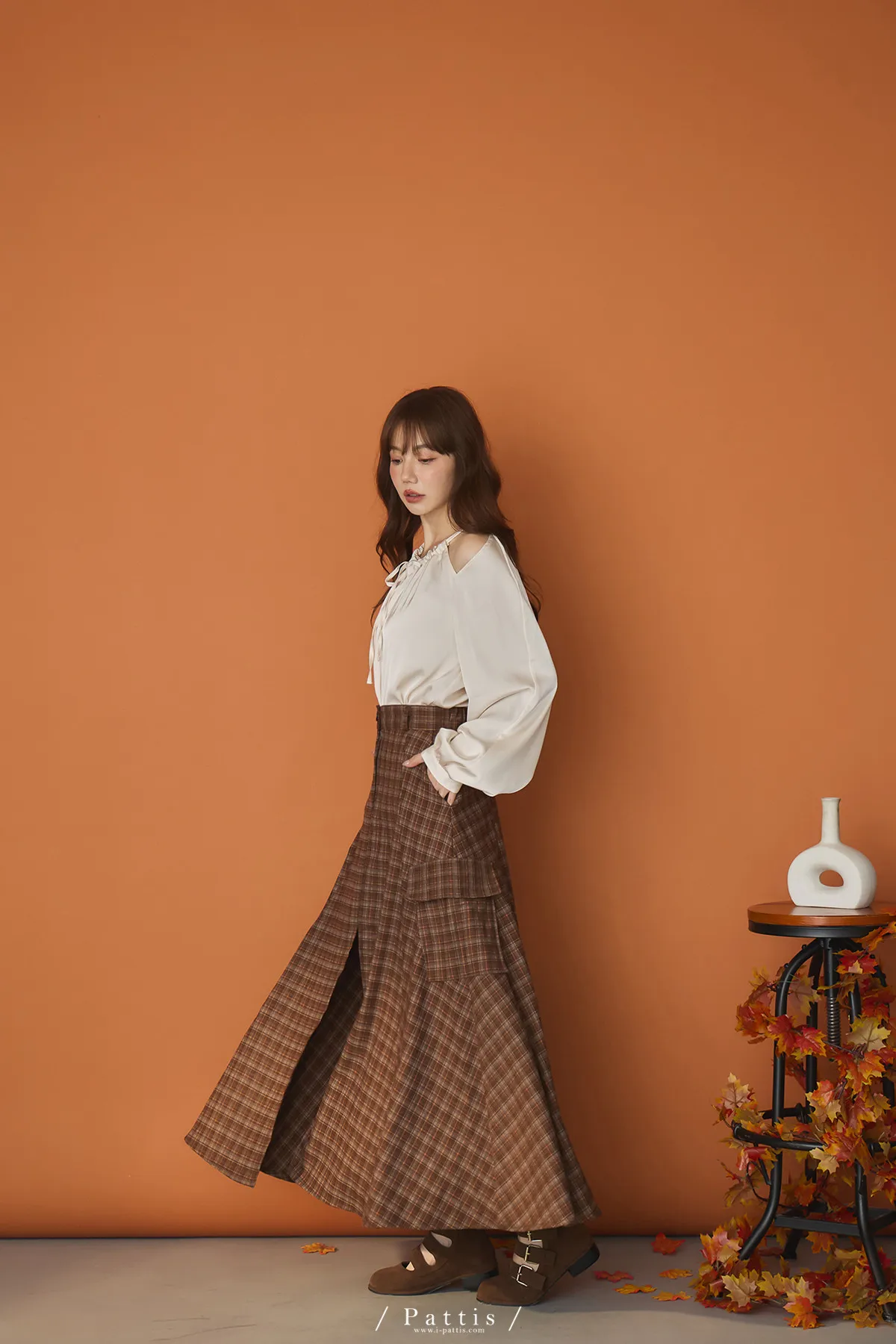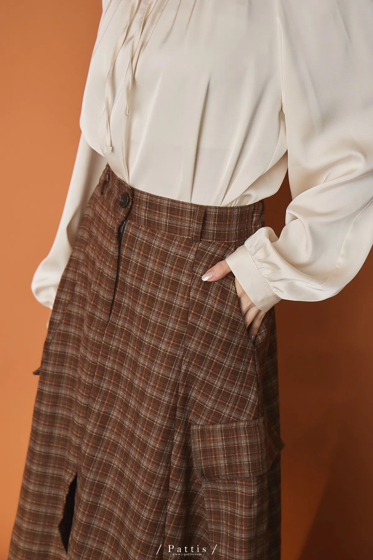 (現貨)自由是靈魂氧氣 | 開叉口袋造型格紋傘裙(咖啡)