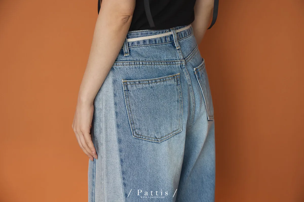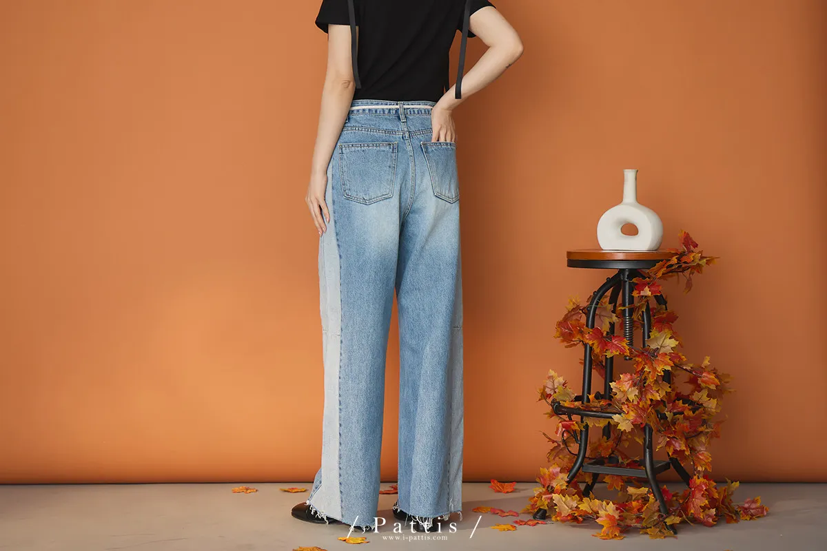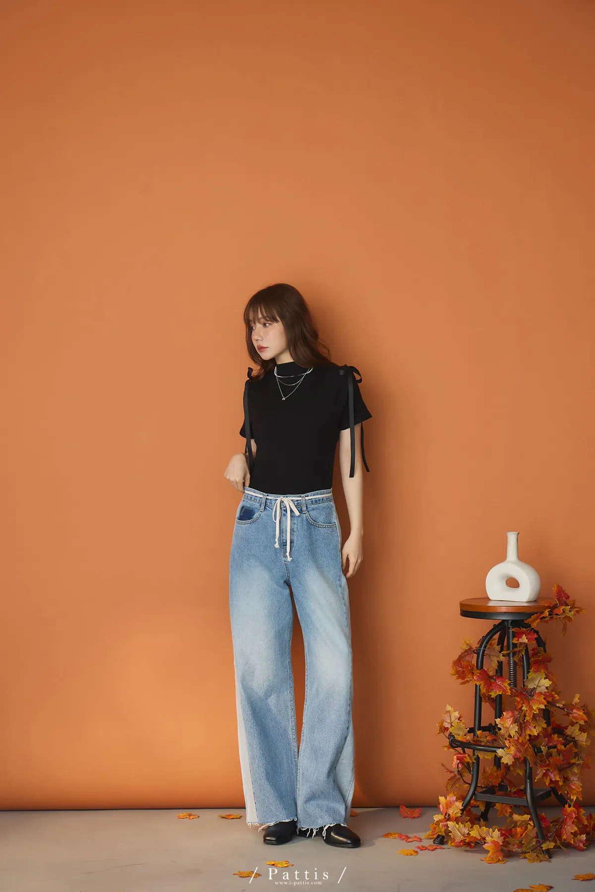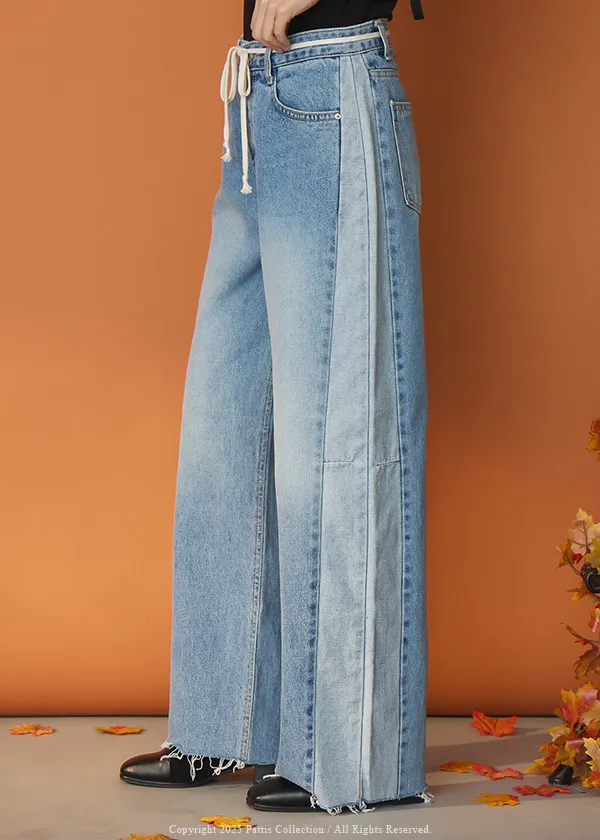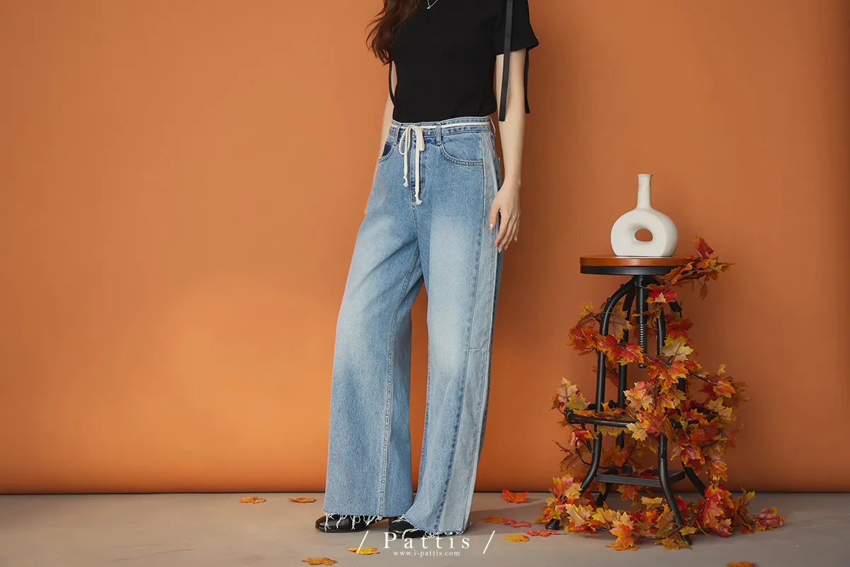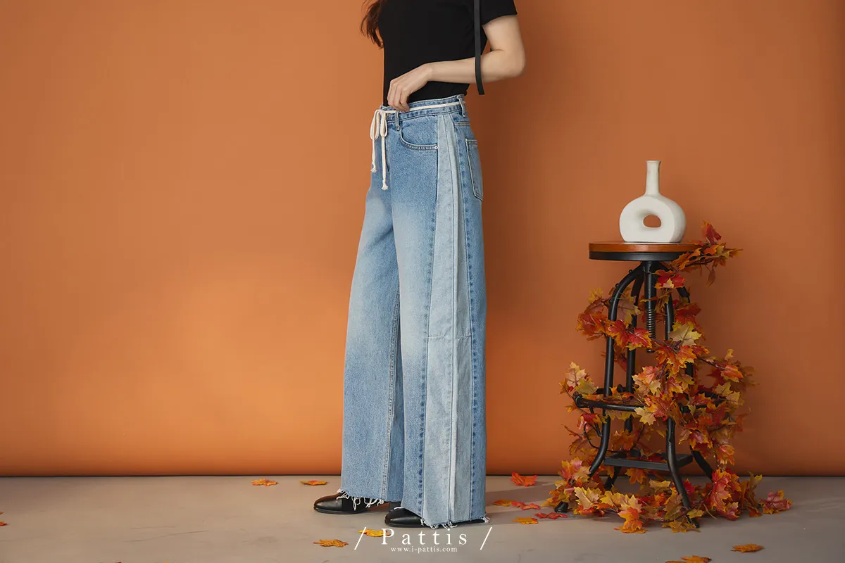 高原效應 | 拼接雙色顯瘦綁帶丹寧寬褲(單一色)